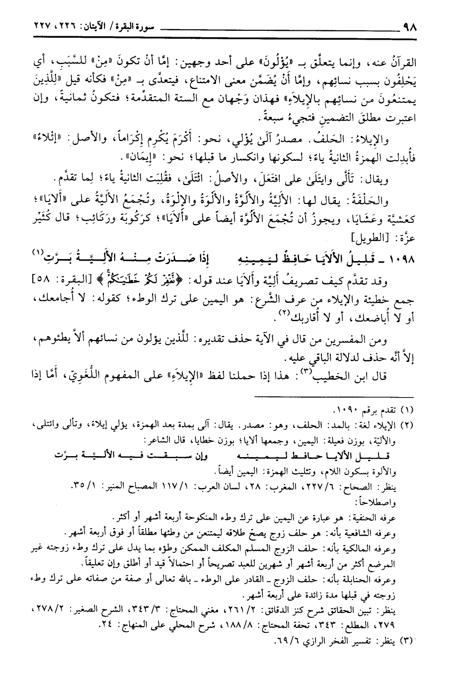 وقد تقدَّم كيف تصريفُ أَلِيَّة وَأَلاَيَا عند قوله: {نَّغْفِرْ لَكُمْ خَطَايَاكُمْ} [البقرة: 58] جمع خطيئة والإيلاء من عرف الشَّرع: هو اليمين على ترك الوطء؛ كقوله: لا أُجامعك، أولا أُباضعك، أو لا أُقاربك.