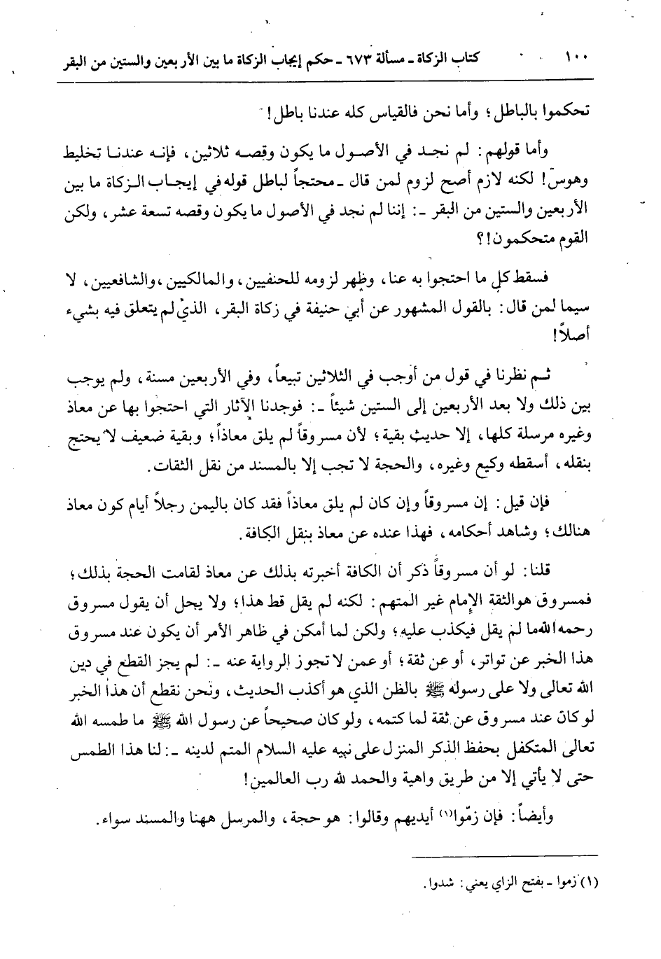 تَحَكَّمُوا بِالْبَاطِلِ؛ وَأَمَّا نَحْنُ فَالْقِيَاسُ كُلُّهُ عِنْدَنَا بَاطِلٌ وَأَمَّا قَوْلُهُمْ: لَمْ نَجِدْ فِي الْأُصُولِ مَا يَكُونُ وَقْصُهُ ثَلَاثِينَ، فَإِنَّهُ عِنْدَنَا تَخْلِيطٌ وَهَوَسٌ لَكِنَّهُ لَازِمٌ أَصَحُّ لُزُومٍ لِمَنْ قَالَ - مُحْتَجًّا لِبَاطِلٍ قَوْلَهُ فِي إيجَابِ الزَّكَاةِ مَا بَيْنَ الْأَرْبَعِينَ وَالسِّتِّينَ مِنْ الْبَقَرِ -: إنَّنَا لَمْ نَجِدْ فِي الْأُصُولِ مَا يَكُونُ وَقْصُهُ تِسْعَةَ عَشَرَ، وَلَكِنَّ الْقَوْمَ مُتَحَكِّمُونَ؟ فَسَقَطَ كُلُّ مَا احْتَجُّوا بِهِ عَنَّا، وَظَهَرَ لُزُومُهُ لِلْحَنَفِيِّينَ، وَالْمَالِكِيِّينَ، وَالشَّافِعِيِّينَ، لَا سِيَّمَا لِمَنْ قَالَ: بِالْقَوْلِ الْمَشْهُورِ عَنْ أَبِي حَنِيفَةَ فِي زَكَاةِ الْبَقَرِ، الَّذِي لَمْ يَتَعَلَّقْ فِيهِ بِشَيْءٍ أَصْلًا ثُمَّ نَظَرْنَا فِي قَوْلِ مَنْ أَوْجَبَ فِي الثَّلَاثِينَ تَبِيعًا، وَفِي الْأَرْبَعِينَ مُسِنَّةً، وَلَمْ يُوجِبْ بَيْنَ ذَلِكَ وَلَا بَعْدَ الْأَرْبَعِينَ إلَى السِّتِّينَ شَيْئًا -: فَوَجَدْنَا الْآثَارَ الَّتِي احْتَجُّوا بِهَا عَنْ مُعَاذٍ وَغَيْرِهِ مُرْسَلَةً كُلَّهَا، إلَّا حَدِيثَ بَقِيَّةَ؛ لِأَنَّ مَسْرُوقًا لَمْ يَلْقَ مُعَاذًا؛ وَبَقِيَّةَ ضَعِيفٌ لَا يُحْتَجُّ بِنَقْلِهِ، أَسْقَطَهُ وَكِيعٌ وَغَيْرُهُ، وَالْحُجَّةُ لَا تَجِبُ إلَّا بِالْمُسْنَدِ مِنْ نَقْلِ الثِّقَاتِ.
