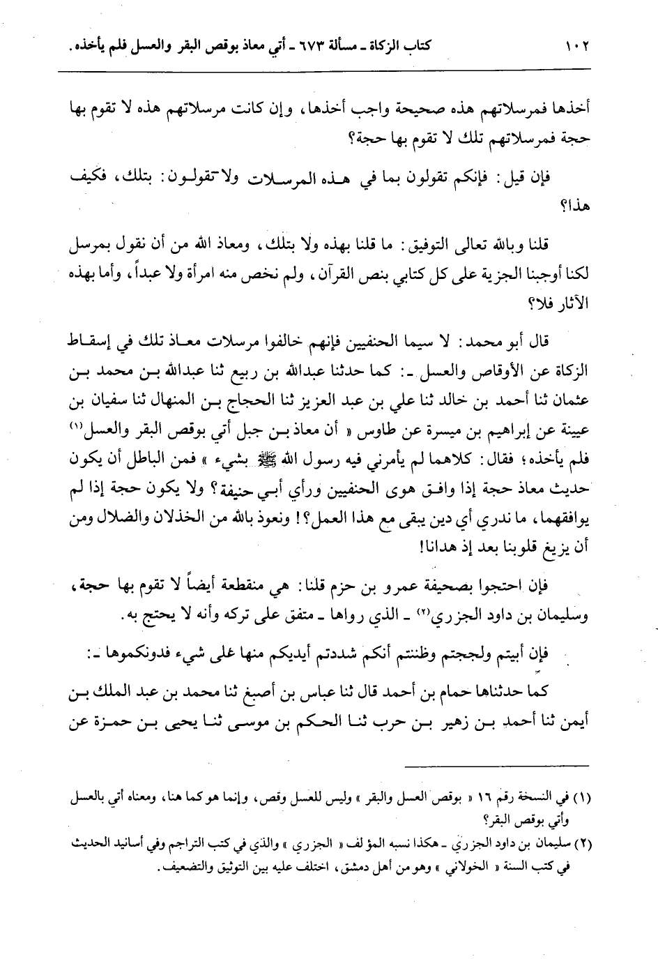 أَخْذُهَا فَمُرْسَلَاتُهُمْ هَذِهِ صَحِيحَةٌ وَاجِبٌ أَخْذُهَا، وَإِنْ كَانَتْ مُرْسَلَاتُهُمْ هَذِهِ لَا تَقُومُ بِهَا حُجَّةٌ فَمُرْسَلَاتُهُمْ تِلْكَ لَا تَقُومُ بِهَا حُجَّةٌ؟ فَإِنْ قِيلَ: فَإِنَّكُمْ تَقُولُونَ بِمَا فِي هَذِهِ الْمُرْسَلَاتِ وَلَا تَقُولُونَ: بِتِلْكَ، فَكَيْف هَذَا؟ قُلْنَا وَبِاَللَّهِ تَعَالَى التَّوْفِيقُ: مَا قُلْنَا بِهَذِهِ وَلَا بِتِلْكَ، وَمَعَاذَ اللَّهِ مِنْ أَنْ نَقُولَ بِمُرْسَلٍ لَكِنَّا أَوْجَبْنَا الْجِزْيَةَ عَلَى كُلِّ كِتَابِيٍّ بِنَصِّ الْقُرْآنِ، وَلَمْ نَخُصَّ مِنْهُ امْرَأَةً وَلَا عَبْدًا، وَأُمًّا بِهَذِهِ الْآثَارِ فَلَا؟ قَالَ أَبُو مُحَمَّدٍ: لَا سِيَّمَا الْحَنَفِيِّينَ فَإِنَّهُمْ خَالَفُوا مُرْسَلَاتِ مُعَاذٍ تِلْكَ فِي إسْقَاطِ الزَّكَاةِ عَنْ الْأَوْقَاصِ وَالْعَسَلِ -: كَمَا حَدَّثَنَا عَبْدُ اللَّهِ بْنُ رَبِيعٍ ثنا عَبْدُ اللَّهِ بْنُ مُحَمَّدِ بْنِ عُثْمَانَ ثنا أَحْمَدُ بْنُ خَالِدٍ ثنا عَلِيُّ بْنُ عَبْدِ الْعَزِيزِ ثنا الْحَجَّاجُ بْنُ الْمِنْهَالِ ثنا سُفْيَانُ بْنُ عُيَيْنَةَ عَنْ إبْرَاهِيمَ بْنِ مَيْسَرَةَ عَنْ طَاوُسٍ «أَنَّ مُعَاذَ بْنَ جَبَلٍ أُتِيَ بِوَقْصِ الْبَقَرِ وَالْعَسَلِ فَلَمْ يَأْخُذْهُ؛ فَقَالَ: كِلَاهُمَا لَمْ يَأْمُرْنِي فِيهِ رَسُولُ اللَّهِ - صَلَّى اللَّهُ عَلَيْهِ وَسَلَّمَ - بِشَيْءٍ» فَمِنْ الْبَاطِلِ أَنْ يَكُونَ حَدِيثُ مُعَاذٍ حُجَّةً إذَا وَافَقَ هَوَى الْحَنَفِيِّينَ وَرَأْيَ أَبِي حَنِيفَةَ؟ وَلَا يَكُونُ حُجَّةً إذَا لَمْ يُوَافِقْهُمَا، مَا نَدْرِي أَيُّ دِينٍ يَبْقَى مَعَ هَذَا الْعَمَلِ؟ وَنَعُوذُ بِاَللَّهِ مِنْ الْخِذْلَانِ وَالضَّلَالِ وَمِنْ أَنْ يُزِيغَ قُلُوبَنَا بَعْدَ إذْ هَدَانَا فَإِنْ احْتَجُّوا بِصَحِيفَةِ عَمْرِو بْنِ حَزْمٍ قُلْنَا: هِيَ مُنْقَطِعَةٌ أَيْضًا لَا تَقُومُ بِهَا حُجَّةٌ، وَسُلَيْمَانُ بْنُ دَاوُد الْجَزَرِيُّ - الَّذِي رَوَاهَا - مُتَّفَقٌ عَلَى تَرْكِهِ وَأَنَّهُ لَا يُحْتَجُّ بِهِ.