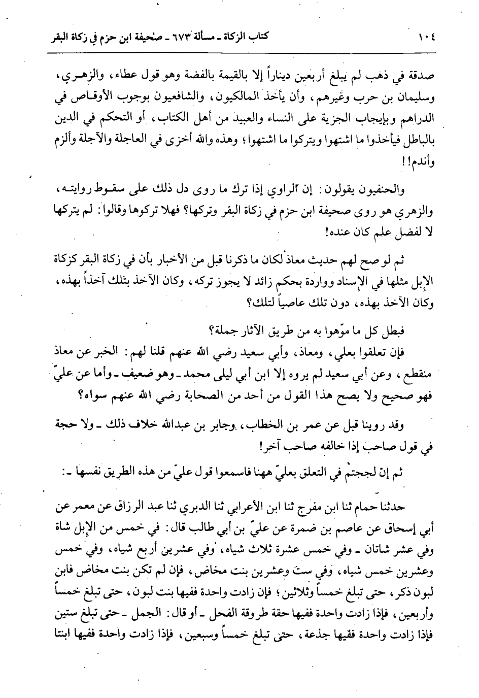 صَدَقَةَ فِي ذَهَبٍ لَمْ يَبْلُغْ أَرْبَعِينَ دِينَارًا إلَّا بِالْقِيمَةِ بِالْفِضَّةِ وَهُوَ قَوْلُ عَطَاءٍ، وَالزُّهْرِيِّ، وَسُلَيْمَانَ بْنِ حَرْبٍ وَغَيْرِهِمْ، وَأَنْ يَأْخُذَ الْمَالِكِيُّونَ، وَالشَّافِعِيُّونَ بِوُجُوبِ الْأَوْقَاصِ فِي الدَّرَاهِمِ وَبِإِيجَابِ الْجِزْيَةِ عَلَى النِّسَاءِ وَالْعَبِيدِ مِنْ أَهْلِ الْكِتَابِ، أَوْ التَّحَكُّمِ فِي الدِّينِ بِالْبَاطِلِ فَيَأْخُذُوا مَا اشْتَهَوْا وَيَتْرُكُوا مَا اشْتَهَوْا؛ وَهَذِهِ وَاَللَّهِ أَخْزَى فِي الْعَاجِلَةِ وَالْآجِلَةِ وَأَلْزَمُ وَأَنْدَمُ،، وَالْحَنَفِيُّونَ يَقُولُونَ: إنَّ الرَّاوِيَ إذَا تَرَكَ مَا رَوَى دَلَّ ذَلِكَ عَلَى سُقُوطِ رِوَايَتِهِ، وَالزُّهْرِيُّ هُوَ رَوَى صَحِيفَةَ ابْنِ حَزْمٍ فِي زَكَاةِ الْبَقَرِ وَتَرَكَهَا؟ فَهَلَّا تَرَكُوهَا وَقَالُوا: لَمْ يَتْرُكْهَا لَا لِفَضْلِ عِلْمٍ كَانَ عِنْدَهُ ثُمَّ لَوْ صَحَّ لَهُمْ حَدِيثُ مُعَاذٍ لَكَانَ مَا ذَكَرْنَا قَبْلُ مِنْ الْأَخْبَارِ بِأَنَّ فِي زَكَاةِ الْبَقَرِ كَزَكَاةِ الْإِبِلِ مِثْلُهَا فِي الْإِسْنَادِ وَوَارِدَةٌ بِحُكْمٍ زَائِدٍ لَا يَجُوزُ تَرْكُهُ، وَكَانَ الْآخِذُ بِتِلْكَ آخِذًا بِهَذِهِ، وَكَانَ الْآخِذُ بِهَذِهِ، دُونَ تِلْكَ عَاصِيًا لِتِلْكَ؟ فَبَطَلَ كُلُّ مَا مَوَّهُوا بِهِ مِنْ طَرِيقِ الْآثَارِ جُمْلَةً؟ فَإِنْ تَعَلَّقُوا بِعَلِيٍّ، وَمُعَاذٍ، وَأَبِي سَعِيدٍ - رَضِيَ اللَّهُ عَنْهُمْ - قُلْنَا لَهُمْ: الْخَبَرُ عَنْ مُعَاذٍ مُنْقَطِعٌ، وَعَنْ أَبِي سَعِيدٍ لَمْ يَرْوِهِ إلَّا ابْنُ أَبِي لَيْلَى مُحَمَّدٌ - وَهُوَ ضَعِيفٌ - وأَمَّا عَنْ عَلِيٍّ فَهُوَ صَحِيحٌ وَلَا يَصِحُّ هَذَا الْقَوْلُ مِنْ أَحَدٍ مِنْ الصَّحَابَةِ - رَضِيَ اللَّهُ عَنْهُمْ - سِوَاهُ؟ وَقَدْ رُوِّينَا قَبْلُ عَنْ عُمَرَ بْنِ الْخَطَّابِ، وَجَابِرِ بْنِ عَبْدِ اللَّهِ خِلَافَ ذَلِكَ - وَلَا حُجَّةَ فِي قَوْلِ صَاحِبٍ إذَا خَالَفَهُ صَاحِبٌ آخَرُ ثُمَّ إنْ لَجَجْتُمْ فِي التَّعَلُّقِ بِعَلِيٍّ هَاهُنَا فَاسْمَعُوا قَوْلَ عَلِيٍّ مِنْ هَذِهِ الطَّرِيقِ نَفْسِهَا -: حَدَّثَنَا حُمَامٌ ثنا ابْنُ مُفَرِّجٍ ثنا ابْنُ الْأَعْرَابِيِّ ثنا الدَّبَرِيُّ ثنا عَبْدُ الرَّزَّاقِ عَنْ مَعْمَرٍ عَنْ أَبِي إِسْحَاقَ عَنْ عَاصِمِ بْنِ ضَمْرَةَ عَنْ عَلِيِّ بْنِ أَبِي طَالِبٍ قَالَ: فِي خَمْسٍ مِنْ الْإِبِلِ شَاةٌ وَفِي عَشْرٍ شَاتَانِ - وَفِي خَمْسَ عَشَرَةَ ثَلَاثُ شِيَاهٍ، وَفِي عِشْرِينَ أَرْبَعُ شِيَاهٍ، وَفِي خَمْسٍ وَعِشْرِينَ خَمْسُ شِيَاهٍ، وَفِي سِتٍّ وَعِشْرِينَ بِنْتُ مَخَاضٍ، فَإِنْ لَمْ تَكُنْ بِنْتُ مَخَاضٍ فَابْنُ لَبُونٍ ذَكَرٌ، حَتَّى تَبْلُغَ خَمْسًا وَثَلَاثِينَ؛ فَإِنْ زَادَتْ وَاحِدَةٌ فَفِيهَا بِنْتُ لَبُونٍ، حَتَّى تَبْلُغَ خَمْسًا وَأَرْبَعِينَ، فَإِذَا زَادَتْ وَاحِدَةٌ فَفِيهَا حِقَّةٌ طَرُوقَةُ الْفَحْلِ - أَوْ قَالَ: الْجَمَلُ - حَتَّى تَبْلُغَ سِتِّينَ فَإِذَا زَادَتْ وَاحِدَةٌ فَفِيهَا جَذَعَةٌ، حَتَّى تَبْلُغَ خَمْسًا وَسَبْعِينَ، فَإِذَا زَادَتْ وَاحِدَةٌ فَفِيهَا ابْنَتَا