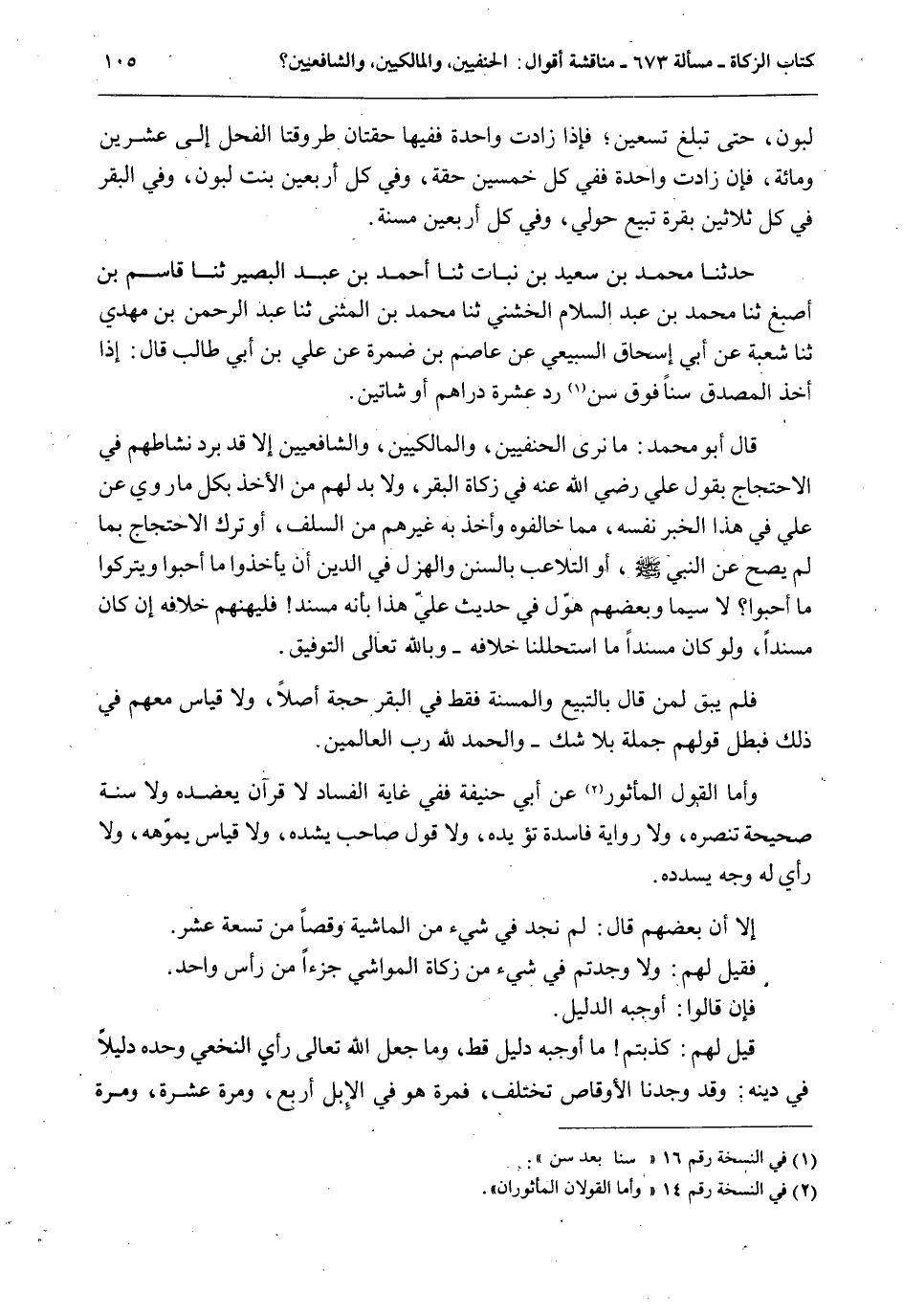 قَالَ أَبُو مُحَمَّدٍ: مَا نَرَى الْحَنَفِيِّينَ، وَالْمَالِكِيِّينَ، وَالشَّافِعِيِّينَ إلَّا قَدْ بَرُدَ نَشَاطُهُمْ فِي الِاحْتِجَاجِ بِقَوْلِ عَلِيٍّ - رَضِيَ اللَّهُ عَنْهُ - فِي زَكَاةِ الْبَقَرِ، وَلَا بُدَّ لَهُمْ مِنْ الْأَخْذِ بِكُلِّ مَا رُوِيَ عَنْ عَلِيٍّ فِي هَذَا الْخَبَرِ نَفْسِهِ، مِمَّا خَالَفُوهُ وَأَخَذَ بِهِ غَيْرُهُمْ مِنْ السَّلَفِ، أَوْ تَرْكِ الِاحْتِجَاجَ بِمَا لَمْ يَصِحَّ عَنْ النَّبِيِّ - صَلَّى اللَّهُ عَلَيْهِ وَسَلَّمَ - أَوْ التَّلَاعُبِ بِالسُّنَنِ وَالْهَزْلِ فِي الدِّينِ أَنْ يَأْخُذُوا مَا أَحَبُّوا وَيَتْرُكُوا مَا أَحَبُّوا؟ لَا سِيَّمَا وَبَعْضُهُمْ هَوَّلَ فِي حَدِيثِ عَلِيٍّ هَذَا بِأَنَّهُ مُسْنَدٌ فَلْيَهِنْهُمْ خِلَافُهُ إنْ كَانَ مُسْنَدًا، وَلَوْ كَانَ مُسْنَدًا مَا اسْتَحْلَلْنَا خِلَافَهُ - وَبِاَللَّهِ تَعَالَى التَّوْفِيقُ.
