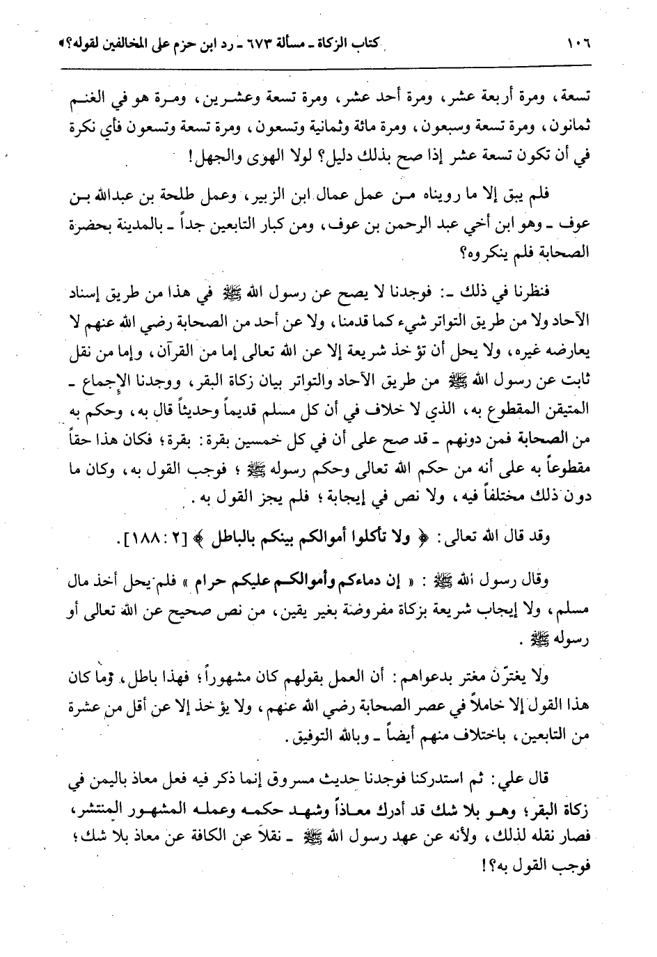 وَقَالَ رَسُولُ اللَّهِ - صَلَّى اللَّهُ عَلَيْهِ وَسَلَّمَ -: «إنَّ دِمَاءَكُمْ وَأَمْوَالَكُمْ عَلَيْكُمْ حَرَامٌ» فَلَمْ يَحِلَّ، أَخْذُ مَالِ مُسْلِمٍ، وَلَا إيجَابُ شَرِيعَةٍ بِزَكَاةٍ مَفْرُوضَةٍ بِغَيْرِ يَقِينٍ، مِنْ نَصٍّ صَحِيحٍ عَنْ اللَّهِ تَعَالَى أَوْ رَسُولِهِ - صَلَّى اللَّهُ عَلَيْهِ وَسَلَّمَ -.
