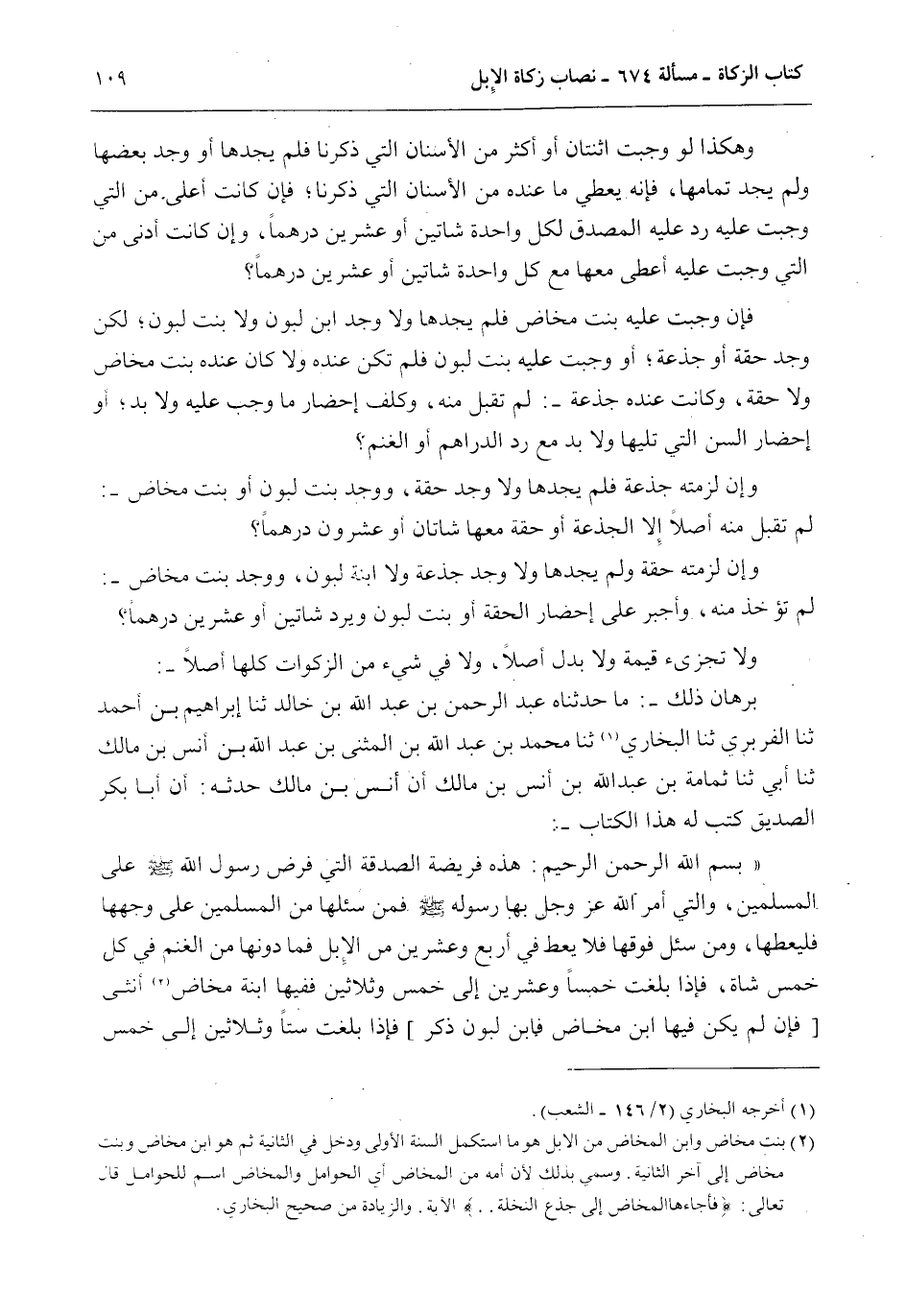 وَهَكَذَا لَوْ وَجَبَتْ اثْنَتَانِ أَوْ أَكْثَرُ مِنْ الْأَسْنَانِ الَّتِي ذَكَرْنَا فَلَمْ يَجِدْهَا أَوْ وَجَدَ بَعْضَهَا وَلَمْ يَجِدْ تَمَامَهَا، فَإِنَّهُ يُعْطِي مَا عِنْدَهُ مِنْ الْأَسْنَانِ الَّتِي ذَكَرْنَا؛ فَإِنْ كَانَتْ أَعْلَى مِنْ الَّتِي وَجَبَتْ عَلَيْهِ رَدَّ عَلَيْهِ الْمُصَدِّقُ لِكُلِّ وَاحِدَةٍ شَاتَيْنِ أَوْ عِشْرِينَ دِرْهَمًا، وَإِنْ كَانَتْ أَدْنَى مِنْ الَّتِي وَجَبَتْ عَلَيْهِ أَعْطَى مَعَهَا مَعَ كُلِّ وَاحِدَةٍ شَاتَيْنِ أَوْ عِشْرِينَ دِرْهَمًا؟ فَإِنْ وَجَبَتْ عَلَيْهِ بِنْتُ مَخَاضٍ فَلَمْ يَجِدْهَا وَلَا وَجَدَ ابْنَ لَبُونٍ وَلَا بِنْتَ لَبُونٍ؛ لَكِنْ وَجَدَ حِقَّةً أَوْ جَذَعَةً؛ أَوْ وَجَبَتْ عَلَيْهِ بِنْتُ لَبُونٍ فَلَمْ تَكُنْ عِنْدَهُ وَلَا كَانَ عِنْدَهُ بِنْتُ مَخَاضٍ وَلَا حِقَّةٌ، وَكَانَتْ عِنْدَهُ جَذَعَةٌ - لَمْ تُقْبَلْ مِنْهُ، وَكُلِّفَ إحْضَارَ مَا وَجَبَ عَلَيْهِ وَلَا بُدَّ؛ أَوْ إحْضَارَ السِّنِّ الَّتِي تَلِيهَا وَلَا بُدَّ مَعَ رَدِّ الدَّرَاهِمِ أَوْ الْغَنَمِ؟ وَإِنْ لَزِمَتْهُ جَذَعَةٌ فَلَمْ يَجِدْهَا وَلَا وَجَدَ حِقَّةً، وَوَجَدَ بِنْتَ لَبُونٍ أَوْ بِنْتَ مَخَاضٍ -: لَمْ تُقْبَلْ مِنْهُ أَصْلًا إلَّا الْجَذَعَةُ أَوْ حِقَّةٌ مَعَهَا شَاتَانِ أَوْ عِشْرُونَ دِرْهَمًا؟ وَإِنْ لَزِمَتْهُ حِقَّةٌ وَلَمْ يَجِدْهَا وَلَا وَجَدَ جَذَعَةً وَلَا ابْنَةَ لَبُونٍ، وَوَجَدَ بِنْتَ مَخَاضٍ -: لَمْ تُؤْخَذْ مِنْهُ، وَأُجْبِرَ عَلَى إحْضَارِ الْحِقَّةِ أَوْ بِنْتِ لَبُونٍ وَيَرُدُّ شَاتَيْنِ أَوْ عِشْرِينَ دِرْهَمًا؟ وَلَا تُجْزِئُ قِيمَةٌ وَلَا بَدَلٌ أَصْلًا، وَلَا فِي شَيْءٍ مِنْ الزَّكَوَاتِ كُلِّهَا أَصْلًا -: بُرْهَانُ ذَلِكَ -: مَا حَدَّثَنَاهُ عَبْدُ الرَّحْمَنِ بْنُ عَبْدِ اللَّهِ بْنِ خَالِدٍ ثنا إبْرَاهِيمُ بْنُ أَحْمَدَ ثنا الْفَرَبْرِيُّ ثنا الْبُخَارِيُّ ثنا مُحَمَّدُ بْنُ عَبْدِ اللَّهِ بْنِ الْمُثَنَّى بْنِ عَبْدِ اللَّهِ بْنِ أَنَسِ بْنِ مَالِكٍ ثنا أَبِي ثنا ثُمَامَةُ بْنُ عَبْدِ اللَّهِ بْنِ أَنَسِ بْنِ مَالِكٍ أَنَّ أَنَسَ بْنَ مَالِكٍ حَدَّثَهُ: أَنَّ أَبَا بَكْرٍ الصِّدِّيقَ كَتَبَ لَهُ هَذَا الْكِتَابَ -: «بِسْمِ اللَّهِ الرَّحْمَنِ الرَّحِيمِ: هَذِهِ فَرِيضَةُ الصَّدَقَةِ الَّتِي فَرَضَ رَسُولُ اللَّهِ - صَلَّى اللَّهُ عَلَيْهِ وَسَلَّمَ - عَلَى الْمُسْلِمِينَ، وَاَلَّتِي أَمَرَ اللَّهُ - عَزَّ وَجَلَّ - بِهَا رَسُولَهُ - صَلَّى اللَّهُ عَلَيْهِ وَسَلَّمَ - فَمَنْ سُئِلَهَا مِنْ الْمُسْلِمِينَ عَلَى وَجْهِهَا فَلْيُعْطِهَا، وَمَنْ سُئِلَ فَوْقَهَا فَلَا يُعْطِ. فِي أَرْبَعٍ وَعِشْرِينَ مِنْ الْإِبِلِ فَمَا دُونَهَا مِنْ الْغَنَمِ فِي كُلِّ خَمْسٍ شَاةٌ، فَإِذَا بَلَغَتْ خَمْسًا وَعِشْرِينَ إلَى خَمْسٍ وَثَلَاثِينَ فَفِيهَا ابْنَةُ مَخَاضٍ أُنْثَى فَإِنْ لَمْ يَكُنْ فِيهَا ابْنُ مَخَاضٍ فَابْنُ لَبُونٍ ذَكَرٌ فَإِذَا بَلَغَتْ سِتًّا وَثَلَاثِينَ إلَى خَمْسٍ