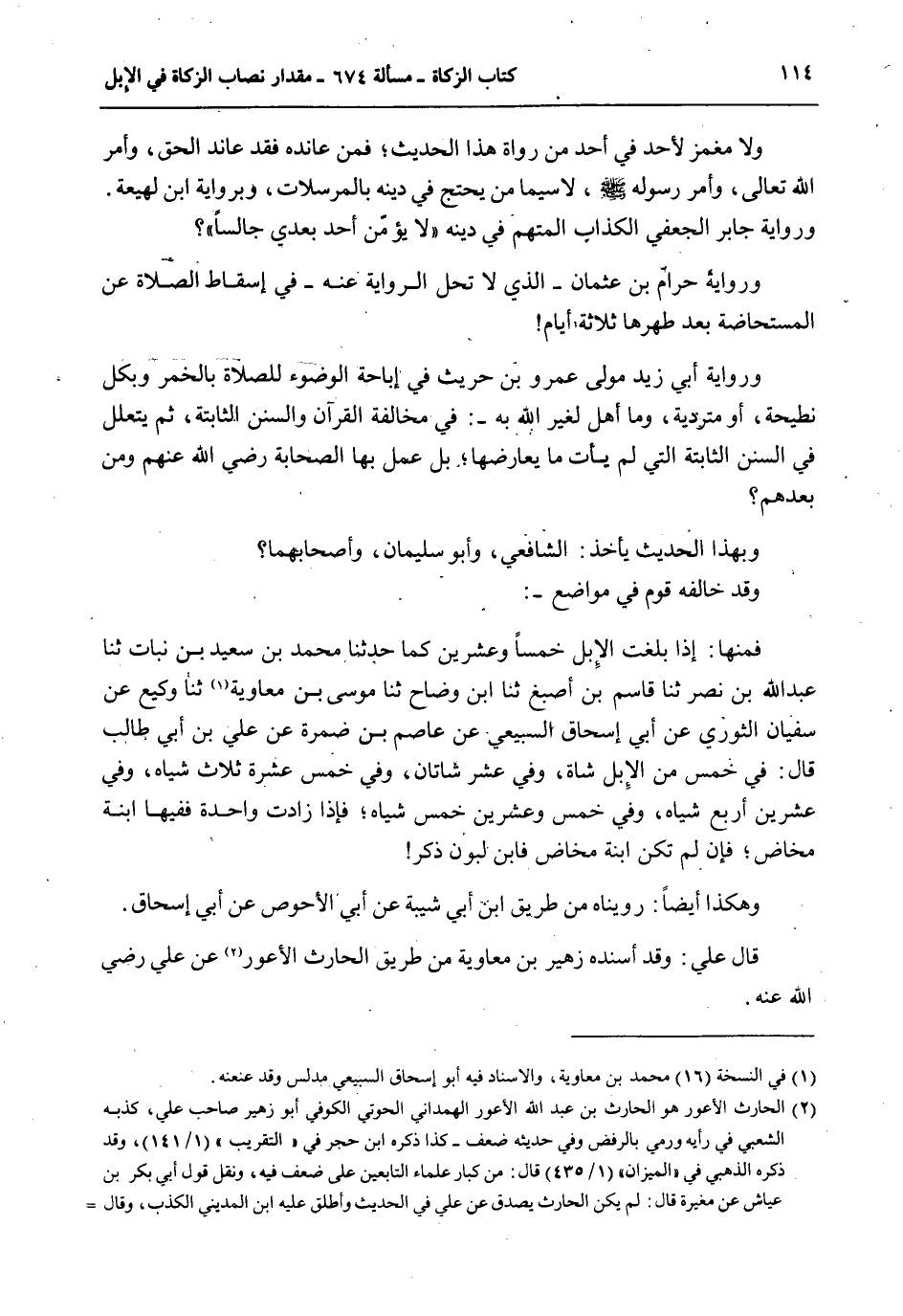 وَلَا مَغْمَزَ لِأَحَدٍ فِي أَحَدٍ مِنْ رُوَاةِ هَذَا الْحَدِيثِ؛ فَمَنْ عَانَدَهُ فَقَدْ عَانَدَ الْحَقَّ، وَأَمْرَ اللَّهِ تَعَالَى، وَأَمْرَ رَسُولِهِ - صَلَّى اللَّهُ عَلَيْهِ وَسَلَّمَ - لَا سِيَّمَا مَنْ يُحْتَجُّ فِي دِينِهِ بِالْمُرْسَلَاتِ، وَبِرِوَايَةِ ابْنِ لَهِيعَةَ. وَرِوَايَةِ جَابِرٍ الْجُعْفِيِّ الْكَذَّابِ الْمُتَّهَمِ فِي دِينِهِ " لَا يَؤُمَّنَّ أَحَدٌ بَعْدِي جَالِسًا "؟ وَرِوَايَةِ حَرَامِ بْنِ عُثْمَانَ - الَّذِي لَا تَحِلُّ الرِّوَايَةُ عَنْهُ - فِي إسْقَاطِ الصَّلَاةِ عَنْ الْمُسْتَحَاضَةِ بَعْدَ طُهْرِهَا ثَلَاثَةَ أَيَّامٍ وَرِوَايَةِ أَبِي زَيْدٍ مَوْلَى عَمْرِو بْنِ حَدِيثٍ فِي إبَاحَةِ الْوُضُوءِ لِلصَّلَاةِ بِالْخَمْرِ وَبِكُلِّ نَطِيحَةٍ، أَوْ مُتَرَدِّيَةٍ، وَمَا أُهِلَّ لِغَيْرِ اللَّهِ بِهِ -: فِي مُخَالَفَةِ الْقُرْآنِ وَالسُّنَنِ الثَّابِتَةِ، ثُمَّ يَتَعَلَّلُ فِي السُّنَنِ الثَّابِتَةِ الَّتِي لَمْ يَأْتِ مَا يُعَارِضُهَا؛ بَلْ عَمِلَ بِهَا الصَّحَابَةُ - رَضِيَ اللَّهُ عَنْهُمْ - وَمَنْ بَعْدَهُمْ؟ وَبِهَذَا الْحَدِيثِ يَأْخُذُ: الشَّافِعِيُّ، وَأَبُو سُلَيْمَانَ، وَأَصْحَابُهُمَا؟ وَقَدْ خَالَفَهُ قَوْمٌ فِي مَوَاضِعَ -: فَمِنْهَا: إذَا بَلَغَتْ الْإِبِلُ خَمْسًا وَعِشْرِينَ كَمَا حَدَّثَنَا مُحَمَّدُ بْنُ سَعِيدِ بْنِ نَبَاتٍ ثنا عَبْدُ اللَّهِ بْنُ نَصْرٍ ثنا قَاسِمُ بْنُ أَصْبَغَ ثنا ابْنُ وَضَّاحٍ ثنا مُوسَى بْنُ مُعَاوِيَةَ ثنا وَكِيعٌ عَنْ سُفْيَانَ الثَّوْرِيِّ عَنْ أَبِي إِسْحَاقَ السَّبِيعِيِّ عَنْ عَاصِمِ بْنِ ضَمْرَةَ عَنْ عَلِيِّ بْنِ أَبِي طَالِبٍ قَالَ: فِي خَمْسٍ مِنْ الْإِبِلِ شَاةٌ، وَفِي عَشْرٍ شَاتَانِ، وَفِي خَمْسَ عَشْرَةَ ثَلَاثُ شِيَاهٍ، وَفِي عِشْرِينَ أَرْبَعُ شِيَاهٍ، وَفِي خَمْسٍ وَعِشْرِينَ خَمْسُ شِيَاهٍ؛ فَإِذَا زَادَتْ وَاحِدَةً فَفِيهَا ابْنَةُ مَخَاضٍ؛ فَإِنْ لَمْ تَكُنْ ابْنَةُ مَخَاضٍ فَابْنُ لَبُونٍ ذَكَرٌ وَهَكَذَا أَيْضًا: رُوِّينَاهُ مِنْ طَرِيقِ ابْنِ أَبِي شَيْبَةَ عَنْ أَبِي الْأَحْوَصِ عَنْ أَبِي إِسْحَاقَ. قَالَ عَلِيٌّ: وَقَدْ أَسْنَدَهُ زُهَيْرُ بْنُ مُعَاوِيَةَ مِنْ طَرِيقِ الْحَارِثِ الْأَعْوَرِ عَنْ عَلِيٍّ - رَضِيَ اللَّهُ عَنْهُ -.
