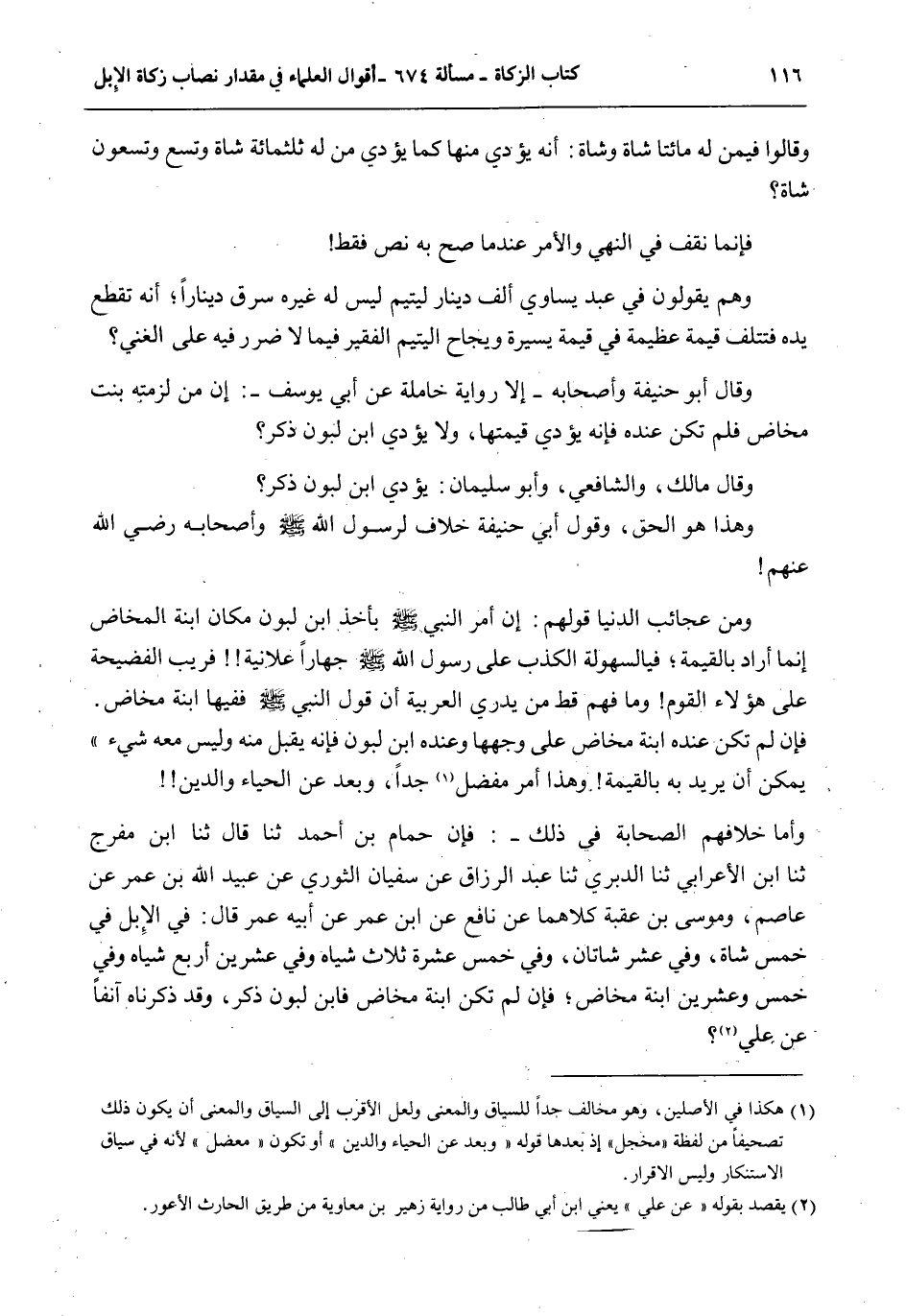 فَإِنْ لَمْ تَكُنْ عِنْدَهُ ابْنَةُ مَخَاضٍ عَلَى وَجْهِهَا وَعِنْدَهُ ابْنُ لَبُونٍ فَإِنَّهُ يُقْبَلُ مِنْهُ وَلَيْسَ شَيْءٌ " يُمْكِنُ أَنْ يُرِيدَ بِهِ بِالْقِيمَةِ وَهَذَا أَمْرٌ مُخْجِلٌ جِدًّا، وَبُعْدٌ عَنْ الْحَيَاءِ وَالدِّينِ وَأَمَّا خِلَافُهُمْ الصَّحَابَةَ فِي ذَلِكَ -: فَإِنَّ حُمَامَ بْنَ أَحْمَدَ ثنا قَالَ ثنا ابْنُ مُفَرِّجٍ ثنا ابْنُ الْأَعْرَابِيِّ ثنا الدَّبَرِيُّ ثنا عَبْدُ الرَّزَّاقِ عَنْ سُفْيَانَ الثَّوْرِيِّ عَنْ عُبَيْدِ اللَّهِ بْنِ عُمَرَ عَنْ عَاصِمٍ، وَمُوسَى بْنُ عُقْبَةَ كِلَاهُمَا عَنْ نَافِعٍ عَنْ ابْنِ عُمَرَ عَنْ أَبِيهِ عُمَرَ قَالَ: فِي الْإِبِلِ فِي خَمْسٍ شَاةٌ، وَفِي عَشْرٍ شَاتَانِ، وَفِي خَمْسَ عَشَرَةَ ثَلَاثُ شِيَاهٍ وَفِي عِشْرِينَ أَرْبَعُ شِيَاهٍ وَفِي خَمْسٍ وَعِشْرِينَ ابْنَةُ مَخَاضٍ؛ فَإِنْ لَمْ تَكُنْ ابْنَةُ مَخَاضٍ فَابْنُ لَبُونٍ ذَكَرٌ، وَقَدْ ذَكَرْنَاهُ آنِفًا عَنْ عَلِيٍّ؟