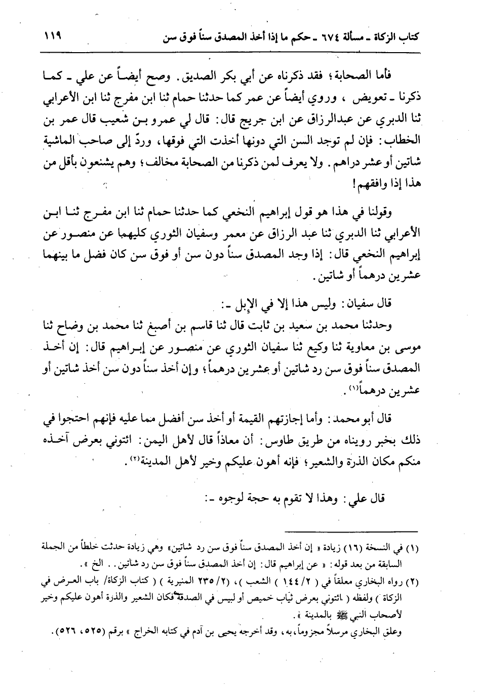 قَالَ سُفْيَانُ: وَلَيْسَ هَذَا إلَّا فِي الْإِبِلِ -: وَحَدَّثَنَا مُحَمَّدُ بْنُ سَعِيدِ بْنِ ثَابِتٍ قَالَ ثنا قَاسِمُ بْنُ أَصْبَغَ ثنا مُحَمَّدُ بْنُ وَضَّاحٍ ثنا مُوسَى بْنُ مُعَاوِيَةَ ثنا وَكِيعٌ ثنا سُفْيَانُ الثَّوْرِيُّ عَنْ مَنْصُورٍ عَنْ إبْرَاهِيمَ قَالَ: إنْ أَخَذَ الْمُصَدِّقُ سِنًّا فَوْقَ سِنٍّ رَدَّ شَاتَيْنِ أَوْ عِشْرِينَ دِرْهَمًا؛ وَإِنْ أَخَذَ سِنًّا دُونَ سِنٍّ أَخَذَ شَاتَيْنِ أَوْ عِشْرِينَ دِرْهَمًا.