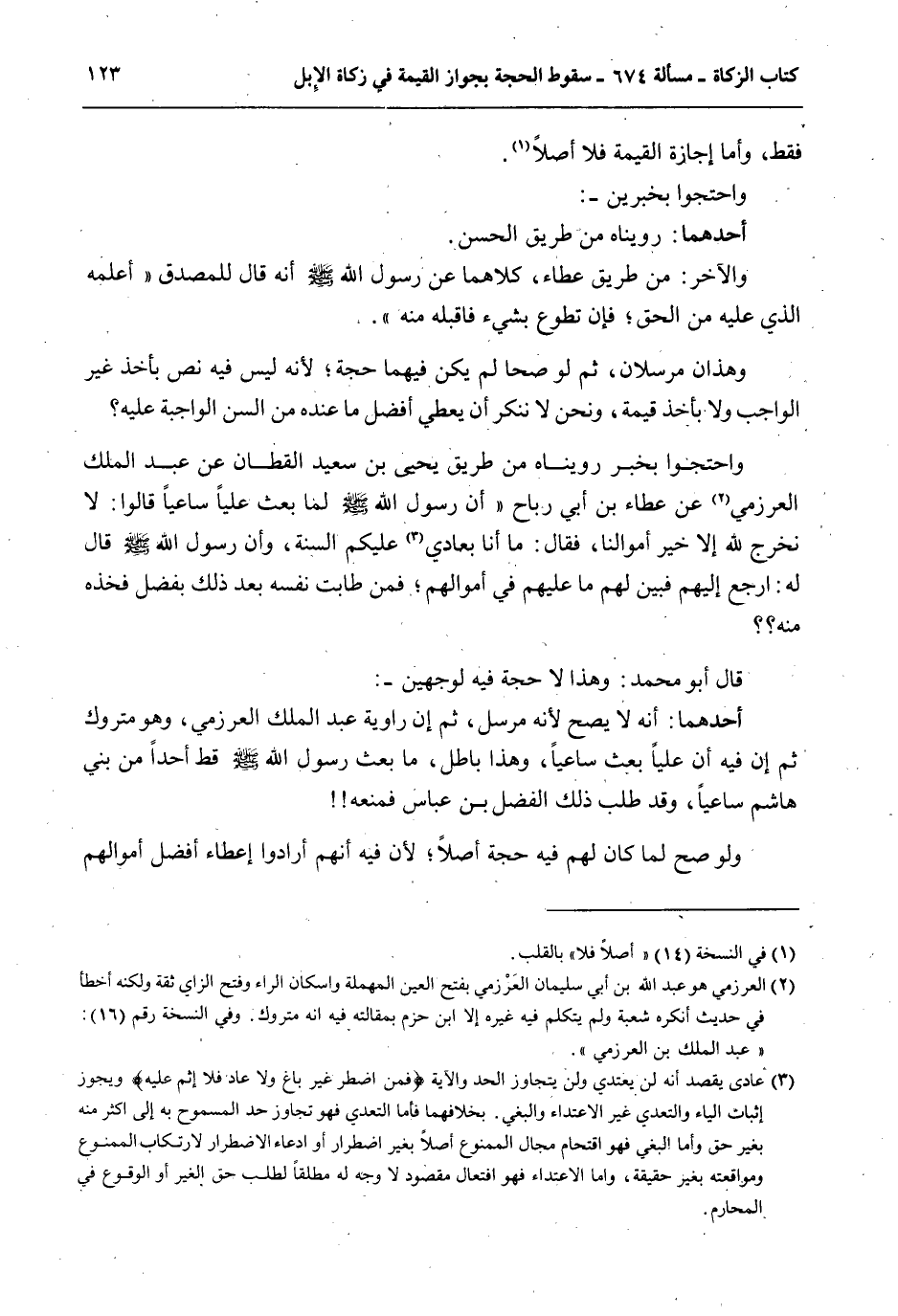 وَالْآخَرُ: مِنْ طَرِيقِ عَطَاءٍ، كِلَاهُمَا «عَنْ رَسُولِ اللَّهِ - صَلَّى اللَّهُ عَلَيْهِ وَسَلَّمَ - أَنَّهُ قَالَ لِلْمُصَدِّقِ أَعْلِمْهُ الَّذِي عَلَيْهِ مِنْ الْحَقِّ؛ فَإِنْ تَطَوَّعَ بِشَيْءٍ فَاقْبَلْهُ مِنْهُ» . وَهَذَانِ مُرْسَلَانِ، ثُمَّ لَوْ صَحَّا لَمْ يَكُنْ فِيهِمَا حُجَّةٌ؛ لِأَنَّهُ لَيْسَ فِيهِ نَصٌّ بِأَخْذِ غَيْرِ الْوَاجِبِ وَلَا يَأْخُذُ قِيمَةً، وَنَحْنُ لَا نُنْكِرُ أَنْ يُعْطِيَ أَفْضَلَ مَا عِنْدَهُ مِنْ السِّنِّ الْوَاجِبَةِ عَلَيْهِ؟ وَاحْتَجُّوا بِخَبَرٍ رُوِّينَاهُ مِنْ طَرِيقِ يَحْيَى بْنِ سَعِيدِ الْقَطَّانِ عَنْ عَبْدِ الْمَلِكِ العرزمي عَنْ عَطَاءِ بْنِ أَبِي رَبَاحٍ «أَنَّ رَسُولَ اللَّهِ - صَلَّى اللَّهُ عَلَيْهِ وَسَلَّمَ - لَمَّا بَعَثَ عَلِيًّا سَاعِيًا قَالُوا: لَا نُخْرِجُ لِلَّهِ إلَّا خَيْرَ أَمْوَالِنَا، فَقَالَ: مَا أَنَا بِعَادِي عَلَيْكُمْ السُّنَّةَ. وَأَنَّ رَسُولَ اللَّهِ - صَلَّى اللَّهُ عَلَيْهِ وَسَلَّمَ - قَالَ لَهُ: ارْجِعْ إلَيْهِمْ فَبَيِّنِ لَهُمْ مَا عَلَيْهِمْ فِي أَمْوَالِهِمْ، فَمَنْ طَابَتْ نَفْسُهُ بَعْدَ ذَلِكَ بِفَضْلٍ فَخُذْهُ مِنْهُ؟» قَالَ أَبُو مُحَمَّدٍ: وَهَذَا لَا حُجَّةَ فِيهِ لِوَجْهَيْنِ -: أَحَدُهُمَا: أَنَّهُ لَا يَصِحُّ لِأَنَّهُ مُرْسَلٌ، ثُمَّ إنَّ رَاوِيهِ عَبْدِ الْمَلِكِ الْعَرْزَمِيِّ، وَهُوَ مَتْرُوكٌ ثُمَّ إنَّ فِيهِ أَنَّ عَلِيًّا بَعَثَ سَاعِيًا وَهَذَا بَاطِلٌ، مَا بَعَثَ رَسُولُ اللَّه - صَلَّى اللَّهُ عَلَيْهِ وَسَلَّمَ - قَطُّ أَحَدًا مِنْ بَنِي هَاشِمٍ سَاعِيًا، وَقَدْ طَلَبَ ذَلِكَ الْفَضْلُ بْنُ عَبَّاسٍ فَمَنَعَهُ وَلَوْ صَحَّ لَمَا كَانَ لَهُمْ فِيهِ حُجَّةٌ أَصْلًا؛ لِأَنَّ فِيهِ أَنَّهُمْ أَرَادُوا إعْطَاءَ أَفْضَلَ أَمْوَالِهِمْ