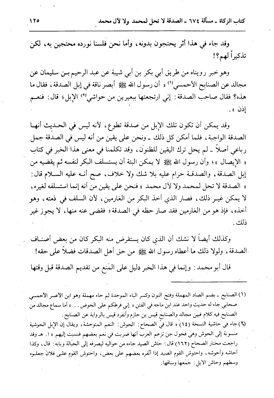 وَقَدْ جَاءَ فِي هَذَا أَثَرٌ يَحْتَجُّونَ بِدُونِهِ، وَأَمَّا نَحْنُ فَلَسْنَا نُورِدُهُ مُحْتَجِّينَ بِهِ، لَكِنْ تَذْكِيرًا لَهُمْ؟ وَهُوَ خَبَرٌ رُوِّينَاهُ مِنْ طَرِيقِ أَبِي بَكْرِ بْنِ أَبِي شَيْبَةَ عَنْ عَبْدِ الرَّحِيمِ بْنِ سُلَيْمَانَ عَنْ مُجَالِدٍ عَنْ الصُّنَابِحِ الْأَحْمَسِيِّ «أَنَّ رَسُولَ اللَّهِ - صَلَّى اللَّهُ عَلَيْهِ وَسَلَّمَ - أَبْصَرَ نَاقَةً فِي إبِلِ الصَّدَقَةِ، فَقَالَ مَا هَذِهِ؟ فَقَالَ صَاحِبُ الصَّدَقَةِ: إنِّي ارْتَجَعْتُهَا بِبَعِيرَيْنِ مِنْ حَوَاشِي الْإِبِلِ؛ فَقَالَ: فَنَعَمْ إذَنْ» .