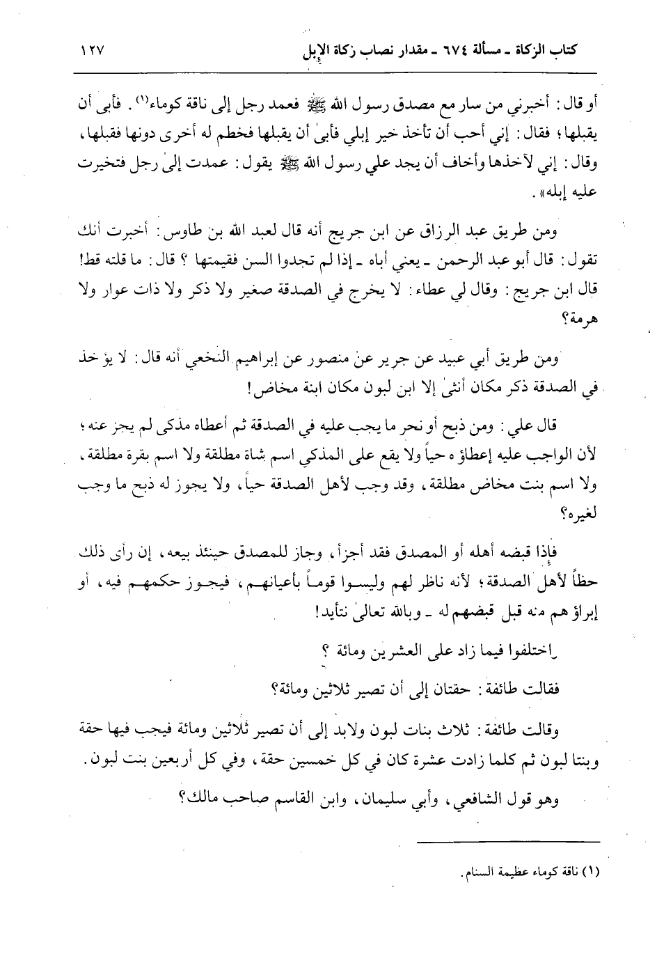 أَوْ قَالَ: أَخْبَرَنِي مَنْ سَارَ مَعَ مُصَدِّقِ رَسُولِ اللَّهِ - صَلَّى اللَّهُ عَلَيْهِ وَسَلَّمَ - فَعَمَدَ رَجُلٌ إلَى نَاقَةٍ كَوْمَاءَ. فَأَبَى أَنْ يَقْبَلَهَا؛ فَقَالَ: إنِّي أُحِبُّ أَنْ تَأْخُذَ خَيْرَ إبِلِي فَأَبَى أَنْ يَقْبَلَهَا فَخَطَمَ لَهُ أُخْرَى دُونَهَا فَقَبِلَهَا، وَقَالَ: إنِّي لَآخُذُهَا وَأَخَافُ أَنْ يَجِدَ عَلَيَّ رَسُولُ اللَّهِ - صَلَّى اللَّهُ عَلَيْهِ وَسَلَّمَ - يَقُولُ: عَمَدْت إلَى رَجُلٍ فَتَخَيَّرْت عَلَيْهِ إبِلَهُ ".