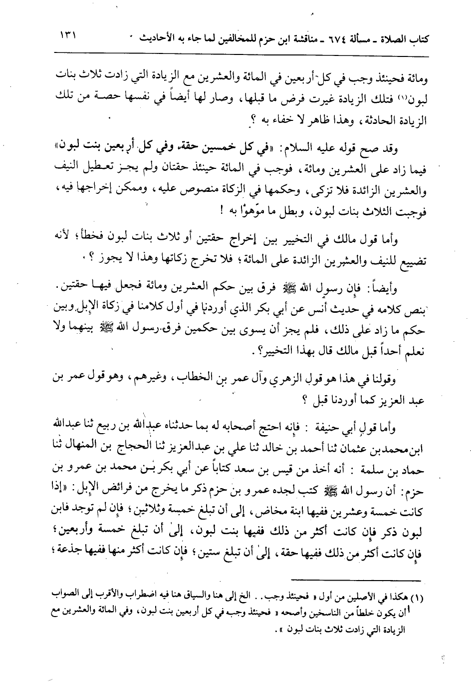 وَمِائَةً فَحِينَئِذٍ وَجَبَ فِي كُلِّ أَرْبَعِينَ فِي الْمِائَةِ وَالْعِشْرِينَ مَعَ الزِّيَادَةِ الَّتِي زَادَتْ ثَلَاثُ بَنَاتِ لَبُونٍ فَتِلْكَ الزِّيَادَةُ غَيَّرَتْ فَرْضَ مَا قَبْلَهَا، وَصَارَ لَهَا أَيْضًا فِي نَفْسِهَا حِصَّةٌ مِنْ تِلْكَ الزِّيَادَةِ الْحَادِثَةِ، وَهَذَا ظَاهِرٌ لَا خَفَاءَ بِهِ؟ وَقَدْ صَحَّ قَوْلُهُ - عَلَيْهِ السَّلَامُ -: «فِي كُلِّ خَمْسِينَ حِقَّةٌ، وَفِي كُلِّ أَرْبَعِينَ بِنْتُ لَبُونٍ» فِيمَا زَادَ عَلَى الْعِشْرِينَ وَمِائَةٍ، فَوَجَبَ فِي الْمِائَةِ حِينَئِذٍ حِقَّتَانِ وَلَمْ يَجُزْ تَعْطِيلُ النَّيِّفِ وَالْعِشْرِينَ الزَّائِدَةِ فَلَا تُزَكَّى، وَحُكْمُهَا فِي الزَّكَاةِ مَنْصُوصٌ عَلَيْهِ، وَمُمْكِنٌ إخْرَاجُهَا فِيهِ، فَوَجَبَتْ الثَّلَاثُ بَنَاتِ لَبُونٍ، وَبَطَلَ مَا مَوَّهُوا بِهِ وَأَمَّا قَوْلُ مَالِكٍ فِي التَّخْيِيرِ بَيْنَ إخْرَاجِ حِقَّتَيْنِ أَوْ ثَلَاثِ بَنَاتِ، لَبُونٍ فَخَطَأٌ؛ لِأَنَّهُ تَضْيِيعٌ لِلنَّيِّفِ وَالْعِشْرِينَ الزَّائِدَةِ عَلَى الْمِائَةِ؛ فَلَا تَخْرُجُ زَكَاتُهَا وَهَذَا لَا يَجُوزُ؟ .