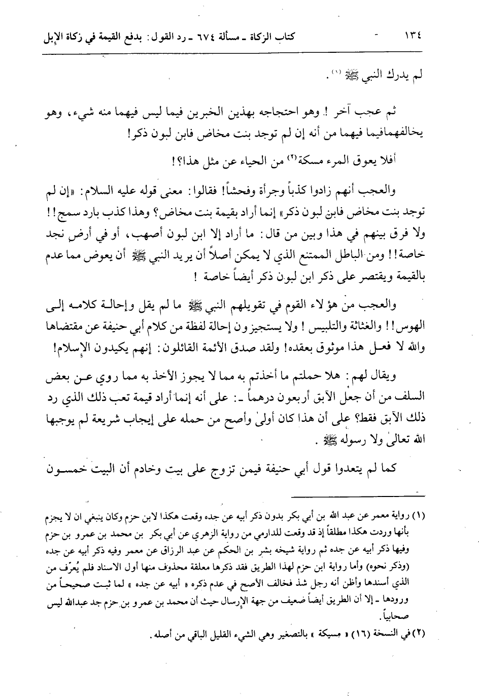 لَمْ يُدْرِكْ النَّبِيَّ - صَلَّى اللَّهُ عَلَيْهِ وَسَلَّمَ -. ثُمَّ عَجَبٌ آخَرُ وَهُوَ احْتِجَاجُهُ بِهَذَيْنِ الْخَبَرَيْنِ فِيمَا لَيْسَ فِيهِمَا مِنْهُ شَيْءٌ، وَهُوَ يُخَالِفُهُمَا فِيمَا فِيهِمَا مِنْ أَنَّهُ إنْ لَمْ تُوجَدْ بِنْتُ مَخَاضٍ فَابْنُ لَبُونٍ ذَكَرٌ أَفَلَا يَعُوقُ الْمَرْءَ مُسَكَةٌ مِنْ الْحَيَاءِ عَنْ مِثْلِ هَذَا؟ وَالْعَجَبُ أَنَّهُمْ زَادُوا كَذِبًا وَجُرْأَةً وَفُحْشًا فَقَالُوا: مَعْنَى قَوْلِهِ - عَلَيْهِ السَّلَامُ -: «إنْ لَمْ تُوجَدْ بِنْتُ مَخَاضٍ فَابْنُ لَبُونٍ ذَكَرٌ» إنَّمَا أَرَادَ بِقِيمَةِ بِنْتِ مَخَاضٍ؟ وَهَذَا كَذِبٌ بَارِدٌ سَمْجٌ وَلَا فَرْقَ بَيْنَهُمْ فِي هَذَا وَبَيْنَ مَنْ قَالَ: مَا أَرَادَ إلَّا ابْنَ لَبُونٍ أَصْهَبَ، أَوْ فِي أَرْضِ نَجْدٍ خَاصَّةً وَمِنْ الْبَاطِلِ الْمُمْتَنِعِ الَّذِي لَا يُمْكِنُ أَصْلًا أَنْ يُرِيدَ النَّبِيُّ - صَلَّى اللَّهُ عَلَيْهِ وَسَلَّمَ - أَنْ يُعَوِّضَ مِمَّا عُدِمَ بِالْقِيمَةِ وَيَقْتَصِرُ عَلَى ذِكْرِ ابْنِ لَبُونٍ ذَكَرٌ أَيْضًا خَاصَّةً وَالْعَجَبُ مِنْ هَؤُلَاءِ الْقَوْمِ فِي تَقْوِيلِهِمْ النَّبِيَّ - صَلَّى اللَّهُ عَلَيْهِ وَسَلَّمَ - مَا لَمْ يَقُلْ وَإِحَالَةِ كَلَامِهِ إلَى الْهَوَسِ وَالْغَثَاثَةِ وَالتَّلْبِيسِ وَلَا يَسْتَجِيزُونَ إحَالَةَ لَفْظَةٍ مِنْ كَلَامِ أَبِي حَنِيفَةَ عَنْ مُقْتَضَاهَا وَاَللَّهُ لَا فَعَلَ هَذَا مَوْثُوقٌ بِعَقْدِهِ وَلَقَدْ صَدَقَ الْأَئِمَّةُ الْقَائِلُونَ: إنَّهُمْ يَكِيدُونَ الْإِسْلَامَ وَيُقَالُ لَهُمْ: هَلَّا حَمَلْتُمْ مَا أَخَذْتُمْ بِهِ مِمَّا لَا يَجُوزُ الْأَخْذُ بِهِ مِمَّا رُوِيَ عَنْ بَعْضِ السَّلَفِ مِنْ أَنَّ جُعْلَ الْآبِقِ أَرْبَعُونَ دِرْهَمًا -: عَلَى أَنَّهُ إنَّمَا أَرَادَ قِيمَةَ تَعَبِ ذَلِكَ الَّذِي رَدَّ ذَلِكَ الْآبِقَ فَقَطْ؟ عَلَى أَنَّ هَذَا كَانَ أَوْلَى وَأَصَحَّ مِنْ حَمْلِهِ عَلَى إيجَابِ شَرِيعَةٍ لَمْ يُوجِبْهَا اللَّهُ تَعَالَى وَلَا رَسُولُهُ - صَلَّى اللَّهُ عَلَيْهِ وَسَلَّمَ -.