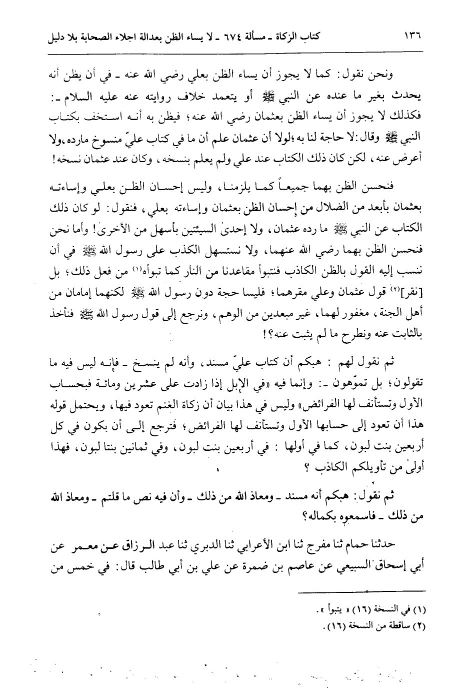 وَنَحْنُ نَقُولُ: كَمَا لَا يَجُوزُ أَنْ يُسَاءَ الظَّنُّ بِعَلِيٍّ - رَضِيَ اللَّهُ عَنْهُ - فِي أَنْ يُظَنَّ أَنَّهُ يُحَدِّثُ بِغَيْرِ مَا عِنْدَهُ عَنْ النَّبِيِّ - صَلَّى اللَّهُ عَلَيْهِ وَسَلَّمَ - أَوْ يَتَعَمَّدُ خِلَافَ رِوَايَتِهِ عَنْهُ - عَلَيْهِ السَّلَامُ -: فَكَذَلِكَ لَا يَجُوزُ أَنْ يُسَاءَ الظَّنُّ بِعُثْمَانَ - رَضِيَ اللَّهُ عَنْهُ -؛ فَيُظَنُّ بِهِ أَنَّهُ اسْتَخْلَفَ بِكِتَابِ النَّبِيِّ - صَلَّى اللَّهُ عَلَيْهِ وَسَلَّمَ - وَقَالَ: لَا حَاجَةَ لَنَا بِهِ؛ لَوْلَا أَنَّ عُثْمَانَ عَلِمَ أَنَّ مَا فِي كِتَابِ عَلِيٍّ مَنْسُوخٌ مَا رَدَّهُ، وَلَا أَعْرَضَ عَنْهُ، لَكِنْ كَانَ ذَلِكَ الْكِتَابُ عِنْدَ عَلِيٍّ وَلَمْ يَعْلَمْ بِنَسْخِهِ، وَكَانَ عِنْدَ عُثْمَانَ نَسْخُهُ فَنُحْسِنُ الظَّنَّ بِهِمَا جَمِيعًا كَمَا يَلْزَمُنَا، وَلَيْسَ إحْسَانُ الظَّنِّ بِعَلِيٍّ وَإِسَاءَتُهُ بِعُثْمَانَ بِأَبْعَدَ مِنْ الضَّلَالِ مِنْ إحْسَانِ الظَّنِّ بِعُثْمَانَ وَإِسَاءَتِهِ بِعَلِيٍّ.
