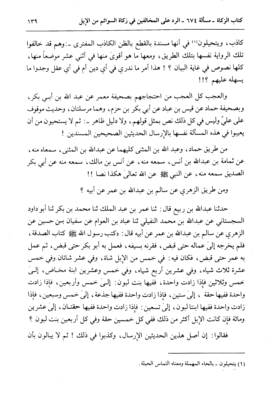 كَاذِبٍ، وَيَتَحَيَّلُونَ فِي أَنَّهَا مُسْنَدَةٌ بِالْقَطْعِ بِالظَّنِّ الْكَاذِبِ الْمُفْتَرَى -: وَهُمْ قَدْ خَالَفُوا تِلْكَ الرِّوَايَةَ نَفْسَهَا بِتِلْكَ الطَّرِيقِ، وَمَعَهَا مَا هُوَ أَقْوَى مِنْهَا فِي اثْنَيْ عَشْرَ مَوْضِعًا مِنْهَا، كُلُّهَا نُصُوصٌ فِي غَايَةِ الْبَيَانِ؟ هَذَا أَمْرٌ مَا نَدْرِي فِي أَيِّ دِينٍ أَمْ فِي أَيِّ عَقْلٍ وَجَدُوا مَا يُسَهِّلُهُ عَلَيْهِمْ؟ وَالْعَجَبُ كُلُّ الْعَجَبِ مِنْ احْتِجَاجِهِمْ بِصَحِيفَةِ مَعْمَرٍ عَنْ عَبْدِ اللَّهِ بْنِ أَبِي بَكْرٍ، وَبِصَحِيفَةِ حَمَّادٍ عَنْ قَيْسِ بْنِ عَبَّادٍ عَنْ أَبِي بَكْرِ بْنِ حَزْمٍ، وَهُمَا مُرْسَلَتَانِ، وَحَدِيثٍ مَوْقُوفٍ عَلَى عَلِيٍّ وَلَيْسَ فِي كُلِّ ذَلِكَ نَصٌّ بِمِثْلِ قَوْلِهِمْ، وَلَا دَلِيلَ ظَاهِرٌ -: ثُمَّ لَا يَسْتَحْيُونَ مِنْ أَنْ يَعِيبُوا فِي هَذِهِ الْمَسْأَلَةِ نَفْسِهَا بِالْإِرْسَالِ الْحَدِيثَيْنِ الصَّحِيحَيْنِ الْمُسْنَدَيْنِ مِنْ طَرِيقِ حَمَّادٍ، وَعَبْدِ اللَّهِ بْنِ الْمُثَنَّى كِلَيْهِمَا عَنْ عَبْدِ اللَّهِ بْنِ الْمُثَنَّى، سَمِعَاهُ مِنْهُ، عَنْ ثُمَامَةَ بْنِ عَبْدِ اللَّهِ بْنِ أَنَسٍ، سَمِعَهُ مِنْهُ، عَنْ أَنَسِ بْنِ مَالِكٍ، سَمِعَهُ مِنْهُ عَنْ أَبِي بَكْرٍ الصِّدِّيقِ سَمِعَهُ مِنْهُ، عَنْ النَّبِيِّ - صَلَّى اللَّهُ عَلَيْهِ وَسَلَّمَ - عَنْ اللَّهِ تَعَالَى هَكَذَا نَصًّا وَمِنْ طَرِيقِ الزُّهْرِيِّ عَنْ سَالِمِ بْنِ عَبْدِ اللَّهِ بْنِ عُمَرَ عَنْ أَبِيهِ؟ حَدَّثَنَا عَبْدُ اللَّهِ بْنُ رَبِيعٍ قَالَ: ثنا عُمَرُ بْنُ عَبْدِ الْمَلِكِ ثنا ابْنُ بَكْرٍ ثنا أَبُو دَاوُد السِّجِسْتَانِيُّ عَنْ عَبْدِ اللَّهِ بْنِ مُحَمَّدِ النُّفَيْلِيِّ ثنا عَبَّادُ بْنُ الْعَوَّامِ عَنْ سُفْيَانَ بْنِ حُسَيْنٍ عَنْ الزُّهْرِيِّ عَنْ سَالِمِ بْنِ عَبْدِ اللَّهِ بْنِ عُمَرَ عَنْ أَبِيهِ قَالَ: «كَتَبَ رَسُولُ اللَّهِ - صَلَّى اللَّهُ عَلَيْهِ وَسَلَّمَ - كِتَابَ الصَّدَقَةِ، فَلَمْ يُخْرِجْهُ إلَى عُمَّالِهِ حَتَّى قُبِضَ، فَقَرَنَهُ بِسَيْفِهِ، فَعَمِلَ بِهِ أَبُو بَكْرٍ حَتَّى قُبِضَ، ثُمَّ عَمِلَ بِهِ عُمَرُ حَتَّى قُبِضَ، فَكَانَ فِيهِ: فِي خَمْسٍ مِنْ الْإِبِلِ شَاةٌ، وَفِي عَشْرٍ شَاتَانِ وَفِي خَمْسَ عَشْرَةَ ثَلَاثُ شِيَاهٍ، وَفِي عِشْرِينَ أَرْبَعُ شِيَاهٍ، وَفِي خَمْسٍ وَعِشْرِينَ ابْنَةُ مَخَاضٍ، إلَى خَمْسٍ وَثَلَاثِينَ فَإِذَا زَادَتْ وَاحِدَةً، فَفِيهَا بِنْتُ لَبُونٍ: إلَى خَمْسٍ وَأَرْبَعِينَ. فَإِذَا زَادَتْ وَاحِدَةً فَفِيهَا حِقَّةٌ، إلَى سِتِّينَ، فَإِذَا زَادَتْ وَاحِدَةً فَفِيهَا جَذَعَةٌ، إلَى خَمْسٍ وَسَبْعِينَ، فَإِذَا زَادَتْ وَاحِدَةً فَفِيهَا ابْنَتَا لَبُونٍ، إلَى تِسْعِينَ: فَإِذَا زَادَتْ وَاحِدَةً فَفِيهَا حِقَّتَانِ، إلَى عِشْرِينَ وَمِائَةٍ فَإِنْ كَانَتْ الْإِبِلُ أَكْثَرَ مِنْ ذَلِكَ فَفِي كُلِّ خَمْسِينَ حِقَّةٌ وَفِي كُلِّ أَرْبَعِينَ بِنْتُ لَبُونٍ؟»