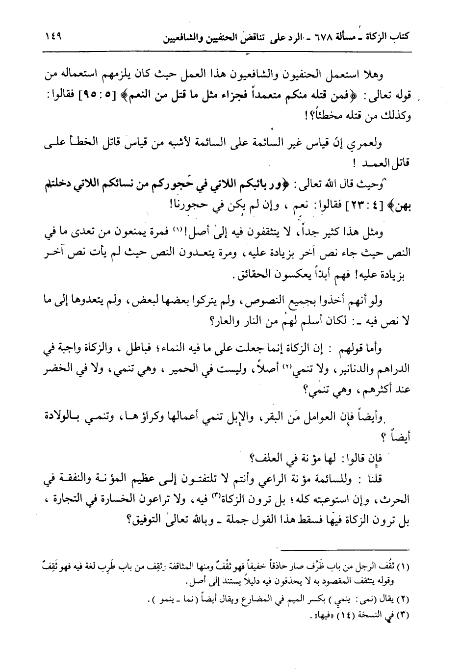 وَلَوْ أَنَّهُمْ أَخَذُوا بِجَمِيعِ النُّصُوصِ، وَلَمْ يَتْرُكُوا بَعْضَهَا لِبَعْضِ، وَلَمْ يَتَعَدَّوْهَا إلَى مَا لَا نَصَّ فِيهِ -: لَكَانَ أَسْلَمَ لَهُمْ مِنْ النَّارِ وَالْعَارِ؟ وَأَمَّا قَوْلُهُمْ: إنَّ الزَّكَاةَ إنَّمَا جُعِلَتْ عَلَى مَا فِيهِ النَّمَاءُ؛ فَبَاطِلٌ، وَالزَّكَاةُ وَاجِبَةٌ فِي الدَّرَاهِمِ وَالدَّنَانِيرِ، وَلَا تَنْمِي أَصْلًا، وَلَيْسَتْ فِي الْحَمِيرِ، وَهِيَ تَنْمِي، وَلَا فِي الْخَضَرِ عِنْدَ أَكْثَرِهِمْ، وَهِيَ تَنْمِي؟ وَأَيْضًا فَإِنَّ الْعَوَامِلَ مِنْ الْبَقَرِ، وَالْإِبِلِ تَنْمِي أَعْمَالُهَا وَكِرَاؤُهَا، وَتَنْمِي بِالْوِلَادَةِ أَيْضًا؟ فَإِنْ قَالُوا: لَهَا مُؤْنَةٌ فِي الْعَلَفِ؟ قُلْنَا: وَلِلسَّائِمَةِ مُؤْنَةُ الرَّاعِي وَأَنْتُمْ لَا تَلْتَفِتُونَ إلَى عَظِيمِ الْمُؤْنَةِ وَالنَّفَقَةِ فِي الْحَرْثِ، وَإِنْ اسْتَوْعَبَتْهُ كُلَّهُ؛ بَلْ تَرَوْنَ الزَّكَاةَ فِيهِ، وَلَا تُرَاعُونَ الْخَسَارَةَ فِي التِّجَارَةِ، بَلْ تَرَوْنَ الزَّكَاةَ فِيهَا فَسَقَطَ هَذَا الْقَوْلُ جُمْلَةً - وَبِاَللَّهِ تَعَالَى التَّوْفِيقُ؟