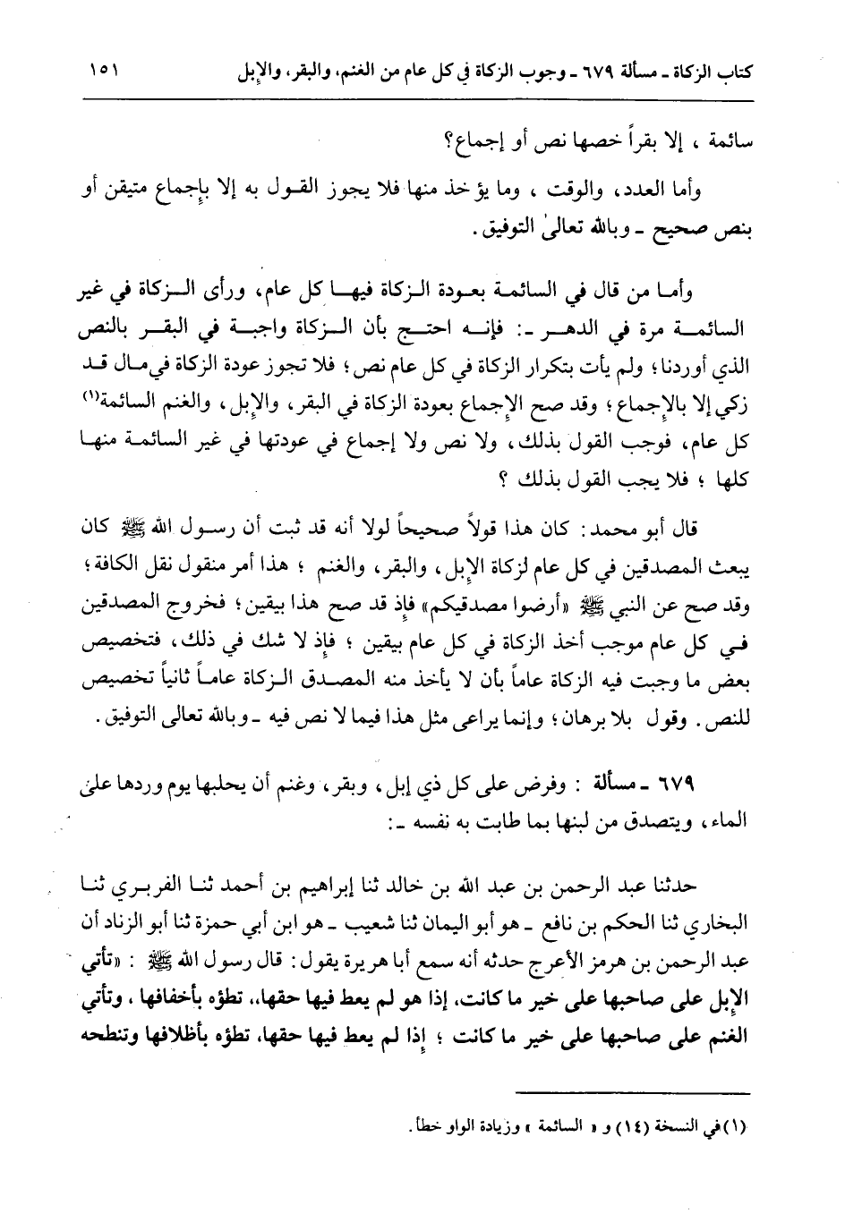 وَأَمَّا مَنْ قَالَ فِي السَّائِمَةِ بِعَوْدَةِ الزَّكَاةِ فِيهَا كُلَّ عَامٍ، وَرَأَى الزَّكَاةَ فِي غَيْرِ السَّائِمَةِ مَرَّةً فِي الدَّهْرِ -: فَإِنَّهُ احْتَجَّ بِأَنَّ الزَّكَاةَ وَاجِبَةٌ فِي الْبَقَرِ بِالنَّصِّ الَّذِي أَوْرَدْنَا؛ وَلَمْ يَأْتِ بِتَكْرَارِ الزَّكَاةِ فِي كُلِّ عَامٍ نَصٌّ؛ فَلَا تَجُوزُ عَوْدَةُ الزَّكَاةِ فِي مَالٍ قَدْ زُكِّيَ، إلَّا بِالْإِجْمَاعِ؛ وَقَدْ صَحَّ الْإِجْمَاعُ بِعَوْدَةِ الزَّكَاةِ فِي الْبَقَرِ، وَالْإِبِلِ، وَالْغَنَمِ السَّائِمَةِ كُلَّ عَامٍ، فَوَجَبَ الْقَوْلُ بِذَلِكَ، وَلَا نَصَّ وَلَا إجْمَاعَ فِي عَوْدَتِهَا فِي غَيْرِ السَّائِمَةِ مِنْهَا كُلِّهَا؛ فَلَا يَجِبُ الْقَوْلُ بِذَلِكَ؟ قَالَ أَبُو مُحَمَّدٍ: كَانَ هَذَا قَوْلًا صَحِيحًا لَوْلَا أَنَّهُ قَدْ ثَبَتَ «أَنَّ رَسُولَ اللَّهِ - صَلَّى اللَّهُ عَلَيْهِ وَسَلَّمَ - كَانَ يَبْعَثُ الْمُصَدِّقِينَ فِي كُلِّ عَامٍ لِزَكَاةِ الْإِبِلِ، وَالْبَقَرِ، وَالْغَنَمِ» هَذَا أَمْرٌ مَنْقُولٌ نَقْلَ الْكَافَّةِ؛ وَقَدْ صَحَّ «عَنْ النَّبِيِّ - صَلَّى اللَّهُ عَلَيْهِ وَسَلَّمَ - اُرْضُوَا مُصَدِّقِيكُمْ» فَإِذْ قَدْ صَحَّ هَذَا بِيَقِينٍ؛ فَخُرُوجُ الْمُصَدِّقِينَ فِي كُلِّ عَامٍ مُوجِبٌ أَخْذَ الزَّكَاةِ فِي كُلِّ عَامٍ بِيَقِينٍ؛ فَإِذْ لَا شَكَّ فِي ذَلِكَ، فَتَخْصِيصُ بَعْضِ مَا وَجَبَتْ فِيهِ الزَّكَاةُ عَامًا بِأَنْ لَا يَأْخُذَ مِنْهُ الْمُصَدِّقُ الزَّكَاةَ عَامًا ثَانِيًا تَخْصِيصٌ لِلنَّصِّ.