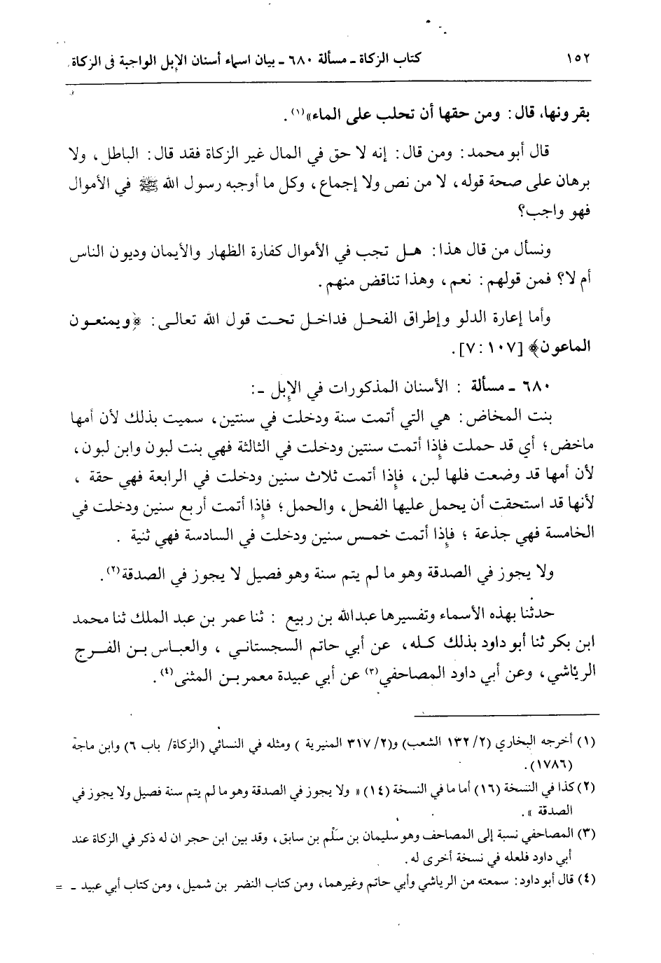 الْأَسْنَانُ الْمَذْكُورَاتُ فِي الْإِبِلِ -: بِنْتُ الْمَخَاضِ: هِيَ الَّتِي أَتَمَّتْ سَنَةً وَدَخَلَتْ فِي سَنَتَيْنِ، سُمِّيَتْ بِذَلِكَ لِأَنَّ أُمَّهَا مَاخِضٌ؛ أَيْ قَدْ حَمَلَتْ فَإِذَا أَتَمَّتْ سَنَتَيْنِ وَدَخَلَتْ فِي الثَّالِثَةِ فَهِيَ بِنْتُ لَبُونٍ وَابْنُ لَبُونٍ، لِأَنَّ أُمَّهَا قَدْ وَضَعَتْ فَلَهَا لَبَنٌ، فَإِذَا أَتَمَّتْ ثَلَاثَ سِنِينَ وَدَخَلَتْ فِي الرَّابِعَةِ فَهِيَ حِقَّةٌ، لِأَنَّهَا قَدْ اسْتَحَقَّتْ أَنْ يُحْمَلَ عَلَيْهَا الْفَحْلُ، وَالْحَمْلُ؛ فَإِذَا أَتَمَّتْ أَرْبَعَ سِنِينَ وَدَخَلَتْ فِي الْخَامِسَةِ فَهِيَ جَذَعَةٌ؛ فَإِذَا أَتَمَّتْ خَمْسَ سِنِينَ وَدَخَلَتْ فِي السَّادِسَةِ فَهِيَ ثَنِيَّةٌ.