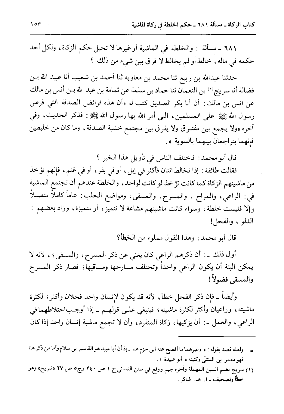 وَالْخُلْطَةُ فِي الْمَاشِيَةِ أَوْ غَيْرِهَا لَا تُحِيلُ حُكْمَ الزَّكَاةِ، وَلِكُلِّ أَحَدٍ حُكْمُهُ فِي مَالِهِ، خَالَطَ أَوْ لَمْ يُخَالِطْ لَا فَرْقَ بَيْنَ شَيْءٍ مِنْ ذَلِكَ؟ حَدَّثَنَا عَبْدُ اللَّهِ بْنُ رَبِيعٍ ثنا مُحَمَّدُ بْنُ مُعَاوِيَةَ ثنا أَحْمَدُ بْنُ شُعَيْبٍ أَنَا عُبَيْدُ اللَّهِ بْنُ فَضَالَةَ أَنَا سُرَيْجٌ بْنُ النُّعْمَانِ ثني حَمَّادُ بْنُ سَلَمَةَ عَنْ ثُمَامَةَ بْنِ عَبْدِ اللَّهِ بْنِ أَنَسِ بْنِ مَالِكٍ عَنْ أَنَسِ بْنِ مَالِكٍ: أَنَّ أَبَا بَكْرٍ الصِّدِّيقَ كَتَبَ لَهُ " أَنَّ هَذِهِ فَرَائِضُ الصَّدَقَةِ الَّتِي فَرَضَ رَسُولُ اللَّهِ - صَلَّى اللَّهُ عَلَيْهِ وَسَلَّمَ - عَلَى الْمُسْلِمِينَ الَّتِي أَمَرَ اللَّهُ بِهَا رَسُولَ اللَّهِ - صَلَّى اللَّهُ عَلَيْهِ وَسَلَّمَ - " فَذَكَرَ الْحَدِيثَ، وَفِي آخِرِهِ «وَلَا يُجْمَعُ بَيْنَ مُفْتَرِقٍ وَلَا يُفَرَّقُ بَيْنَ مُجْتَمِعٍ خَشْيَةَ الصَّدَقَةِ، وَمَا كَانَ مِنْ خَلِيطَيْنِ فَإِنَّهُمَا يَتَرَاجَعَانِ بَيْنَهُمَا بِالسَّوِيَّةِ» .