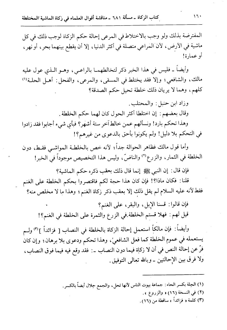 الْمُفْتَرَضَةِ بِذَلِكَ وَلَوْ وَجَبَ بِالِاخْتِلَاطِ فِي الْمَرْعَى إحَالَةُ حُكْمِ الزَّكَاةِ لَوَجَبَ ذَلِكَ فِي كُلِّ مَاشِيَةٍ فِي الْأَرْضِ، لِأَنَّ الْمَرَاعِيَ مُتَّصِلَةٌ فِي أَكْثَرِ الدُّنْيَا، إلَّا أَنْ يَقْطَعَ بَيْنَهُمَا بَحْرٌ، أَوْ نَهْرٌ، أَوْ عِمَارَةٌ وَأَيْضًا - فَلَيْسَ فِي هَذَا الْخَبَرِ ذِكْرٌ لِتَخَالُطِهِمَا بِالرَّاعِي، وَهُوَ الَّذِي عَوَّلَ عَلَيْهِ مَالِكٌ، وَالشَّافِعِيُّ؛ وَإِلَّا فَقَدْ يَخْتَلِطُ فِي الْمَسْقَى، وَالْمَرْعَى، وَالْفَحْلِ: أَهْلُ الْحِلَّةِ كُلُّهُمْ، وَهُمَا لَا يَرَيَانِ ذَلِكَ خُلْطَةً تُحِيلُ حُكْمَ الصَّدَقَةِ؟ وَزَادَ ابْنُ حَنْبَلٍ: وَالْمُحْتَلَبِ.