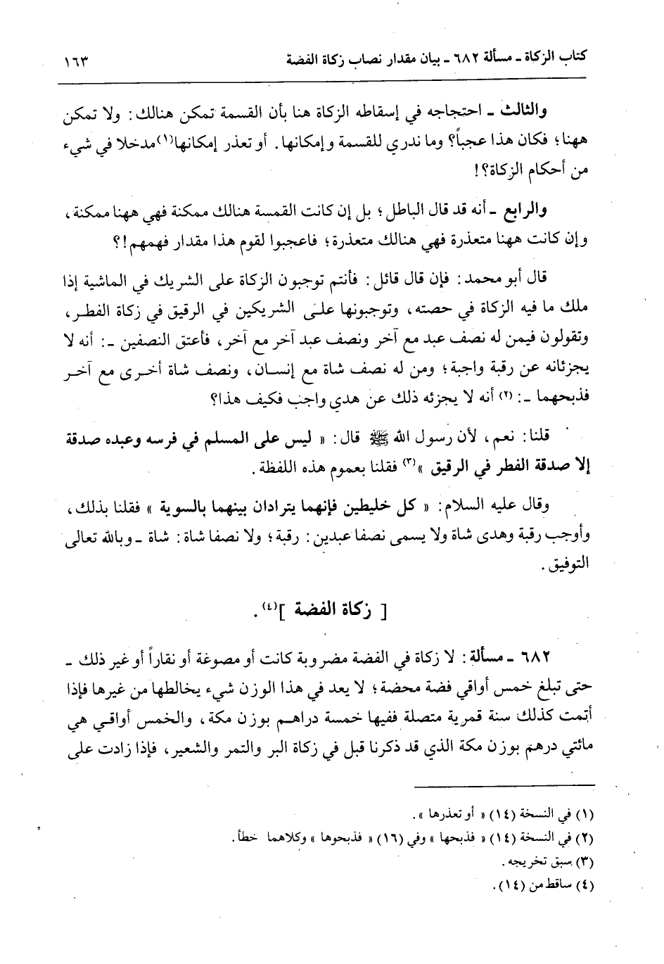 682 - مَسْأَلَةٌ: لَا زَكَاةَ فِي الْفِضَّةِ مَضْرُوبَةً كَانَتْ أَوْ مَصُوغَةً أَوْ نِقَارًا أَوْ غَيْرَ ذَلِكَ - حَتَّى تَبْلُغَ خَمْسَ أَوَاقِيَ فِضَّةٍ مَحْضَةٍ؛ لَا يُعَدُّ فِي هَذَا الْوَزْنِ شَيْءٌ يُخَالِطُهَا مِنْ غَيْرِهَا فَإِذَا أَتَمَّتْ كَذَلِكَ سَنَةً قَمَرِيَّةً مُتَّصِلَةً فَفِيهَا خَمْسَةُ دَرَاهِمَ بِوَزْنِ مَكَّةَ، وَالْخَمْسُ أَوَاقِي هِيَ مِائَتَيْ دِرْهَمٍ بِوَزْنِ مَكَّةَ الَّذِي قَدْ ذَكَرْنَا قَبْلَ زَكَاةِ الْبُرِّ وَالتَّمْرِ وَالشَّعِيرِ، فَإِذَا زَادَتْ عَلَى