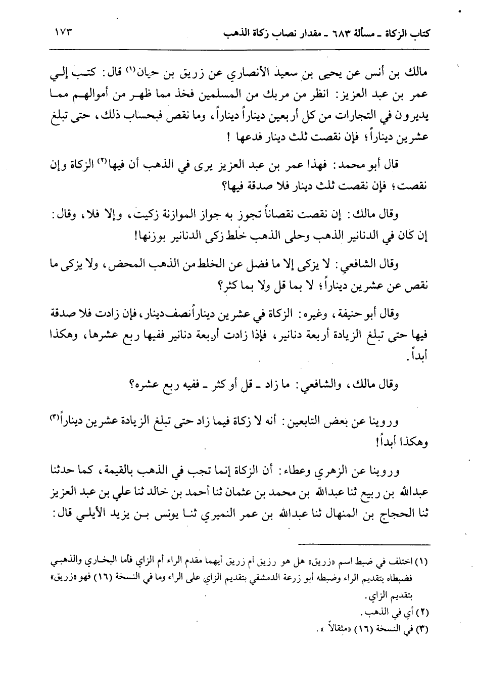 مَالِكِ بْنِ أَنَسٍ عَنْ يَحْيَى بْنِ سَعِيدٍ الْأَنْصَارِيِّ عَنْ زُرَيْقِ بْنِ حَيَّانَ قَالَ: كَتَبَ إلَيَّ عُمَرُ بْنُ عَبْدِ الْعَزِيزِ: اُنْظُرْ مَنْ مَرَّ بِكَ مِنْ الْمُسْلِمِينَ فَخُذْ مِمَّا ظَهَرَ مِنْ أَمْوَالِهِمْ مِمَّا يُدِيرُونَ فِي التِّجَارَاتِ مِنْ كُلِّ أَرْبَعِينَ دِينَارًا دِينَارًا، وَمَا نَقَصَ فَبِحِسَابِ ذَلِكَ، حَتَّى تَبْلُغَ عِشْرِينَ دِينَارًا؛ فَإِنْ نَقَصَتْ ثُلُثَ دِينَارٍ فَدَعْهَا قَالَ أَبُو مُحَمَّدٍ: فَهَذَا عُمَرُ بْنُ عَبْدِ الْعَزِيزِ يَرَى فِي الذَّهَبِ أَنَّ فِيهَا الزَّكَاةَ وَإِنْ نَقَصَتْ؛ فَإِنْ نَقَصَتْ ثُلُثَ دِينَارٍ فَلَا صَدَقَةَ فِيهَا؟ وَقَالَ مَالِكٌ: إنْ نَقَصَتْ نُقْصَانًا تَجُوزُ بِهِ جَوَازَ الْمُوَازَنَةِ زُكِّيَتْ، وَإِلَّا فَلَا، وَقَالَ: إنْ كَانَ فِي الدَّنَانِيرِ الذَّهَبِ وَحُلِيِّ الذَّهَبِ خَلْطٌ زَكَّى الدَّنَانِيرَ بِوَزْنِهَا وَقَالَ الشَّافِعِيُّ: لَا يُزَكَّى إلَّا مَا فَضَلَ عَنْ الْخَلْطِ مِنْ الذَّهَبِ الْمَحْضِ، وَلَا يُزَكَّى مَا نَقَصَ عَنْ عِشْرِينَ دِينَارًا؛ وَلَا بِمَا كَثُرَ؟ وَقَالَ أَبُو حَنِيفَةَ، وَغَيْرُهُ: الزَّكَاةُ فِي عِشْرِينَ دِينَارًا نِصْفُ دِينَارٍ، فَإِنْ زَادَتْ فَلَا صَدَقَةَ فِيهَا حَتَّى تَبْلُغَ الزِّيَادَةُ أَرْبَعَةَ دَنَانِيرَ، فَإِذَا زَادَتْ أَرْبَعَةَ دَنَانِيرَ فَفِيهَا رُبْعُ عُشْرِهَا، وَهَكَذَا أَبَدًا.