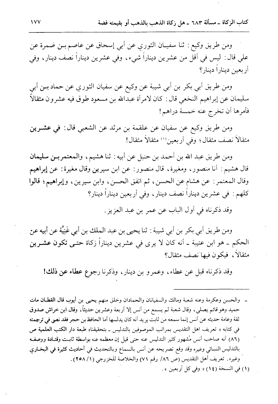 وَمِنْ طَرِيقِ - وَكِيعٍ: ثنا سُفْيَانُ الثَّوْرِيُّ عَنْ أَبِي إِسْحَاقَ عَنْ عَاصِمِ بْنِ ضَمْرَةَ عَنْ عَلِيٍّ قَالَ: لَيْسَ فِي أَقَلَّ مِنْ عِشْرِينَ دِينَارًا شَيْءٌ، وَفِي عِشْرِينَ دِينَارًا نِصْفُ دِينَارٍ، وَفِي أَرْبَعِينَ دِينَارًا دِينَارٌ؟ وَمِنْ طَرِيقِ أَبِي بَكْرِ بْنِ أَبِي شَيْبَةَ عَنْ وَكِيعٍ عَنْ سُفْيَانَ الثَّوْرِيِّ عَنْ حَمَّادِ بْنِ أَبِي سُلَيْمَانَ عَنْ إبْرَاهِيمَ النَّخَعِيِّ قَالَ: كَانَ لِامْرَأَةِ عَبْدِ اللَّهِ بْنِ مَسْعُودٍ طَوْقٌ فِيهِ عِشْرُونَ مِثْقَالًا فَأَمَرَهَا أَنْ تُخْرِجَ عَنْهُ خَمْسَةَ دَرَاهِمَ وَمِنْ طَرِيقِ وَكِيعٍ عَنْ سُفْيَانَ عَنْ عَلْقَمَةَ بْنِ مَرْثَدٍ عَنْ الشَّعْبِيِّ قَالَ: فِي عِشْرِينَ مِثْقَالًا نِصْفُ مِثْقَالٍ؛ وَفِي أَرْبَعِينَ مِثْقَالًا مِثْقَالٌ وَمِنْ طَرِيقِ عَبْدِ اللَّهِ بْنِ أَحْمَدَ بْنِ حَنْبَلٍ عَنْ أَبِيهِ: ثنا هُشَيْمٌ، وَالْمُعْتَمِرُ بْنُ سُلَيْمَانَ قَالَ هُشَيْمٌ: أَنَا مَنْصُورٌ، وَمُغِيرَةُ، قَالَ مَنْصُورٌ: عَنْ ابْنِ سِيرِينَ وَقَالَ مُغِيرَةُ: عَنْ إبْرَاهِيمَ وَقَالَ الْمُعْتَمِرُ: عَنْ هِشَامٍ عَنْ الْحَسَنِ، ثُمَّ اتَّفَقَ الْحَسَنُ، وَابْنُ سِيرِينَ، وَإِبْرَاهِيمُ؛ قَالُوا كُلُّهُمْ: فِي عِشْرِينَ دِينَارًا، وَفِي أَرْبَعِينَ دِينَارًا دِينَارٌ؟ وَقَدْ ذَكَرْنَاهُ فِي أَوَّلِ الْبَابِ عَنْ عُمَرَ بْنِ عَبْدِ الْعَزِيزِ
