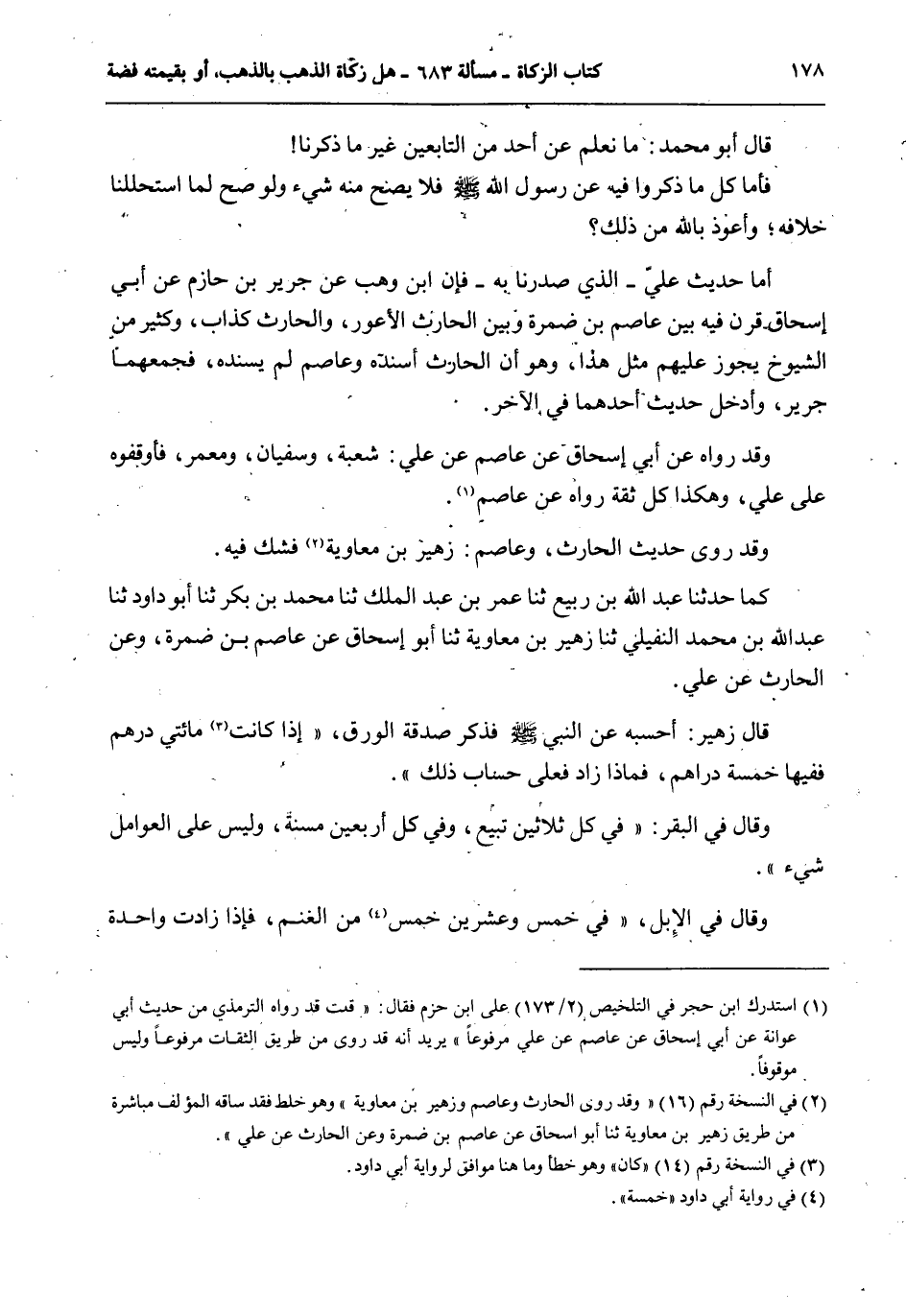 قَالَ أَبُو مُحَمَّدٍ: مَا نَعْلَمُ عَنْ أَحَدٍ مِنْ التَّابِعِينَ غَيْرَ مَا ذَكَرْنَا فَأَمَّا كُلُّ مَا ذَكَرُوا فِيهِ عَنْ رَسُولِ اللَّهِ - صَلَّى اللَّهُ عَلَيْهِ وَسَلَّمَ - فَلَا يَصِحُّ مِنْهُ شَيْءٌ وَلَوْ صَحَّ لَمَا اسْتَحْلَلْنَا خِلَافَهُ؛ وَأَعُوذُ بِاَللَّهِ مِنْ ذَلِكَ؟ أَمَّا حَدِيثُ عَلِيٍّ - الَّذِي صَدَّرْنَا بِهِ - فَإِنَّ ابْنَ وَهْبٍ عَنْ جَرِيرِ بْنِ حَازِمٍ عَنْ أَبِي إِسْحَاقَ قَرَنَ فِيهِ بَيْنَ عَاصِمِ بْنِ ضَمْرَةَ وَبَيْنَ الْحَارِثِ الْأَعْوَرِ، وَالْحَارِثُ كَذَّابٌ، وَكَثِيرٌ مِنْ الشُّيُوخِ يَجُوزُ عَلَيْهِمْ مِثْلُ هَذَا، وَهُوَ أَنَّ الْحَارِثَ أَسْنَدَهُ وَعَاصِمٌ لَمْ يُسْنِدْهُ، فَجَمَعَهُمَا جَرِيرٌ، وَأَدْخَلَ حَدِيثَ أَحَدِهِمَا فِي الْآخَرِ. وَقَدْ رَوَاهُ عَنْ أَبِي إِسْحَاقَ عَنْ عَاصِمٍ عَنْ عَلِيٍّ: شُعْبَةُ، وَسُفْيَانُ، وَمَعْمَرُ، فَأَوْقَفُوهُ عَلَى عَلِيٍّ، وَهَكَذَا كُلُّ ثِقَةٍ رَوَاهُ عَنْ عَاصِمٍ. وَقَدْ رَوَى حَدِيثَ الْحَارِثِ، وَعَاصِمٍ: زُهَيْرُ بْنُ مُعَاوِيَةَ فَشَكَّ فِيهِ.