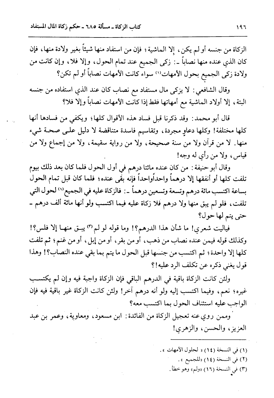 الزَّكَاةُ مِنْ جِنْسِهِ أَوْ لَمْ يَكُنْ، إلَّا الْمَاشِيَةَ؛ فَإِنَّ مَنْ اسْتَفَادَ مِنْهَا شَيْئًا بِغَيْرِ وِلَادَةٍ مِنْهَا، فَإِنْ كَانَ الَّذِي عِنْدَهُ مِنْهَا نِصَابًا -: زَكَّى الْجَمِيعَ عِنْدَ تَمَامِ الْحَوْلِ، وَإِلَّا فَلَا، وَإِنْ كَانَتْ مِنْ وِلَادَةٍ زَكَّى الْجَمِيعَ بِحَوْلِ الْأُمَّهَاتِ سَوَاءٌ كَانَتْ الْأُمَّهَاتُ نِصَابًا أَوْ لَمْ تَكُنْ؟ وَقَالَ الشَّافِعِيُّ: لَا يُزَكَّى مَالٌ مُسْتَفَادٌ مَعَ نِصَابٍ كَانَ عِنْدَ الَّذِي اسْتَفَادَهُ مِنْ جِنْسِهِ أَلْبَتَّةَ، إلَّا أَوْلَادَ الْمَاشِيَةِ مَعَ أُمَّهَاتِهَا فَقَطْ إذَا كَانَتْ الْأُمَّهَاتُ نِصَابًا وَإِلَّا فَلَا؟ قَالَ أَبُو مُحَمَّدٍ: وَقَدْ ذَكَرْنَا قَبْلَ فَسَادِ هَذِهِ الْأَقْوَالِ كُلِّهَا؛ وَيَكْفِي مِنْ فَسَادِهَا أَنَّهَا كُلَّهَا مُخْتَلِفَةٌ وَكُلُّهَا دَعَاوٍ مُجَرَّدَةٌ، وَتَقَاسِيمُ فَاسِدَةٌ مُتَنَاقِضَةٌ لَا دَلِيلَ عَلَى صِحَّةِ شَيْءٍ مِنْهَا. لَا مِنْ قُرْآنٍ وَلَا مِنْ سُنَّةٍ صَحِيحَةٍ، وَلَا مِنْ رِوَايَةٍ سَقِيمَةٍ، وَلَا مِنْ إجْمَاعٍ وَلَا مِنْ قِيَاسٍ، وَلَا مِنْ رَأْيٍ لَهُ وَجْهٌ وَقَالَ أَبُو حَنِيفَةَ: مَنْ كَانَ عِنْدَهُ مِائَتَا دِرْهَمٍ فِي أَوَّلِ الْحَوْلِ فَلَمَّا كَانَ بَعْدَ ذَلِكَ بِيَوْمٍ تَلِفَتْ كُلُّهَا أَوْ أَنْفَقَهَا إلَّا دِرْهَمًا وَاحِدًا وَاحِدًا فَإِنَّهُ بَقِيَ عِنْدَهُ؛ فَلَمَّا كَانَ قَبْلَ تَمَامِ الْحَوْلِ بِسَاعَةٍ اكْتَسَبَ مِائَةَ دِرْهَمٍ وَتِسْعَةً وَتِسْعِينَ دِرْهَمًا -: فَالزَّكَاةُ عَلَيْهِ فِي الْجَمِيعِ لِحَوْلِ الَّتِي تَلِفَتْ، فَلَوْ لَمْ يَبْقَ مِنْهَا وَلَا دِرْهَمٌ فَلَا زَكَاةَ عَلَيْهِ فِيمَا اكْتَسَبَ وَلَوْ أَنَّهَا مِائَةُ أَلْفِ دِرْهَمٍ - حَتَّى يَتِمَّ لَهَا حَوْلٌ؟ فَيَا لَيْتَ شِعْرِي مَا شَأْنُ هَذَا الدِّرْهَمِ؟ وَمَا قَوْلُهُ لَوْ لَمْ يَبْقَ مِنْهَا إلَّا فَلْسٌ؟ وَكَذَلِكَ قَوْلُهُ فِيمَنْ عِنْدَهُ نِصَابٌ مِنْ ذَهَبٍ، أَوْ مِنْ بَقَرٍ، أَوْ مِنْ إبِلٍ، أَوْ مِنْ غَنَمٍ؛ ثُمَّ تَلِفَتْ كُلُّهَا إلَّا وَاحِدَةً؛ ثُمَّ اكْتَسَبَ مِنْ جِنْسِهَا قَبْلَ الْحَوْلِ مَا يُتِمُّ بِمَا بَقِيَ عِنْدَهُ النِّصَابَ؟ وَهَذَا قَوْلٌ يُغْنِي ذِكْرُهُ عَنْ تَكَلُّفِ الرَّدِّ عَلَيْهِ؟ وَلَئِنْ كَانَتْ الزَّكَاةُ بَاقِيَةً فِي الدِّرْهَمِ الْبَاقِي فَإِنَّ الزَّكَاةَ وَاجِبَةٌ فِيهِ وَإِنْ لَمْ يَكْتَسِبْ غَيْرَهُ؛ نَعَمْ، وَفِيمَا اكْتَسَبَ إلَيْهِ وَلَوْ أَنَّهُ دِرْهَمٌ آخَرُ وَلَئِنْ كَانَتْ الزَّكَاةُ غَيْرَ بَاقِيَةٍ فِيهِ فَإِنَّ الْوَاجِبَ عَلَيْهِ اسْتِئْنَافُ الْحَوْلِ بِمَا اكْتَسَبَ مَعَهُ؟ وَمِمَّنْ رُوِيَ عَنْهُ تَعْجِيلُ الزَّكَاةِ مِنْ الْفَائِدَةِ: ابْنُ مَسْعُودٍ، وَمُعَاوِيَةُ، وَعُمَرُ بْنُ عَبْدِ الْعَزِيزِ، وَالْحَسَنُ، وَالزُّهْرِيُّ