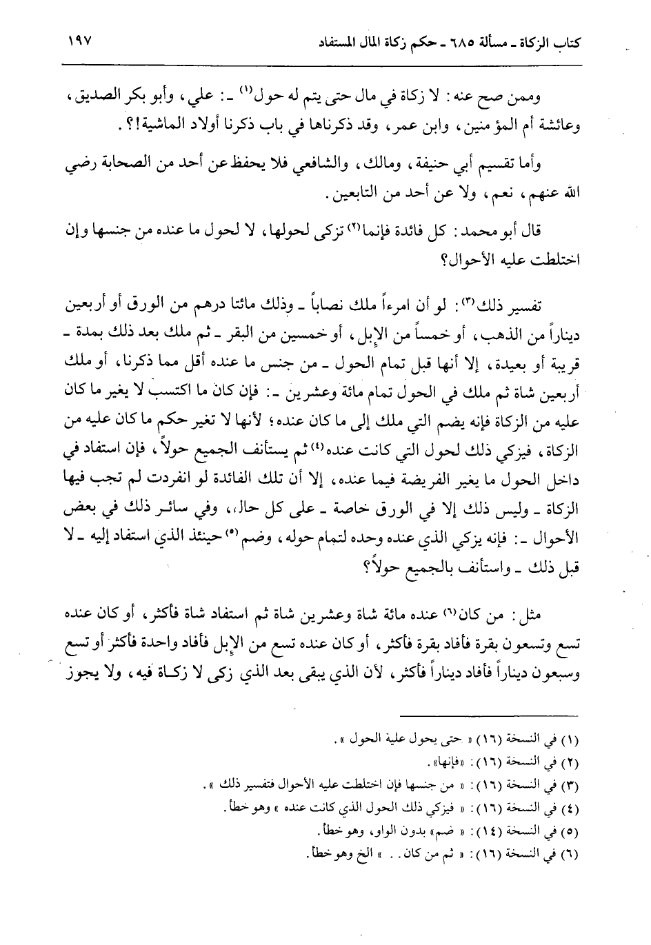 قَالَ أَبُو مُحَمَّدٍ: كُلُّ فَائِدَةٍ فَإِنَّمَا تُزَكَّى لِحَوْلِهَا، لَا لِحَوْلِ مَا عِنْدَهُ مِنْ جِنْسِهَا وَإِنْ اخْتَلَطَتْ عَلَيْهِ الْأَحْوَالُ؟ تَفْسِيرُ ذَلِكَ: لَوْ أَنَّ امْرَأً مَلَكَ نِصَابًا - وَذَلِكَ مِائَتَا دِرْهَمٍ مِنْ الْوَرِقِ أَوْ أَرْبَعِينَ دِينَارًا مِنْ الذَّهَبِ، أَوْ خَمْسًا مِنْ الْإِبِلِ، أَوْ خَمْسِينَ مِنْ الْبَقَرِ - ثُمَّ مَلَكَ بَعْدَ ذَلِكَ بِمُدَّةٍ - قَرِيبَةٍ أَوْ بَعِيدَةٍ، إلَّا أَنَّهَا قَبْلَ تَمَامِ الْحَوْلِ - مِنْ جِنْسِ مَا عِنْدَهُ أَقَلَّ مِمَّا ذَكَرْنَا، أَوْ مَلَكَ أَرْبَعِينَ شَاةً ثُمَّ مَلَكَ فِي الْحَوْلِ تَمَامَ مِائَةٍ وَعِشْرِينَ -: فَإِنْ كَانَ مَا اكْتَسَبَ لَا يُغَيِّرُ مَا كَانَ عَلَيْهِ مِنْ الزَّكَاةِ فَإِنَّهُ يَضُمُّ الَّتِي مَلَكَ إلَى مَا كَانَ عِنْدَهُ؛ لِأَنَّهَا لَا تُغَيِّرُ حُكْمَ مَا كَانَ عَلَيْهِ مِنْ الزَّكَاةِ، فَيُزَكَّى ذَلِكَ لِحَوْلِ الَّتِي كَانَتْ عِنْدَهُ ثُمَّ يَسْتَأْنِفُ الْجَمِيعَ حَوْلًا، فَإِنْ اسْتَفَادَ فِي دَاخِلِ الْحَوْلِ مَا يُغَيِّرُ الْفَرِيضَةَ فِيمَا عِنْدَهُ، إلَّا أَنَّ تِلْكَ الْفَائِدَةَ لَوْ انْفَرَدَتْ لَمْ تَجِبْ فِيهَا الزَّكَاةُ - وَلَيْسَ ذَلِكَ إلَّا فِي الْوَرِقِ خَاصَّةً - عَلَى كُلِّ حَالٍ، وَفِي سَائِرِ ذَلِكَ فِي بَعْضِ الْأَحْوَالِ -: فَإِنَّهُ يُزَكِّي الَّذِي عِنْدَهُ وَحْدَهُ لِتَمَامِ حَوْلِهِ، وَضَمَّ حِينَئِذٍ الَّذِي اسْتَفَادَ إلَيْهِ - لَا قَبْلَ ذَلِكَ - وَاسْتَأْنَفَ بِالْجَمِيعِ حَوْلًا؟ مِثْلُ: مَنْ كَانَ عِنْدَهُ مِائَةُ شَاةٍ وَعِشْرِينَ شَاةً ثُمَّ اسْتَفَادَ شَاةً فَأَكْثَرَ، أَوْ كَانَ عِنْدَهُ تِسْعٌ وَتِسْعُونَ بَقَرَةً فَأَفَادَ بَقَرَةً فَأَكْثَرَ، أَوْ كَانَ عِنْدَهُ تِسْعٌ مِنْ الْإِبِلِ فَأَفَادَ وَاحِدَةً فَأَكْثَرَ أَوْ تِسْعٌ وَسَبْعُونَ دِينَارًا فَأَفَادَ دِينَارًا فَأَكْثَرَ، لِأَنَّ الَّذِي يَبْقَى بَعْدَ الَّذِي زَكَّى لَا زَكَاةَ فِيهِ، وَلَا يَجُوزُ