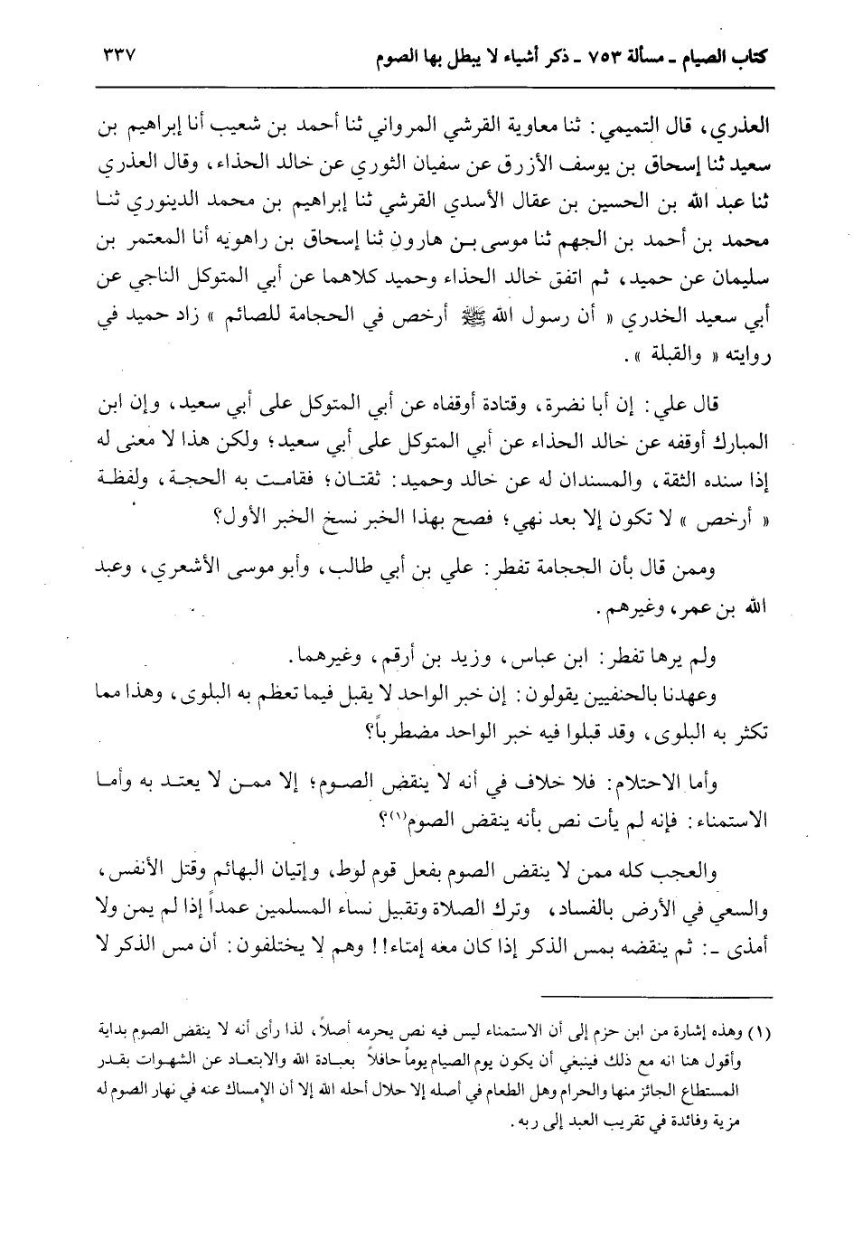 قَالَ عَلِيٌّ: إنَّ أَبَا نَضْرَةَ، وَقَتَادَةَ أَوْقَفَاهُ عَنْ أَبِي الْمُتَوَكِّلِ عَلَى أَبِي سَعِيدٍ، وَإِنَّ ابْنَ الْمُبَارَكِ أَوْقَفَهُ عَنْ خَالِدٍ الْحَذَّاءِ عَنْ أَبِي الْمُتَوَكِّلِ عَلَى أَبِي سَعِيدٍ؛ وَلَكِنْ هَذَا لَا مَعْنَى لَهُ إذْ أَسْنَدَهُ الثِّقَةُ، وَالْمُسْنَدَانِ لَهُ عَنْ خَالِدٍ وَحُمَيْدٍ: ثِقَتَانِ؛ فَقَامَتْ بِهِ الْحُجَّةُ، وَلَفْظَةُ " أَرْخَصَ " لَا تَكُونُ إلَّا بَعْدَ نَهْيٍ؛ فَصَحَّ بِهَذَا الْخَبَرِ نَسْخُ الْخَبَرِ الْأَوَّلِ؟ وَمِمَّنْ قَالَ بِأَنَّ الْحِجَامَةَ تُفْطِرُ: عَلِيُّ بْنُ أَبِي طَالِبٍ، وَأَبُو مُوسَى الْأَشْعَرِيُّ، وَعَبْدُ اللَّهِ بْنُ عُمَرَ، وَغَيْرُهُمْ.