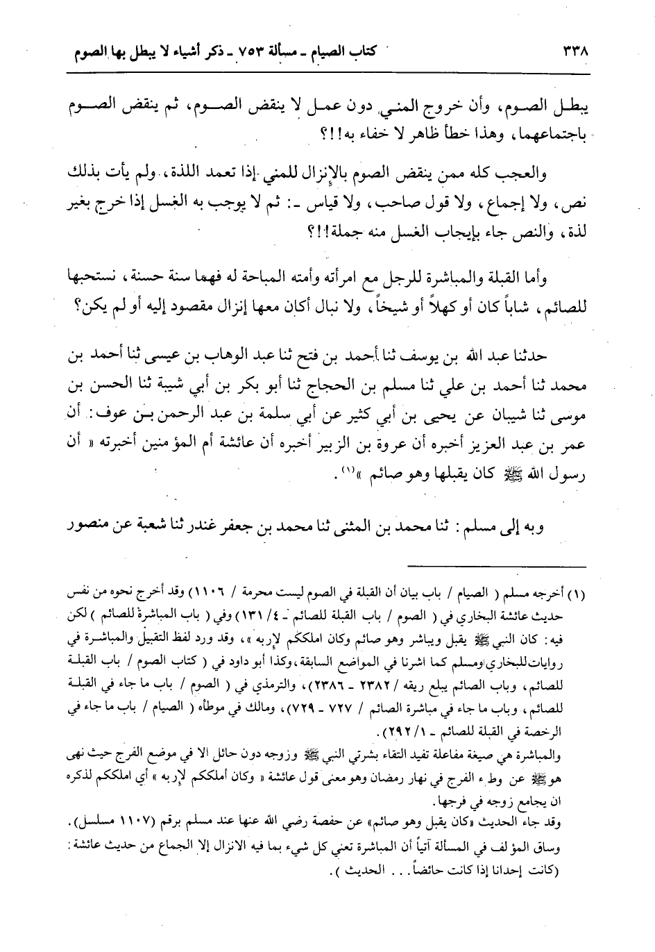 وَأَمَّا الْقُبْلَةُ وَالْمُبَاشَرَةُ لِلرَّجُلِ مَعَ امْرَأَتِهِ وَأَمَتِهِ الْمُبَاحَةِ لَهُ فَهُمَا سُنَّةٌ حَسَنَةٌ، نَسْتَحِبُّهَا لِلصَّائِمِ، شَابًّا كَانَ أَوْ كَهْلًا أَوْ شَيْخًا، وَلَا نُبَالِي أَكَانَ مَعَهَا إنْزَالٌ مَقْصُودٌ إلَيْهِ أَوْ لَمْ يَكُنْ؟ حَدَّثَنَا عَبْدُ اللَّهِ بْنُ يُوسُفَ ثنا أَحْمَدُ بْنُ فَتْحٍ ثنا عَبْدُ الْوَهَّابِ بْنُ عِيسَى ثنا أَحْمَدُ بْنُ مُحَمَّدٍ ثنا أَحْمَدُ بْنُ عَلِيٍّ ثنا مُسْلِمُ بْنُ الْحَجَّاجِ ثنا أَبُو بَكْرِ بْنُ أَبِي شَيْبَةَ ثنا الْحَسَنُ بْنُ مُوسَى ثنا شَيْبَانُ عَنْ يَحْيَى بْنِ أَبِي كَثِيرٍ عَنْ أَبِي سَلَمَةَ بْنِ عَبْدِ الرَّحْمَنِ بْنِ عَوْفٍ: أَنَّ عُمَرَ بْنَ عَبْدِ الْعَزِيزِ أَخْبَرَهُ أَنَّ عُرْوَةَ بْنَ الزُّبَيْرِ أَخْبَرَهُ أَنَّ «عَائِشَةَ أُمَّ الْمُؤْمِنِينَ أَخْبَرَتْهُ أَنَّ رَسُولَ اللَّهِ - صَلَّى اللَّهُ عَلَيْهِ وَسَلَّمَ - كَانَ يُقَبِّلُهَا وَهُوَ صَائِمٌ» .