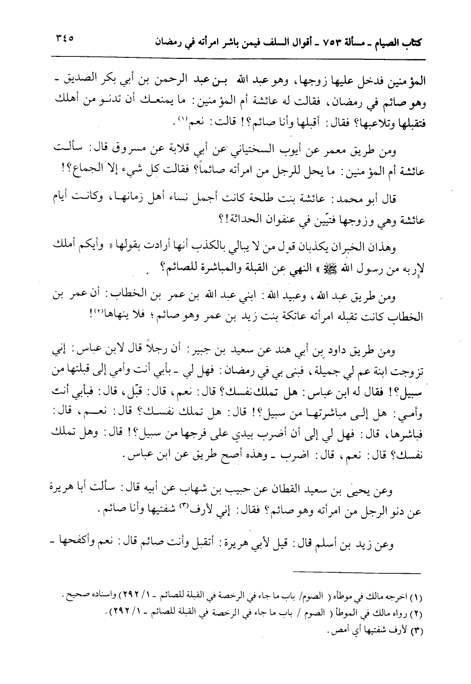 وَمِنْ طَرِيقِ مَعْمَرٍ عَنْ أَيُّوبَ السِّخْتِيَانِيِّ عَنْ أَبِي قِلَابَةَ عَنْ مَسْرُوقٍ قَالَ: سَأَلْت عَائِشَةَ أُمَّ الْمُؤْمِنِينَ: مَا يَحِلُّ لِلرَّجُلِ مِنْ امْرَأَتِهِ صَائِمًا؟ فَقَالَتْ كُلُّ شَيْءٍ إلَّا الْجِمَاعَ؟ قَالَ أَبُو مُحَمَّدٍ: عَائِشَةُ بِنْتُ طَلْحَةَ كَانَتْ أَجْمَلَ نِسَاءِ أَهْلِ زَمَانِهَا، وَكَانَتْ أَيَّامَ عَائِشَةَ وَهِيَ وَزَوْجُهَا فَتِيَّيْنِ فِي عُنْفُوَانِ الْحَدَاثَةِ؟ وَهَذَانِ الْخَبَرَانِ يُكَذِّبَانِ قَوْلَ مَنْ لَا يُبَالِي بِالْكَذِبِ أَنَّهَا أَرَادَتْ بِقَوْلِهَا «وَأَيُّكُمْ أَمْلَكُ لِإِرْبِهِ مِنْ رَسُولِ اللَّهِ - صَلَّى اللَّهُ عَلَيْهِ وَسَلَّمَ -» النَّهْيَ مِنْ الْقُبْلَةِ وَالْمُبَاشَرَةِ لِلصَّائِمِ؟ وَمِنْ طَرِيقِ عَبْدِ اللَّهِ، وَعُبَيْدِ اللَّهِ: ابْنَيْ عَبْدِ اللَّهِ بْنِ عُمَرَ بْنِ الْخَطَّابِ: أَنَّ عُمَرَ بْنَ الْخَطَّابِ كَانَتْ تُقَبِّلُهُ امْرَأَتُهُ عَاتِكَةُ بِنْتُ زَيْدِ بْنِ عَمْرٍو وَهُوَ صَائِمٌ؛ فَلَا يَنْهَاهَا وَمِنْ طَرِيقِ دَاوُد بْنِ أَبِي هِنْدٍ عَنْ سَعِيدِ بْنِ جُبَيْرٍ: أَنَّ رَجُلًا قَالَ لِابْنِ عَبَّاسٍ: إنِّي تَزَوَّجْت ابْنَةَ عَمٍّ لِي جَمِيلَةً، فَبَنَيْتُ بِهَا فِي رَمَضَانَ: فَهَلْ لِي - بِأَبِي أَنْتَ وَأُمِّي إلَى قُبْلَتِهَا مِنْ سَبِيلٍ؟ فَقَالَ لَهُ ابْنُ عَبَّاسٍ: هَلْ تَمْلِكُ نَفْسَكَ؟ قَالَ: نَعَمْ، قَالَ: قَبِّلْ، قَالَ: فَبِأَبِي أَنْتَ وَأُمِّي: هَلْ إلَى مُبَاشَرَتِهَا مِنْ سَبِيلٍ؟ قَالَ: هَلْ تَمْلِكُ نَفْسَكَ؟ قَالَ: نَعَمْ، قَالَ: فَبَاشِرْهَا، قَالَ: فَهَلْ لِي إلَى أَنْ أَضْرِبَ بِيَدِي عَلَى فَرْجِهَا مِنْ سَبِيلٍ؟ قَالَ: وَهَلْ تَمْلِكُ نَفْسَكَ؟ قَالَ: نَعَمْ، قَالَ: اضْرِبْ - وَهَذِهِ أَصَحُّ طَرِيقٍ عَنْ ابْنِ عَبَّاسٍ.
