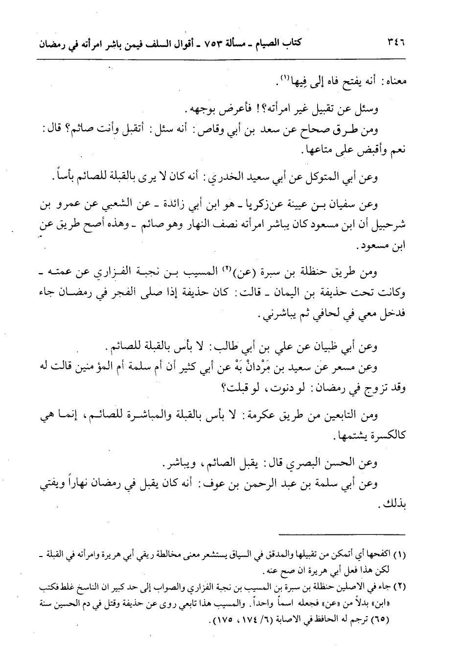 وَعَنْ سُفْيَانَ بْنِ عُيَيْنَةَ عَنْ زَكَرِيَّا هُوَ ابْنُ أَبِي زَائِدَةَ - عَنْ الشَّعْبِيِّ عَنْ عَمْرِو بْنِ شُرَحْبِيلَ أَنَّ ابْنَ مَسْعُودٍ كَانَ يُبَاشِرُ امْرَأَتَهُ نِصْفَ النَّهَارِ وَهُوَ صَائِمٌ - وَهَذِهِ أَصَحُّ طَرِيقٍ عَنْ ابْنِ مَسْعُودٍ.