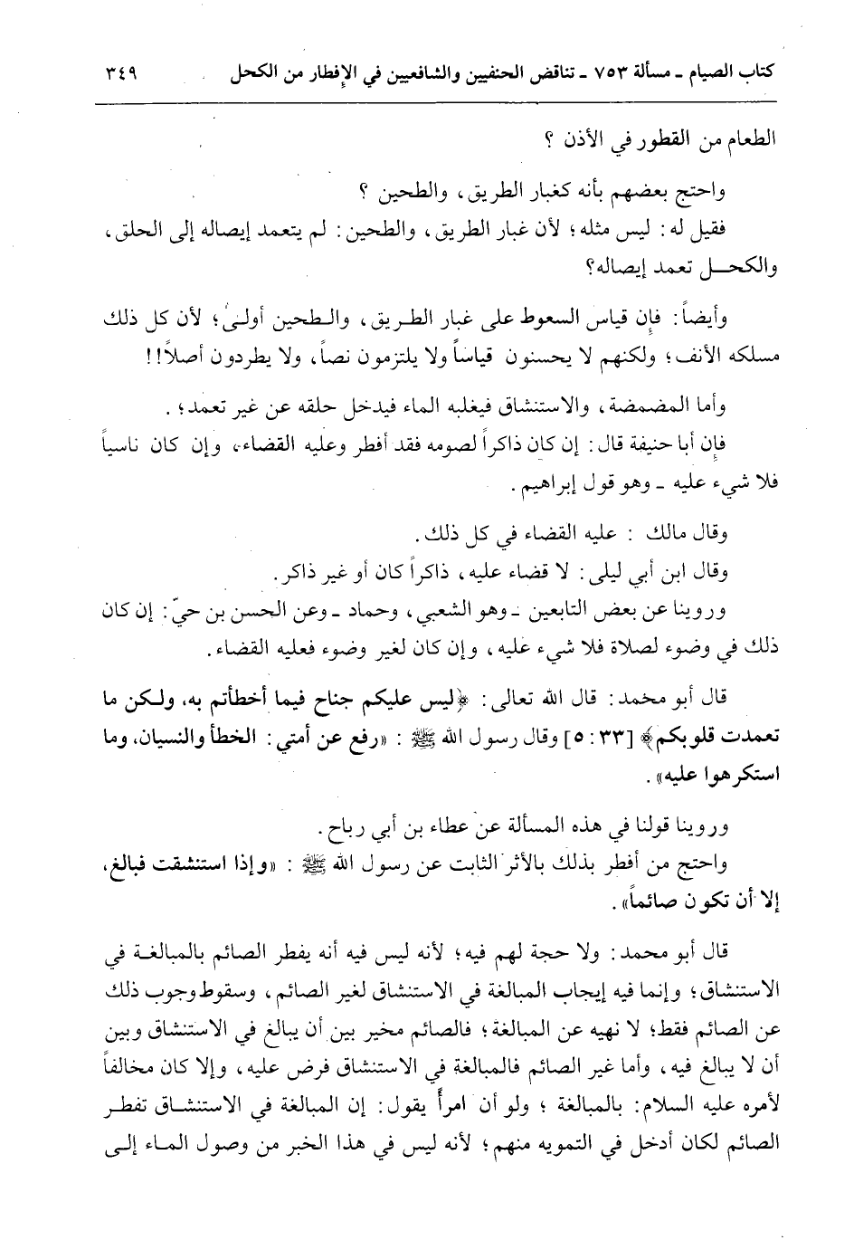 الطَّعَامِ مِنْ الْقُطُورِ فِي الْأُذُنِ؟ وَاحْتَجَّ بَعْضُهُمْ بِأَنَّهُ كَغُبَارِ الطَّرِيقِ، وَالطَّحِينِ؟ فَقِيلَ لَهُ: لَيْسَ مِثْلَهُ؛ لِأَنَّ غُبَارَ الطَّرِيقِ، وَالطَّحِينِ: لَمْ يَتَعَمَّدْ إيصَالَهُ إلَى الْحَلْقِ، وَالْكُحْلُ تَعَمَّدَ إيصَالَهُ؟ وَأَيْضًا: فَإِنَّ قِيَاسَ السَّعُوطِ عَلَى غُبَارِ الطَّرِيقِ، وَالطَّحِينِ أَوْلَى؛ لِأَنَّ كُلَّ ذَلِكَ مَسْلَكُهُ الْأَنْفُ؛ وَلَكِنَّهُمْ لَا يُحْسِنُونَ قِيَاسًا وَلَا يَلْتَزِمُونَ نَصًّا، وَلَا يَطْرُدُونَ أَصْلًا وَأَمَّا الْمَضْمَضَةُ، وَالِاسْتِنْشَاقُ فَيَغْلِبُهُ الْمَاءُ فَيَدْخُلُ حَلْقَهُ عَنْ غَيْرِ تَعَمُّدٍ.