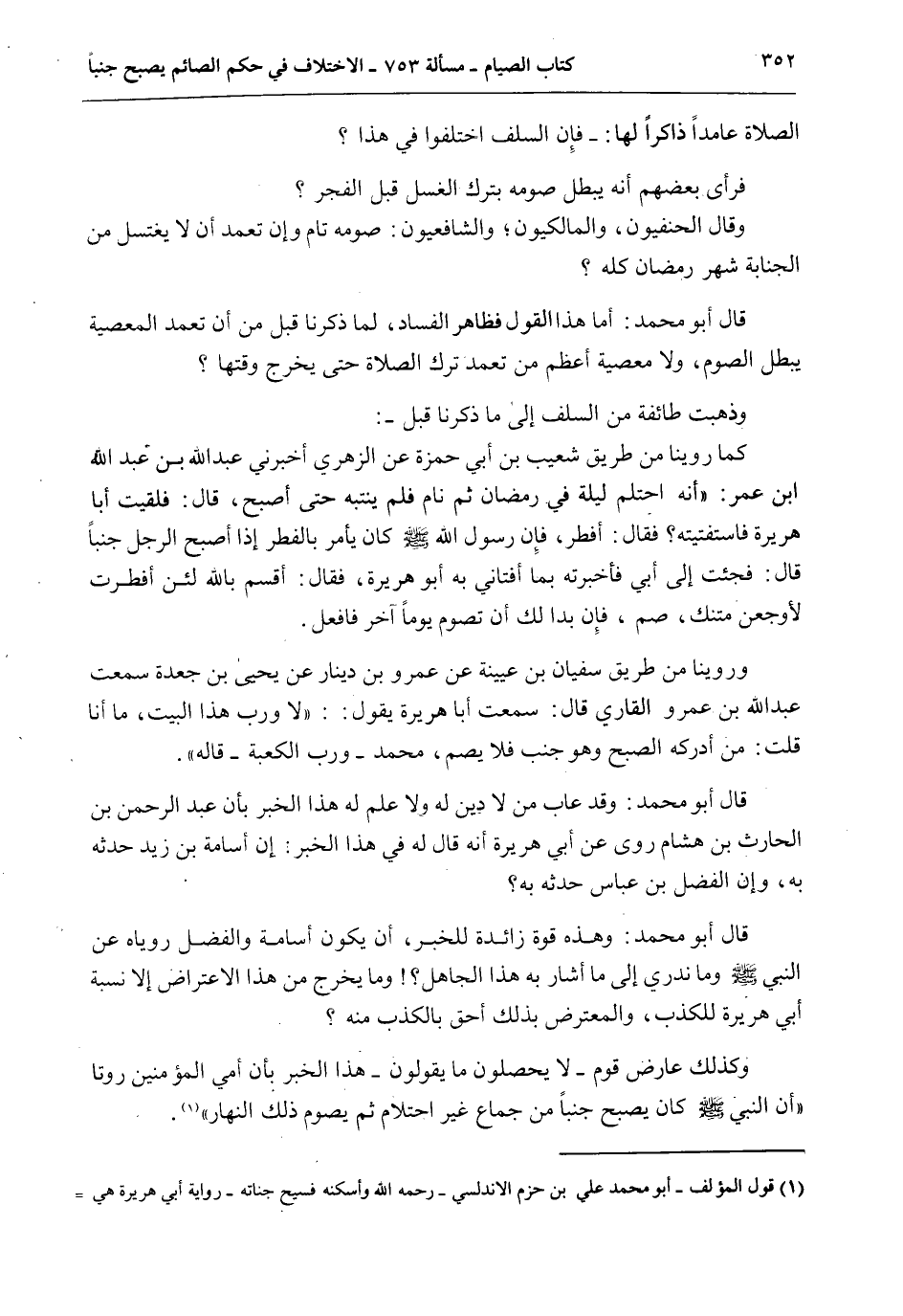 قَالَ أَبُو مُحَمَّدٍ: وَقَدْ عَابَ مَنْ لَا دِينَ لَهُ وَلَا عِلْمَ لَهُ هَذَا الْخَبَرَ بِأَنَّ عَبْدَ الرَّحْمَنِ بْنَ الْحَارِثِ بْنِ هِشَامٍ رَوَى عَنْ أَبِي هُرَيْرَةَ أَنَّهُ قَالَ لَهُ فِي هَذَا الْخَبَرِ: إنَّ أُسَامَةَ بْنَ زَيْدٍ حَدَّثَهُ بِهِ، وَإِنَّ الْفَضْلَ بْنَ عَبَّاسٍ حَدَّثَهُ بِهِ؟ قَالَ أَبُو مُحَمَّدٍ: وَهَذِهِ قُوَّةٌ زَائِدَةٌ لِلْخَبَرِ، أَنْ يَكُونَ أُسَامَةُ وَالْفَضْلُ رَوَيَاهُ عَنْ النَّبِيِّ - صَلَّى اللَّهُ عَلَيْهِ وَسَلَّمَ - وَمَا نَدْرِي إلَى مَا أَشَارَ بِهِ هَذَا الْجَاهِلُ؟ وَمَا يَخْرُجُ مِنْ هَذَا الِاعْتِرَاضِ إلَّا نِسْبَةُ أَبِي هُرَيْرَةَ لِلْكَذِبِ، وَالْمُعْتَرِضُ بِذَلِكَ أَحَقُّ بِالْكَذِبِ مِنْهُ؟ وَكَذَلِكَ عَارَضَ قَوْمٌ - لَا يُحَصِّلُونَ مَا يَقُولُونَ - هَذَا الْخَبَرَ بِأَنَّ أُمَّيْ الْمُؤْمِنِينَ رَوَتَا «أَنَّ النَّبِيَّ - صَلَّى اللَّهُ عَلَيْهِ وَسَلَّمَ - كَانَ يُصْبِحُ جُنُبًا مِنْ جِمَاعٍ غَيْرِ احْتِلَامٍ ثُمَّ يَصُومُ ذَلِكَ النَّهَارَ» .