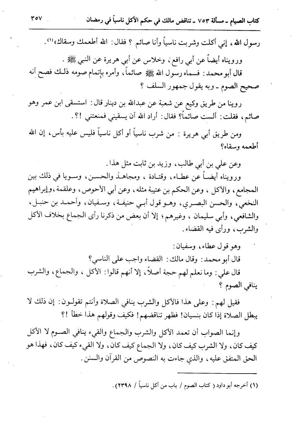 وَمِنْ طَرِيقِ أَبِي هُرَيْرَةَ: مَنْ شَرِبَ نَاسِيًا أَوْ أَكَلَ نَاسِيًا فَلَيْسَ عَلَيْهِ بَأْسٌ، إنَّ اللَّهَ أَطْعَمَهُ وَسَقَاهُ؟ وَعَنْ عَلِيِّ بْنِ أَبِي طَالِبٍ، وَزَيْدِ بْنِ ثَابِتٍ مِثْلُ هَذَا.