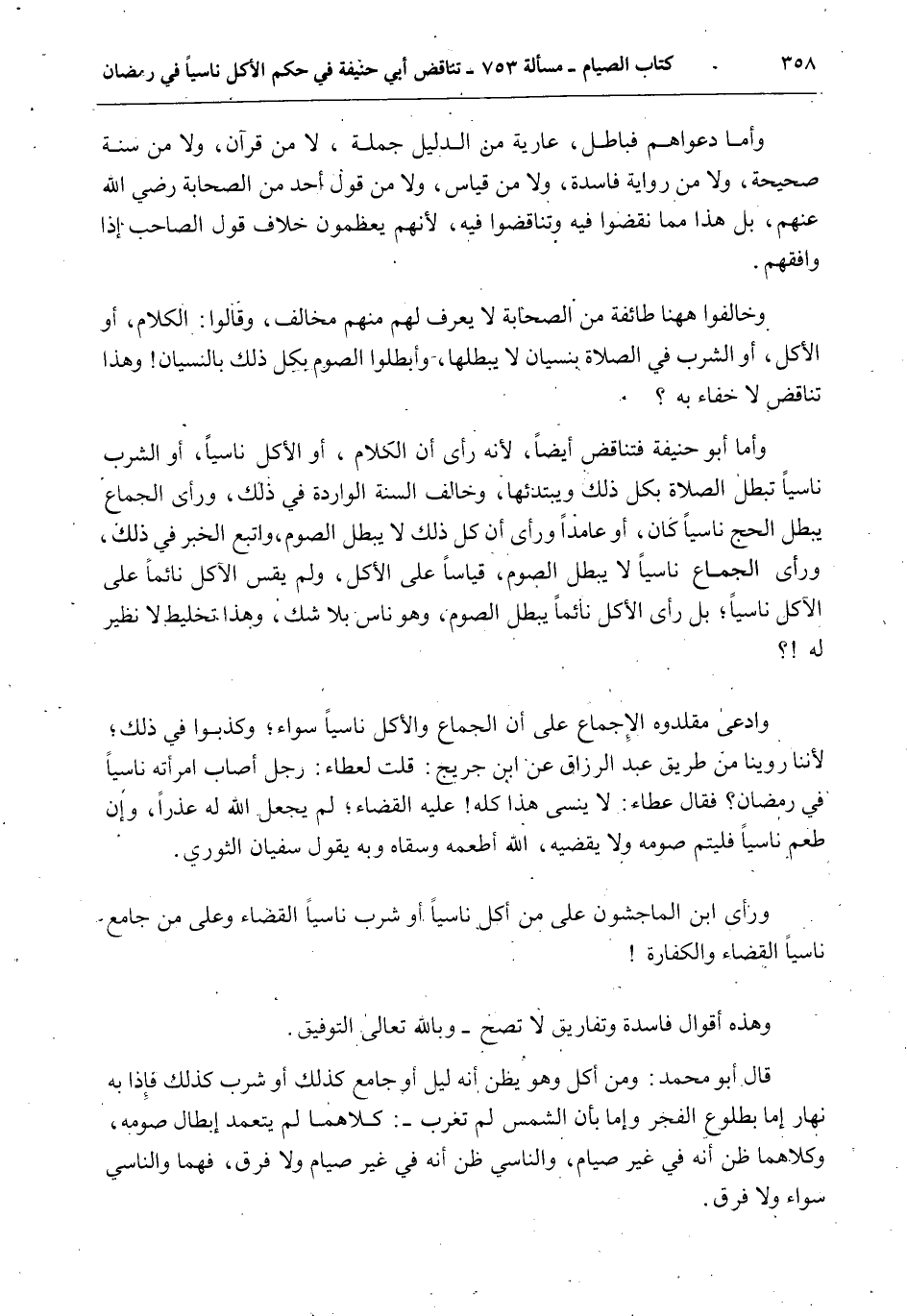 وَأَمَّا دَعْوَاهُمْ فَبَاطِلٌ، عَارِيَّةٌ مِنْ الدَّلِيلِ جُمْلَةً، لَا مِنْ قُرْآنٍ، وَلَا مِنْ سُنَّةٍ صَحِيحَةٍ، وَلَا مِنْ رِوَايَةٍ فَاسِدَةٍ، وَلَا مِنْ قِيَاسٍ، وَلَا مِنْ قَوْلِ أَحَدٍ مِنْ الصَّحَابَةِ - رَضِيَ اللَّهُ عَنْهُمْ -، بَلْ هَذَا مِمَّا نَقَضُوا فِيهِ وَتَنَاقَضُوا فِيهِ، لِأَنَّهُمْ يُعَظِّمُونَ خِلَافَ قَوْلِ الصَّاحِبِ إذَا وَافَقَهُمْ. وَخَالَفُوا هَاهُنَا طَائِفَةً مِنْ الصَّحَابَةِ لَا يُعْرَفُ لَهُمْ مِنْهُمْ مُخَالِفٌ، وَقَالُوا: الْكَلَامُ، أَوْ الْأَكْلُ، أَوْ الشُّرْبُ فِي الصَّلَاةِ بِنِسْيَانٍ لَا يُبْطِلُهَا، وَأَبْطَلُوا الصَّوْمَ بِكُلِّ ذَلِكَ بِالنِّسْيَانِ وَهَذَا تَنَاقُضٌ لَا خَفَاءَ بِهِ؟ وَأَمَّا أَبُو حَنِيفَةَ فَتَنَاقَضَ أَيْضًا، لِأَنَّهُ رَأَى أَنَّ الْكَلَامَ، أَوْ الْأَكْلَ نَاسِيًا، أَوْ الشُّرْبَ نَاسِيًا تَبْطُلُ الصَّلَاةُ بِكُلِّ ذَلِكَ وَيَبْتَدِئُهَا، وَخَالَفَ السُّنَّةَ الْوَارِدَةَ فِي ذَلِكَ، وَرَأَى الْجِمَاعَ يُبْطِلُ الْحَجَّ نَاسِيًا كَانَ أَوْ عَامِدًا وَرَأَى أَنَّ كُلَّ ذَلِكَ لَا يُبْطِلُ الصَّوْمَ، وَاتَّبَعَ الْخَبَرَ فِي ذَلِكَ، وَرَأَى الْجِمَاعَ نَاسِيًا لَا يُبْطِلُ الصَّوْمَ، قِيَاسًا عَلَى الْأَكْلِ، وَلَمْ يَقِسْ الْآكِلَ نَائِمًا عَلَى الْآكِلِ نَاسِيًا؛ بَلْ رَأَى الْأَكْلَ نَائِمًا يُبْطِلُ الصَّوْمَ، وَهُوَ نَاسٍ بِلَا شَكٍّ، وَهَذَا تَخْلِيطٌ لَا نَظِيرَ لَهُ؟ وَادَّعَى مُقَلِّدُوهُ الْإِجْمَاعَ عَلَى أَنَّ الْجِمَاعَ وَالْأَكْلَ نَاسِيًا سَوَاءٌ؛ وَكَذَبُوا فِي ذَلِكَ؛ لِأَنَّنَا رُوِّينَا مِنْ طَرِيقِ عَبْدِ الرَّزَّاقِ عَنْ ابْنِ جُرَيْجٍ: قُلْت لِعَطَاءٍ: رَجُلٌ أَصَابَ امْرَأَتَهُ نَاسِيًا فِي رَمَضَانَ؟ فَقَالَ عَطَاءٌ: لَا يَنْسَى هَذَا كُلَّهُ عَلَيْهِ الْقَضَاءُ؛ لَمْ يَجْعَلْ اللَّهُ لَهُ عُذْرًا، وَإِنْ طَعِمَ نَاسِيًا فَلْيُتِمَّ صَوْمَهُ وَلَا يَقْضِيهِ، اللَّهُ أَطْعَمَهُ وَسَقَاهُ وَبِهِ يَقُولُ سُفْيَانُ الثَّوْرِيُّ.