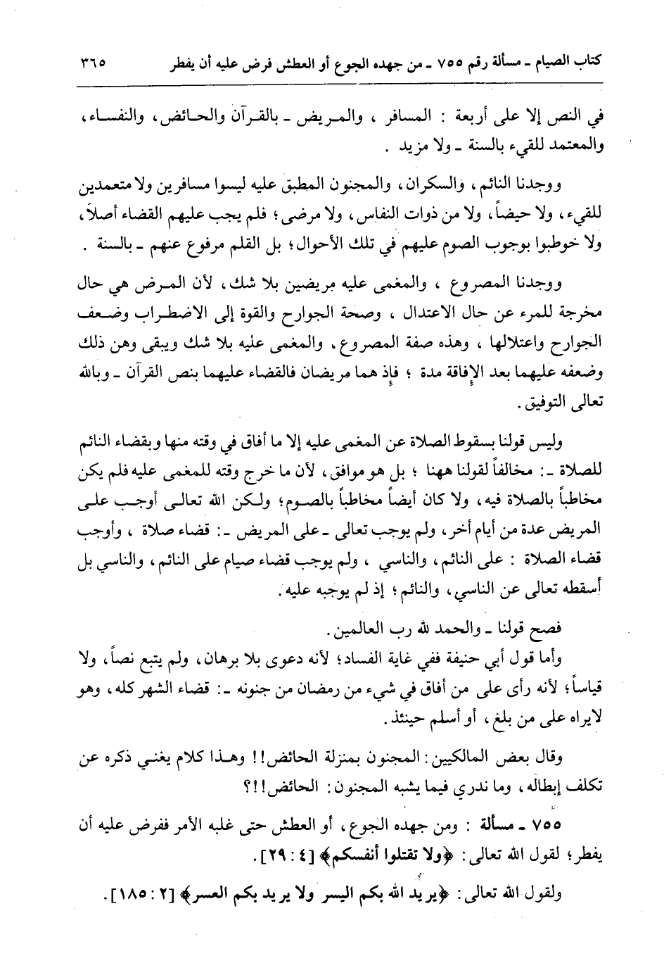 ؟ 755 - مَسْأَلَةٌ: وَمَنْ جَهَدَهُ الْجُوعُ، أَوْ الْعَطَشُ حَتَّى غَلَبَهُ الْأَمْرُ فَفَرْضٌ عَلَيْهِ أَنْ يُفْطِرَ؛ لِقَوْلِ اللَّهِ تَعَالَى: {وَلا تَقْتُلُوا أَنْفُسَكُمْ} [النساء: 29] . وَلِقَوْلِ اللَّهِ تَعَالَى: {يُرِيدُ اللَّهُ بِكُمُ الْيُسْرَ وَلا يُرِيدُ بِكُمُ الْعُسْرَ} [البقرة: 185] .