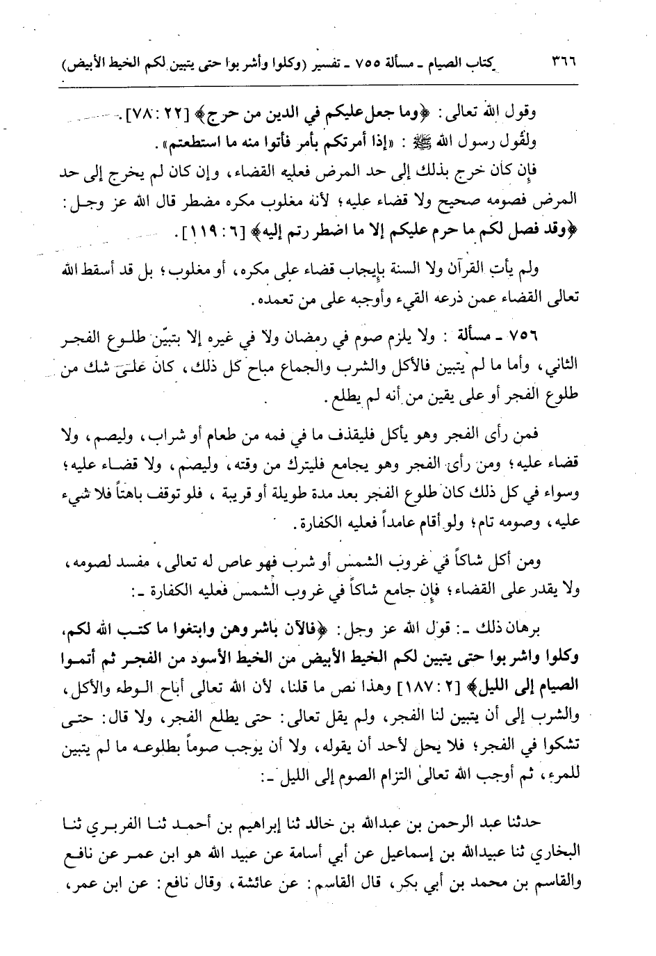 وَمَنْ أَكَلَ شَاكًّا فِي غُرُوبِ الشَّمْسِ أَوْ شَرِبَ فَهُوَ عَاصٍ لَهُ تَعَالَى، مُفْسِدٌ لِصَوْمِهِ، وَلَا يَقْدِرُ عَلَى - الْقَضَاءِ؛ فَإِنْ جَامَعَ شَاكًّا فِي غُرُوبِ الشَّمْسِ فَعَلَيْهِ الْكَفَّارَةُ -: بُرْهَانُ ذَلِكَ -: قَوْلُ اللَّهِ عَزَّ وَجَلَّ: {فَالآنَ بَاشِرُوهُنَّ وَابْتَغُوا مَا كَتَبَ اللَّهُ لَكُمْ وَكُلُوا وَاشْرَبُوا حَتَّى يَتَبَيَّنَ لَكُمُ الْخَيْطُ الأَبْيَضُ مِنَ الْخَيْطِ الأَسْوَدِ مِنَ الْفَجْرِ ثُمَّ أَتِمُّوا الصِّيَامَ إِلَى اللَّيْلِ} [البقرة: 187] وَهَذَا نَصُّ مَا قُلْنَا، لِأَنَّ اللَّهَ تَعَالَى أَبَاحَ الْوَطْءَ وَالْأَكْلَ وَالشُّرْبَ إلَى أَنْ يَتَبَيَّنَ لَنَا الْفَجْرُ، وَلَمْ يَقُلْ تَعَالَى: حَتَّى يَطْلُعَ الْفَجْرُ، وَلَا قَالَ: حَتَّى تَشُكُّوا فِي الْفَجْرِ؛ فَلَا يَحِلُّ لِأَحَدٍ أَنْ يَقُولَهُ، وَلَا أَنْ يُوجِبَ صَوْمًا بِطُلُوعِهِ مَا لَمْ يَتَبَيَّنْ لِلْمَرْءِ، ثُمَّ أَوْجَبَ اللَّهُ تَعَالَى الْتِزَامَ الصَّوْمِ إلَى اللَّيْلِ -: حَدَّثَنَا عَبْدُ الرَّحْمَنِ بْنُ عَبْدِ اللَّهِ بْنِ خَالِدٍ ثنا إبْرَاهِيمُ بْنُ أَحْمَدَ ثنا الْفَرَبْرِيُّ ثنا الْبُخَارِيُّ ثنا عُبَيْدُ اللَّهِ بْنُ إسْمَاعِيلَ عَنْ أَبِي أُسَامَةَ عَنْ عُبَيْدِ اللَّهِ هُوَ ابْنُ عُمَرَ عَنْ نَافِعٍ وَالْقَاسِمِ بْنِ مُحَمَّدِ بْنِ أَبِي بَكْرٍ، قَالَ الْقَاسِمُ: عَنْ عَائِشَةَ، وَقَالَ نَافِعٌ: عَنْ ابْنِ عُمَرَ،