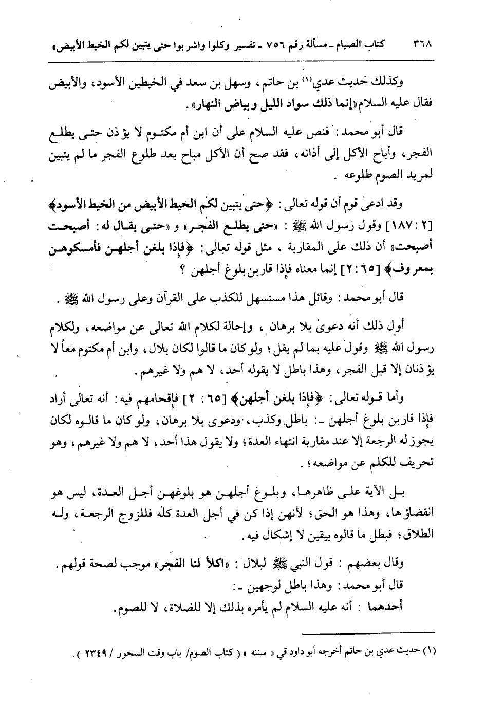 وَكَذَلِكَ حَدِيثُ عَدِيِّ بْنِ حَاتِمٍ، وَسَهْلِ بْنِ سَعْدٍ فِي الْخَيْطَيْنِ الْأَسْوَدِ، وَالْأَبْيَضِ فَقَالَ - عَلَيْهِ السَّلَامُ - «إنَّمَا ذَلِكَ سَوَادُ اللَّيْلِ وَبَيَاضُ النَّهَارِ» . قَالَ أَبُو مُحَمَّدٍ: فَنَصَّ - عَلَيْهِ السَّلَامُ - عَلَى أَنَّ ابْنَ أُمِّ مَكْتُومٍ لَا يُؤَذِّنُ حَتَّى يَطْلُعَ الْفَجْرُ، وَأَبَاحَ الْأَكْلَ إلَى أَذَانِهِ، فَقَدْ صَحَّ أَنَّ الْأَكْلَ مُبَاحٌ بَعْدَ طُلُوعِ الْفَجْرِ مَا لَمْ يَتَبَيَّنْ لِمُرِيدِ الصَّوْمِ طُلُوعُهُ. وَقَدْ ادَّعَى قَوْمٌ أَنَّ قَوْله تَعَالَى: {حَتَّى يَتَبَيَّنَ لَكُمُ الْخَيْطُ الأَبْيَضُ مِنَ الْخَيْطِ الأَسْوَدِ} [البقرة: 187] وَقَوْلَ رَسُولِ اللَّهِ - صَلَّى اللَّهُ عَلَيْهِ وَآلِهِ وَسَلَّمَ -: «حَتَّى يَطْلُعَ الْفَجْرُ وَحَتَّى يُقَالَ لَهُ: أَصْبَحْتَ أَصْبَحْتَ» أَنَّ ذَلِكَ عَلَى الْمُقَارِبَةِ، مِثْلُ قَوْله تَعَالَى: {فَإِذَا بَلَغْنَ أَجَلَهُنَّ فَأَمْسِكُوهُنَّ بِمَعْرُوفٍ} [الطلاق: 2] إنَّمَا مَعْنَاهُ فَإِذَا قَارَبْنَ بُلُوغَ أَجَلِهِنَّ، قَالَ أَبُو مُحَمَّدٍ: وَقَائِلُ هَذَا مُسْتَسْهِلٌ لِلْكَذِبِ عَلَى الْقُرْآنِ وَعَلَى رَسُولِ اللَّهِ - صَلَّى اللَّهُ عَلَيْهِ وَآلِهِ وَسَلَّمَ -. أَوَّلُ ذَلِكَ أَنَّهُ دَعْوَى بِلَا بُرْهَانٍ، وَإِحَالَةٌ لِكَلَامِ اللَّهِ تَعَالَى عَنْ مَوَاضِعِهِ، وَلِكَلَامِ رَسُولِ اللَّهِ - صَلَّى اللَّهُ عَلَيْهِ وَآلِهِ وَسَلَّمَ - وَقَوْلٌ عَلَيْهِ بِمَا لَمْ يَقُلْ؛ وَلَوْ كَانَ مَا قَالُوا لَكَانَ بِلَالُ، وَابْنُ أُمِّ مَكْتُومٍ مَعًا لَا يُؤَذِّنَانِ إلَّا قَبْلَ الْفَجْرِ، وَهَذَا بَاطِلٌ لَا يَقُولُهُ أَحَدٌ، لَا هُمْ وَلَا غَيْرُهُمْ.