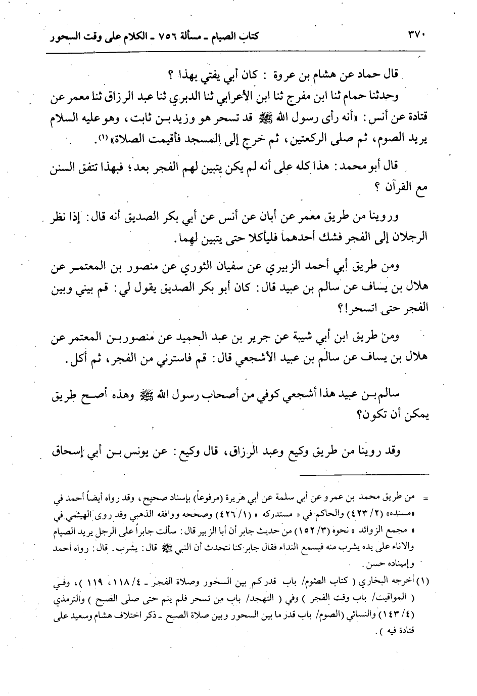 قَالَ حَمَّادٌ عَنْ هِشَامِ بْنِ عُرْوَةَ: كَانَ أَبِي يُفْتِي بِهَذَا؟ وَحَدَّثَنَا حُمَامٌ ثنا ابْنِ مُفَرِّجٍ ثنا ابْنُ الْأَعْرَابِيِّ ثنا الدَّبَرِيُّ ثنا عَبْدُ الرَّزَّاقِ ثنا مَعْمَرٌ عَنْ قَتَادَةَ «عَنْ أَنَسٍ: أَنَّهُ رَأَى رَسُولَ اللَّهِ - صَلَّى اللَّهُ عَلَيْهِ وَآلِهِ وَسَلَّمَ - قَدْ تَسَحَّرَ هُوَ وَزَيْدُ بْنُ ثَابِتٍ، وَهُوَ - عَلَيْهِ السَّلَامُ - يُرِيدُ الصَّوْمَ، ثُمَّ صَلَّى الرَّكْعَتَيْنِ، ثُمَّ خَرَجَ إلَى الْمَسْجِدِ فَأُقِيمَتْ الصَّلَاةُ» . قَالَ أَبُو مُحَمَّدٍ: هَذَا كُلُّهُ عَلَى أَنَّهُ لَمْ يَكُنْ يَتَبَيَّنُ لَهُمْ الْفَجْرُ بَعْدُ؛ فَبِهَذَا تَتَّفِقُ السُّنَنُ مَعَ الْقُرْآنِ؟ وَرُوِّينَا مِنْ طَرِيقِ مَعْمَرٍ عَنْ أَبَانَ عَنْ أَنَسٍ عَنْ أَبِي بَكْرٍ الصِّدِّيقِ أَنَّهُ قَالَ: إذَا نَظَرَ الرَّجُلَانِ إلَى الْفَجْرِ فَشَكَّ أَحَدُهُمَا فَلْيَأْكُلَا حَتَّى يَتَبَيَّنَ لَهُمَا.