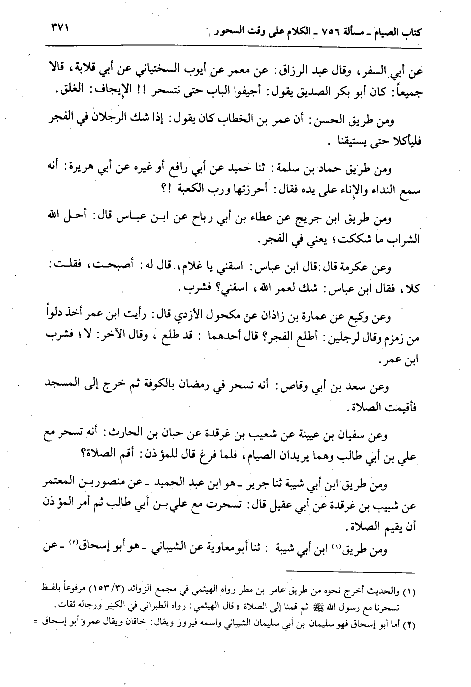وَمِنْ طَرِيقِ حَمَّادِ بْنِ سَلَمَةَ: ثنا حُمَيْدٍ عَنْ أَبِي رَافِعٍ أَوْ غَيْرِهِ عَنْ أَبِي هُرَيْرَةَ: أَنَّهُ سَمِعَ النِّدَاءَ وَالْإِنَاءُ عَلَى يَدِهِ فَقَالَ: أَحْرَزْتُهَا وَرَبِّ الْكَعْبَةِ؟ وَمِنْ طَرِيقِ ابْنِ جُرَيْجٍ عَنْ عَطَاءِ بْنِ أَبِي رَبَاحٍ عَنْ ابْنِ عَبَّاسٍ قَالَ: أَحَلَّ اللَّهُ الشَّرَابَ مَا شَكَكْتَ؛ يَعْنِي فِي الْفَجْرِ.