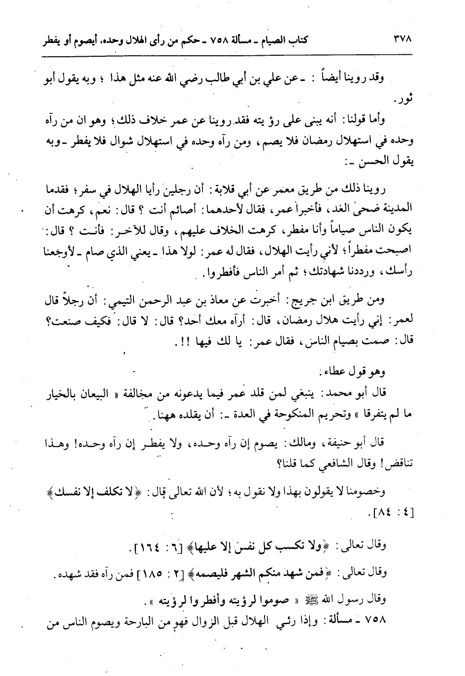 وَقَدْ رُوِّينَا أَيْضًا: - عَنْ عَلِيِّ بْنِ أَبِي طَالِبٍ - رَضِيَ اللَّهُ عَنْهُ - مِثْلَ هَذَا؛ وَبِهِ يَقُولُ أَبُو ثَوْرٍ. وَأَمَّا قَوْلُنَا: أَنَّهُ يُبْنَى عَلَى رُؤْيَتِهِ فَقَدْ رُوِّينَا عَنْ عُمَرَ خِلَافَ ذَلِكَ؛ وَهُوَ أَنَّ مَنْ رَآهُ وَحْدَهُ فِي اسْتِهْلَالِ رَمَضَانَ فَلَا يَصُمْ، وَمَنْ رَآهُ وَحْدَهُ فِي اسْتِهْلَالِ شَوَّالٍ فَلَا يُفْطِرُ - وَبِهِ يَقُولُ الْحَسَنُ -: رُوِّينَا ذَلِكَ مِنْ طَرِيقِ مَعْمَرٍ عَنْ أَبِي قِلَابَةَ: أَنَّ رَجُلَيْنِ رَأَيَا الْهِلَالَ فِي سَفَرٍ؛ فَقَدِمَا الْمَدِينَةَ ضُحَى الْغَدِ، فَأَخْبَرَا عُمَرَ، فَقَالَ لِأَحَدِهِمَا: أَصَائِمٌ أَنْتَ؟ قَالَ: نَعَمْ، كَرِهْت أَنْ يَكُونَ النَّاسُ صِيَامًا وَأَنَا مُفْطِرٌ، كَرِهْت الْخِلَافَ عَلَيْهِمْ، وَقَالَ لِلْآخِرِ: فَأَنْتَ؟ قَالَ: أَصْبَحْت مُفْطِرًا؛ لِأَنِّي رَأَيْت الْهِلَالَ، فَقَالَ لَهُ عُمَرُ: لَوْلَا هَذَا - يَعْنِي الَّذِي صَامَ - لَأَوْجَعْنَا رَأْسَكَ، وَرَدَدْنَا شَهَادَتَكَ؛ ثُمَّ أَمَرَ النَّاسَ فَأَفْطَرُوا. وَمِنْ طَرِيقِ ابْنِ جُرَيْجٍ: أُخْبِرْت عَنْ مُعَاذِ بْنِ عَبْدِ الرَّحْمَنِ التَّيْمِيِّ: أَنَّ رَجُلًا قَالَ لِعُمَرَ: إنِّي رَأَيْت هِلَالَ رَمَضَانَ، قَالَ: أَرَآهُ مَعَكَ أَحَدٌ؟ قَالَ: لَا قَالَ: فَكَيْف صَنَعْت؟ قَالَ: صُمْت بِصِيَامِ النَّاسِ، فَقَالَ عُمَرُ: يَا لَكَ فِيهَا. وَهُوَ قَوْلُ عَطَاءٍ: قَالَ أَبُو مُحَمَّدٍ: يَنْبَغِي لِمَنْ قَلَّدَ عُمَرَ فِيمَا يَدْعُونَهُ مِنْ مُخَالَفَةِ «الْبَيِّعَانِ بِالْخِيَارِ مَا لَمْ يَتَفَرَّقَا» وَتَحْرِيمِ الْمَنْكُوحَةِ فِي الْعِدَّةِ -: أَنْ يُقَلِّدَهُ هَاهُنَا.