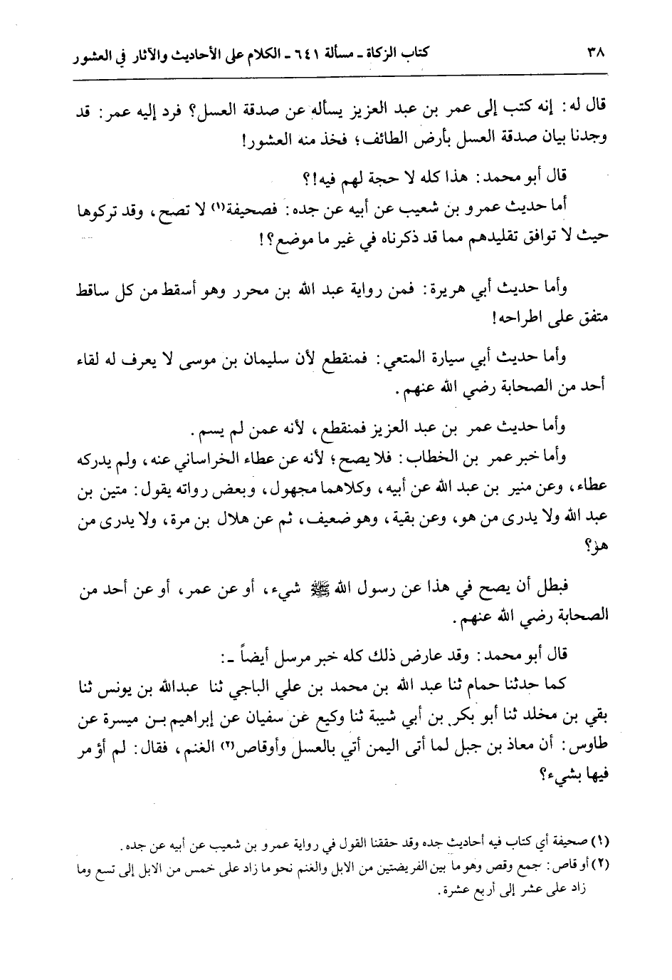قَالَ لَهُ: إنَّهُ كَتَبَ إلَى عُمَرَ بْنِ عَبْدِ الْعَزِيزِ يَسْأَلُهُ عَنْ صَدَقَةِ الْعَسَلِ. فَرَدَّ إلَيْهِ عُمَرُ: قَدْ وَجَدْنَا بَيَانَ صَدَقَةِ الْعَسَلِ بِأَرْضِ الطَّائِفِ؛ فَخُذْ مِنْهُ الْعُشُورَ قَالَ أَبُو مُحَمَّدٍ: هَذَا كُلُّهُ لَا حُجَّةَ لَهُمْ فِيهِ.