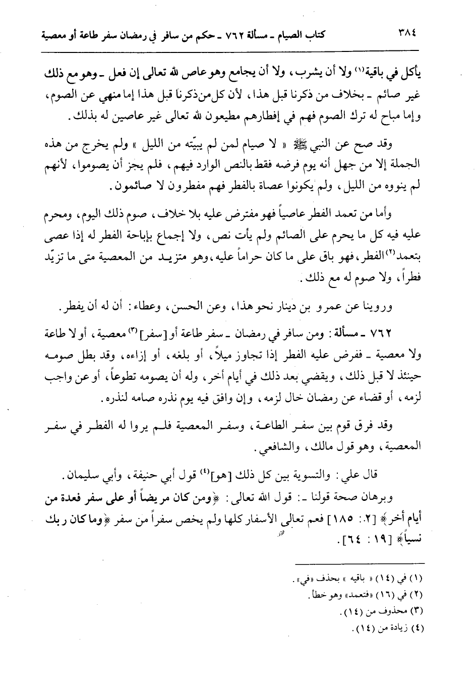 762 - مَسْأَلَةٌ: وَمَنْ سَافَرَ فِي رَمَضَانَ - سَفَرَ طَاعَةٍ أَوْ [سَفَرَ] مَعْصِيَةٍ، أَوْ لَا طَاعَةَ وَلَا مَعْصِيَةَ - فَفَرْضٌ عَلَيْهِ الْفِطْرُ إذَا تَجَاوَزَ مِيلًا، أَوْ بَلَغَهُ، أَوْ إزَاءَهُ، وَقَدْ بَطَلَ صَوْمُهُ حِينَئِذٍ لَا قَبْلَ ذَلِكَ، وَيَقْضِي بَعْدَ ذَلِكَ فِي أَيَّامٍ أُخَرَ، وَلَهُ أَنْ يَصُومَهُ تَطَوُّعًا، أَوْ عَنْ وَاجِبٍ لَزِمَهُ، أَوْ قَضَاءً عَنْ رَمَضَانَ خَالٍ لَزِمَهُ، وَإِنْ وَافَقَ فِيهِ يَوْمَ نَذْرِهِ صَامَهُ لِنَذْرِهِ. وَقَدْ فَرَّقَ قَوْمٌ بَيْنَ سَفَرِ الطَّاعَةِ، وَسَفَرِ الْمَعْصِيَةِ فَلَمْ يَرَوْا لَهُ الْفِطْرَ فِي سَفَرِ الْمَعْصِيَةِ، وَهُوَ قَوْلُ مَالِكٍ، وَالشَّافِعِيِّ. قَالَ عَلِيٌّ: وَالتَّسْوِيَةُ بَيْنَ كُلِّ ذَلِكَ [هُوَ] قَوْلُ أَبِي حَنِيفَةَ، وَأَبِي سُلَيْمَانَ. وَبُرْهَانُ صِحَّةِ قَوْلِنَا -: قَوْلُ اللَّهِ تَعَالَى: {وَمَنْ كَانَ مَرِيضًا أَوْ عَلَى سَفَرٍ فَعِدَّةٌ مِنْ أَيَّامٍ أُخَرَ} [البقرة: 185] فَعَمّ تَعَالَى الْأَسْفَارَ كُلَّهَا وَلَمْ يَخُصَّ سَفَرًا مِنْ سَفَرٍ {وَمَا كَانَ رَبُّكَ نَسِيًّا} [مريم: 64] .