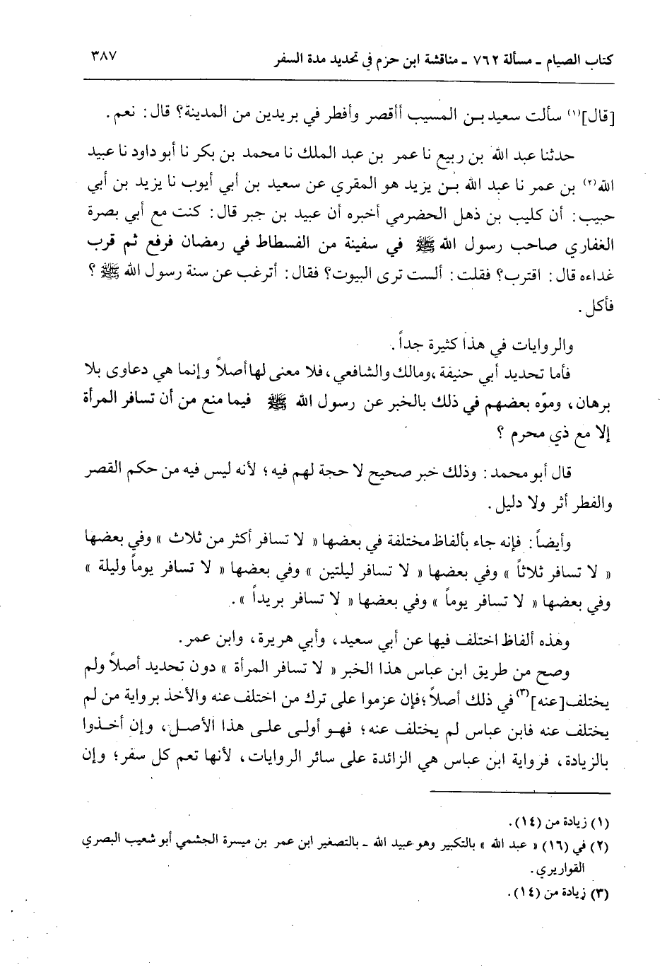 وَهَذِهِ أَلْفَاظٌ اُخْتُلِفَ فِيهَا عَنْ أَبِي سَعِيدٍ، وَأَبِي هُرَيْرَةَ، وَابْنِ عُمَرَ. وَصَحَّ مِنْ طَرِيقِ ابْنِ عَبَّاسٍ هَذَا الْخَبَرُ «لَا تُسَافِرُ الْمَرْأَةُ» دُونَ تَحْدِيدٍ أَصْلًا وَلَمْ يُخْتَلَفْ [عَنْهُ] فِي ذَلِكَ أَصْلًا