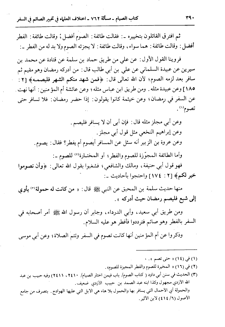 ثُمَّ افْتَرَقَ الْقَائِلُونَ بِتَخْيِيرِهِ -: فَقَالَتْ طَائِفَةٌ: الصَّوْمُ أَفْضَلُ، وَقَالَتْ طَائِفَةٌ: الْفِطْرُ أَفْضَلُ: وَقَالَتْ طَائِفَةٌ: هُمَا سَوَاءٌ، وَقَالَتْ طَائِفَةٌ: لَا يُجْزِئْهُ الصَّوْمُ وَلَا بُدَّ لَهُ مِنْ الْفِطْرِ -: فَرُوِّينَا الْقَوْلَ الْأَوَّلَ: عَنْ عَلِيٍّ مِنْ طَرِيقِ حَمَّادِ بْنِ سَلَمَةَ عَنْ قَتَادَةَ عَنْ مُحَمَّدِ بْنِ سِيرِينَ عَنْ عَبِيدَةُ السَّلْمَانِيِّ عَنْ عَلِيِّ بْنِ أَبِي طَالِبٍ قَالَ: مَنْ أَدْرَكَهُ رَمَضَانُ وَهُوَ مُقِيمٌ ثُمَّ سَافَرَ بَعْدُ لَزِمَهُ الصَّوْمُ؛ لِأَنَّ اللَّهَ تَعَالَى قَالَ: {فَمَنْ شَهِدَ مِنْكُمُ الشَّهْرَ فَلْيَصُمْهُ} [البقرة: 185] وَعَنْ عَبِيدَةُ مِثْلُهُ.