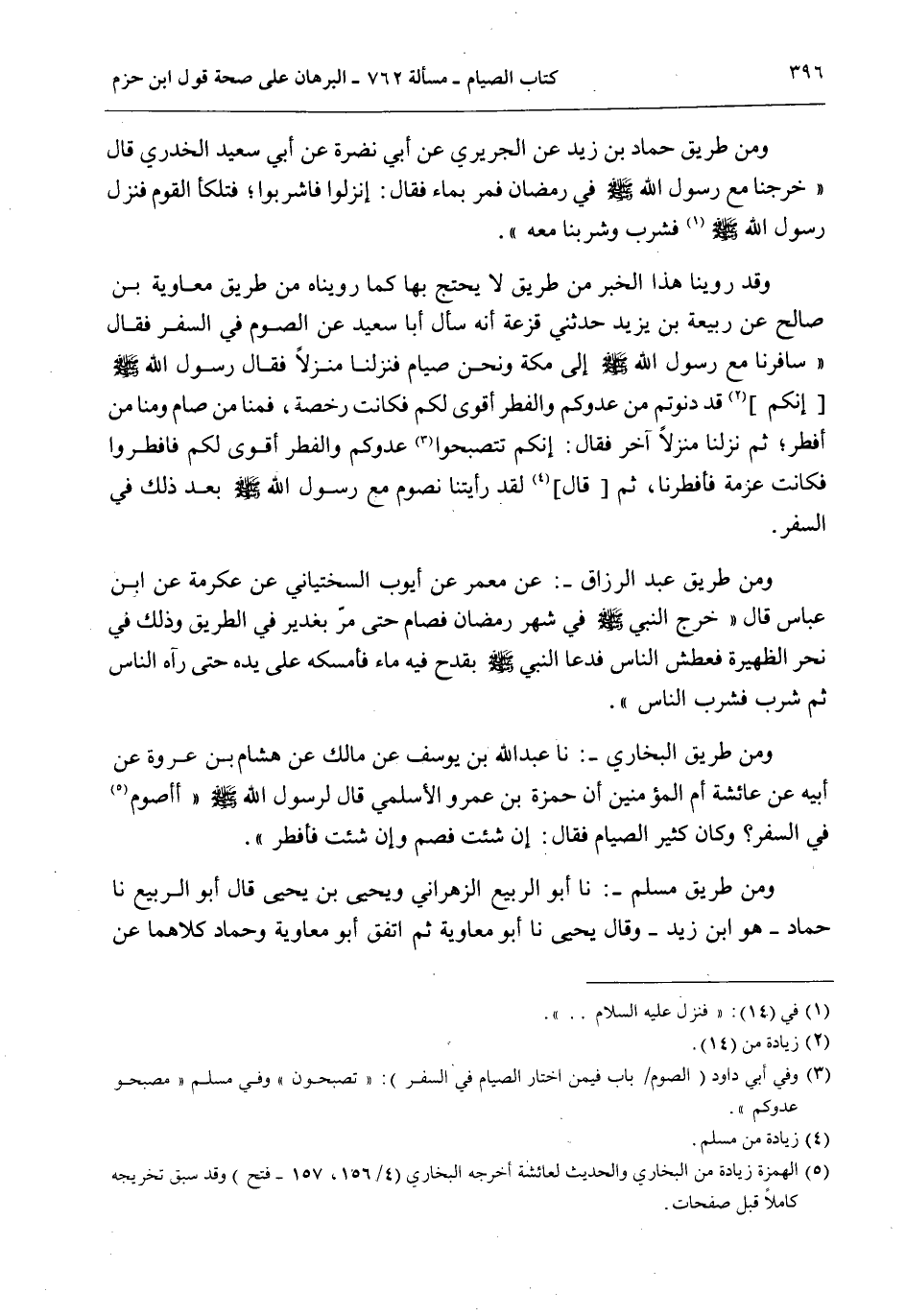 وَمِنْ طَرِيقِ حَمَّادِ بْنِ زَيْدٍ عَنْ الْجُرَيْرِيِّ عَنْ أَبِي نَضْرَةَ عَنْ أَبِي سَعِيدٍ الْخُدْرِيِّ قَالَ «خَرَجْنَا مَعَ رَسُولِ اللَّهِ - صَلَّى اللَّهُ عَلَيْهِ وَسَلَّمَ - فِي رَمَضَانَ فَمَرَّ بِمَاءٍ فَقَالَ: انْزِلُوا فَاشْرَبُوا؛ فَتَلَكَّأَ الْقَوْمُ فَنَزَلَ رَسُولُ اللَّهِ - صَلَّى اللَّهُ عَلَيْهِ وَسَلَّمَ - فَشَرِبَ وَشَرِبْنَا مَعَهُ» . وَقَدْ رُوِّينَا هَذَا الْخَبَرَ مِنْ طَرِيقٍ لَا يُحْتَجُّ بِهَا كَمَا رُوِّينَاهُ مِنْ طَرِيقِ مُعَاوِيَةَ بْنِ صَالِحٍ عَنْ رَبِيعَةَ بْنِ يَزِيدَ حَدَّثَنِي «قَزَعَةُ أَنَّهُ سَأَلَ أَبَا سَعِيدٍ عَنْ الصَّوْمِ فِي السَّفَرِ فَقَالَ سَافَرْنَا مَعَ رَسُولِ اللَّهِ - صَلَّى اللَّهُ عَلَيْهِ وَسَلَّمَ - إلَى مَكَّةَ وَنَحْنُ صِيَامٌ فَنَزَلْنَا مَنْزِلًا فَقَالَ رَسُولُ اللَّهِ - صَلَّى اللَّهُ عَلَيْهِ وَسَلَّمَ - إنَّكُمْ قَدْ دَنَوْتُمْ مِنْ عَدُوِّكُمْ وَالْفِطْرُ أَقْوَى لَكُمْ فَكَانَتْ رُخْصَةً، فَمِنَّا مَنْ صَامَ وَمِنَّا مَنْ أَفْطَرَ، ثُمَّ نَزَلْنَا مَنْزِلًا آخَرَ فَقَالَ: إنَّكُمْ تُصَبِّحُونَ عَدُوَّكُمْ وَالْفِطْرُ أَقْوَى لَكُمْ فَأَفْطِرُوا فَكَانَتْ عَزْمَةً فَأَفْطَرْنَا، ثُمَّ قَالَ لَقَدْ رَأَيْتُنَا نَصُومُ مَعَ رَسُولِ اللَّهِ - صَلَّى اللَّهُ عَلَيْهِ وَسَلَّمَ - بَعْدَ ذَلِكَ فِي السَّفَرِ.» وَمِنْ طَرِيقِ عَبْدِ الرَّزَّاقِ -: عَنْ مَعْمَرٍ عَنْ أَيُّوبَ السِّخْتِيَانِيِّ عَنْ عِكْرِمَةَ عَنْ ابْنِ عَبَّاسٍ قَالَ «خَرَجَ النَّبِيُّ - صَلَّى اللَّهُ عَلَيْهِ وَسَلَّمَ - فِي شَهْرِ رَمَضَانَ فَصَامَ حَتَّى مَرَّ بِغَدِيرٍ فِي الطَّرِيقِ وَذَلِكَ فِي نَحْرِ الظَّهِيرَةِ فَعَطِشَ النَّاسُ فَدَعَا النَّبِيُّ - صَلَّى اللَّهُ عَلَيْهِ وَسَلَّمَ - بِقَدَحٍ فِيهِ مَاءٌ فَأَمْسَكَهُ عَلَى يَدِهِ حَتَّى رَآهُ النَّاسُ ثُمَّ شَرِبَ فَشَرِبَ النَّاسُ» . وَمِنْ طَرِيقِ الْبُخَارِيِّ -: نا عَبْدُ اللَّهِ بْنُ يُوسُفَ عَنْ مَالِكٍ عَنْ هِشَامِ بْنِ عُرْوَةَ عَنْ أَبِيهِ عَنْ عَائِشَةَ أُمِّ الْمُؤْمِنِينَ «أَنَّ حَمْزَةَ بْنِ عَمْرٍو الْأَسْلَمِيِّ قَالَ لِرَسُولِ اللَّهِ - صَلَّى اللَّهُ عَلَيْهِ وَسَلَّمَ - أَأَصُومُ فِي السَّفَرِ؟ وَكَانَ كَثِيرَ الصِّيَامِ فَقَالَ: إنْ شِئْتَ فَصُمْ وَإِنْ شِئْتَ فَأَفْطِرْ» .