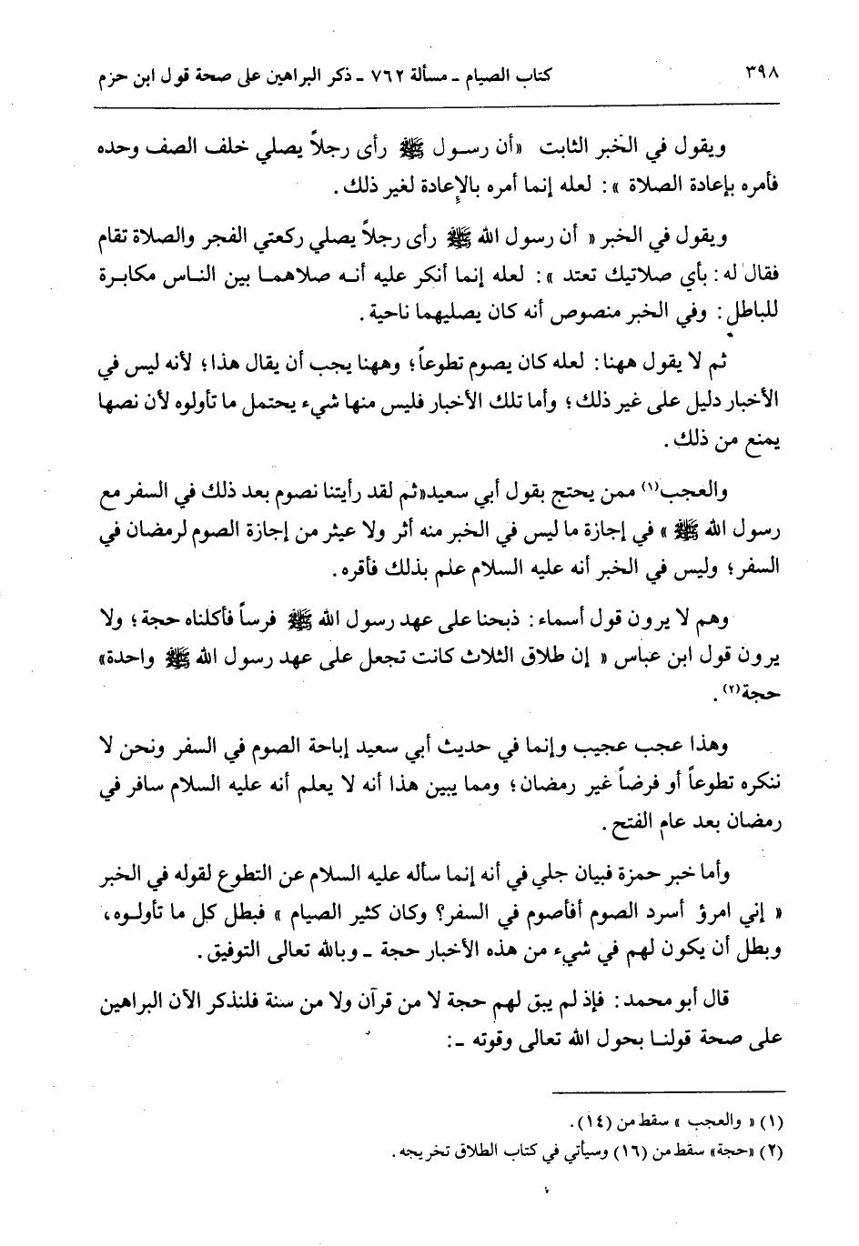 وَيَقُولُ فِي الْخَبَرِ الثَّابِتِ «أَنَّ رَسُولَ اللَّهِ - صَلَّى اللَّهُ عَلَيْهِ وَسَلَّمَ - رَأَى رَجُلًا يُصَلِّي خَلْفَ الصَّفِّ وَحْدَهُ فَأَمَرَهُ بِإِعَادَةِ الصَّلَاةِ» : لَعَلَّهُ إنَّمَا أَمَرَهُ بِالْإِعَادَةِ لِغَيْرِ ذَلِكَ. وَيَقُولُ فِي الْخَبَرِ «أَنَّ رَسُولَ اللَّهِ - صَلَّى اللَّهُ عَلَيْهِ وَسَلَّمَ - رَأَى رَجُلًا يُصَلِّي رَكْعَتَيْ الْفَجْرِ وَالصَّلَاةُ تُقَامُ فَقَالَ لَهُ: بِأَيِّ صَلَاتَيْكَ تَعْتَدُّ» : لَعَلَّهُ إنَّمَا أَنْكَرَ عَلَيْهِ أَنَّهُ صَلَّاهُمَا بَيْنَ النَّاسِ مُكَابَرَةً لِلْبَاطِلِ: وَفِي الْخَبَرِ مَنْصُوصٌ أَنَّهُ كَانَ يُصَلِّيهِمَا نَاحِيَةً. ثُمَّ لَا يَقُولُ هَاهُنَا: لَعَلَّهُ كَانَ يَصُومُ تَطَوُّعًا؛ وَهَاهُنَا يَجِبُ أَنْ يُقَالَ هَذَا؛ لِأَنَّهُ لَيْسَ فِي الْأَخْبَارِ دَلِيلٌ عَلَى غَيْرِ ذَلِكَ؛ وَأَمَّا تِلْكَ الْأَخْبَارُ فَلَيْسَ مِنْهَا شَيْءٌ يَحْتَمِلُ مَا تَأَوَّلُوهُ لِأَنَّ نَصَّهَا يَمْنَعُ مِنْ ذَلِكَ. وَالْعَجَبُ مِمَّنْ يَحْتَجُّ «بِقَوْلِ أَبِي سَعِيدٍ ثُمَّ لَقَدْ رَأَيْتُنَا نَصُومُ بَعْدَ ذَلِكَ فِي السَّفَرِ مَعَ رَسُولِ اللَّهِ - صَلَّى اللَّهُ عَلَيْهِ وَسَلَّمَ -» فِي إجَازَةِ مَا لَيْسَ فِي الْخَبَرِ مِنْهُ أَثَرٌ وَلَا عَثْرٌ مِنْ إجَازَةِ الصَّوْمِ لِرَمَضَانَ فِي السَّفَرِ؛ وَلَيْسَ فِي الْخَبَرِ أَنَّهُ - عَلَيْهِ السَّلَامُ - عَلِمَ بِذَلِكَ فَأَقَرَّهُ. وَهُمْ لَا يَرَوْنَ «قَوْلَ أَسْمَاءَ: ذَبَحْنَا عَلَى عَهْدِ رَسُولِ اللَّهِ - صَلَّى اللَّهُ عَلَيْهِ وَسَلَّمَ - فَرَسًا فَأَكَلْنَاهُ» حُجَّةً، وَلَا يَرَوْنَ قَوْلَ ابْنِ عَبَّاسٍ «إنَّ طَلَاقَ الثَّلَاثِ كَانَتْ تُجْعَلُ عَلَى عَهْدِ رَسُولِ اللَّهِ - صَلَّى اللَّهُ عَلَيْهِ وَسَلَّمَ - وَاحِدَةً» حُجَّةً. وَهَذَا عَجَبٌ عَجِيبٌ وَإِنَّمَا فِي حَدِيثِ أَبِي سَعِيدٍ إبَاحَةُ الصَّوْمِ فِي السَّفَرِ وَنَحْنُ لَا نُنْكِرُهُ تَطَوُّعًا أَوْ فَرْضًا غَيْرَ رَمَضَانَ؛ وَمِمَّا يُبَيِّنُ هَذَا أَنَّهُ لَا يُعْلَمُ أَنَّهُ - عَلَيْهِ السَّلَامُ - سَافَرَ فِي رَمَضَانَ بَعْدَ عَامِ الْفَتْحِ. وَأَمَّا خَبَرُ حَمْزَةَ فَبَيَانٌ جَلِيٌّ فِي أَنَّهُ إنَّمَا سَأَلَهُ - عَلَيْهِ السَّلَامُ - عَنْ التَّطَوُّعِ لِقَوْلِهِ فِي الْخَبَرِ «إنِّي امْرُؤٌ أَسْرُدُ الصَّوْمَ أَفَأَصُومُ فِي السَّفَرِ» ؟ وَكَانَ كَثِيرَ الصِّيَامِ فَبَطَلَ كُلُّ مَا تَأَوَّلُوهُ، وَبَطَلَ أَنْ يَكُونَ لَهُمْ فِي شَيْءٍ مِنْ هَذِهِ الْأَخْبَارِ حُجَّةٌ - وَبِاَللَّهِ تَعَالَى التَّوْفِيقُ. قَالَ أَبُو مُحَمَّدٍ: فَإِذْ لَمْ يَبْقَ لَهُمْ حُجَّةٌ لَا مِنْ قُرْآنٍ وَلَا مِنْ سُنَّةٍ فَلِنَذْكُرَ الْآنَ الْبَرَاهِينَ عَلَى صِحَّةِ قَوْلِنَا بِحَوْلِ اللَّهِ تَعَالَى وَقُوَّتِهِ -: