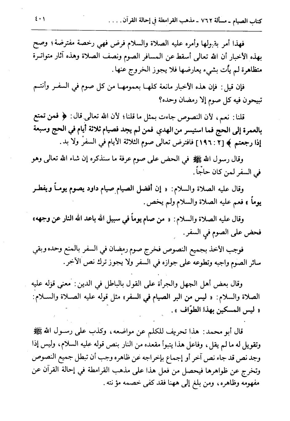 فَهَذَا أَمْرٌ بِقَبُولِهَا وَأَمْرُهُ - عَلَيْهِ الصَّلَاةُ وَالسَّلَامُ - فَرْضٌ فَهِيَ رُخْصَةٌ مُفْتَرَضَةٌ؛ وَصَحَّ بِهَذِهِ الْأَخْبَارِ أَنَّ اللَّهَ تَعَالَى أَسْقَطَ عَنْ الْمُسَافِرِ الصَّوْمَ وَنِصْفَ الصَّلَاةِ وَهَذِهِ آثَارٌ مُتَوَاتِرَةٌ مُتَظَاهِرَةٌ لَمْ يَأْتِ شَيْءٌ يُعَارِضُهَا فَلَا يَجُوزُ الْخُرُوجُ عَنْهَا. فَإِنْ قِيلَ: فَإِنَّ هَذِهِ الْأَخْبَارَ مَانِعَةٌ كُلُّهَا بِعُمُومِهَا مِنْ كُلِّ صَوْمٍ فِي السَّفَرِ وَأَنْتُمْ تُبِيحُونَ فِيهِ كُلَّ صَوْمٍ إلَّا رَمَضَانَ وَحْدَهُ؟ قُلْنَا: نَعَمْ، لِأَنَّ النُّصُوصَ جَاءَتْ بِمِثْلِ مَا قُلْنَا؛ لِأَنَّ اللَّهَ تَعَالَى قَالَ: {فَمَنْ تَمَتَّعَ بِالْعُمْرَةِ إِلَى الْحَجِّ فَمَا اسْتَيْسَرَ مِنَ الْهَدْيِ فَمَنْ لَمْ يَجِدْ فَصِيَامُ ثَلاثَةِ أَيَّامٍ فِي الْحَجِّ وَسَبْعَةٍ إِذَا رَجَعْتُمْ} [البقرة: 196] فَافْتَرَضَ تَعَالَى صَوْمَ الثَّلَاثَةِ الْأَيَّامِ فِي السَّفَرِ وَلَا بُدَّ. وَقَالَ رَسُولُ اللَّهِ - صَلَّى اللَّهُ عَلَيْهِ وَسَلَّمَ - فِي الْحَضِّ عَلَى صَوْمِ عَرَفَةَ مَا سَنَذْكُرُهُ إنْ شَاءَ اللَّهُ تَعَالَى وَهُوَ فِي السَّفَرِ لِمَنْ كَانَ حَاجًّا. وَقَالَ - عَلَيْهِ الصَّلَاةُ وَالسَّلَامُ -: «إنَّ أَفْضَلَ الصِّيَامِ صِيَامُ دَاوُد يَصُومُ يَوْمًا وَيُفْطِرُ يَوْمًا» فَعَمَّ - عَلَيْهِ الصَّلَاةُ وَالسَّلَامُ - وَلَمْ يَخُصَّ. وَقَالَ - عَلَيْهِ الصَّلَاةُ وَالسَّلَامُ -: «مَنْ صَامَ يَوْمًا فِي سَبِيلِ اللَّهِ بَاعَدَ اللَّهُ النَّارَ عَنْ وَجْهِهِ» فَحَضَّ عَلَى الصَّوْمِ فِي السَّفَرِ. فَوَجَبَ الْأَخْذُ بِجَمِيعِ النُّصُوصِ فَخَرَجَ صَوْمُ رَمَضَانَ فِي السَّفَرِ بِالْمَنْعِ وَحْدَهُ وَبَقِيَ سَائِرُ الصَّوْمِ وَاجِبُهُ وَتَطَوُّعُهُ عَلَى جَوَازِهِ فِي السَّفَرِ وَلَا يَجُوزُ تَرْكُ نَصٍّ لِآخَرَ. وَقَالَ بَعْضُ أَهْلِ الْجَهْلِ وَالْجُرْأَةِ عَلَى الْقَوْلِ بِالْبَاطِلِ فِي الدِّينِ: مَعْنَى قَوْلِهِ - عَلَيْهِ الصَّلَاةُ وَالسَّلَامُ -: «لَيْسَ مِنْ الْبِرِّ الصِّيَامُ فِي السَّفَرِ» مِثْلُ قَوْلِهِ - عَلَيْهِ الصَّلَاةُ وَالسَّلَامُ -: «لَيْسَ الْمِسْكِينُ بِهَذَا الطَّوَّافِ» . قَالَ أَبُو مُحَمَّدٍ: هَذَا تَحْرِيفٌ لِلْكَلِمِ عَنْ مَوَاضِعِهِ، وَكَذِبٌ عَلَى رَسُولِ اللَّهِ - صَلَّى اللَّهُ عَلَيْهِ وَسَلَّمَ - وَتَقْوِيلٌ لَهُ مَا لَمْ يَقُلْ، وَفَاعِلُ هَذَا يَتَبَوَّأُ مَقْعَدَهُ مِنْ النَّارِ بِنَصِّ قَوْلِهِ - عَلَيْهِ السَّلَامُ -، وَلَيْسَ إذَا وُجِدَ نَصٌّ قَدْ جَاءَ نَصٌّ آخَرُ أَوْ إجْمَاعٌ بِإِخْرَاجِهِ عَنْ ظَاهِرِهِ وَجَبَ أَنْ تَبْطُلَ جَمِيعُ النُّصُوصِ وَتَخْرُجَ عَنْ ظَوَاهِرِهَا فَيَحْصُلُ مِنْ فِعْلِ هَذَا عَلَى مَذْهَبِ الْقَرَامِطَةِ فِي إحَالَةِ الْقُرْآنِ عَنْ مَفْهُومِهِ وَظَاهِرِهِ، وَمَنْ بَلَغَ إلَى هَاهُنَا فَقَدْ كَفَى خَصْمَهُ مُؤْنَتَهُ.