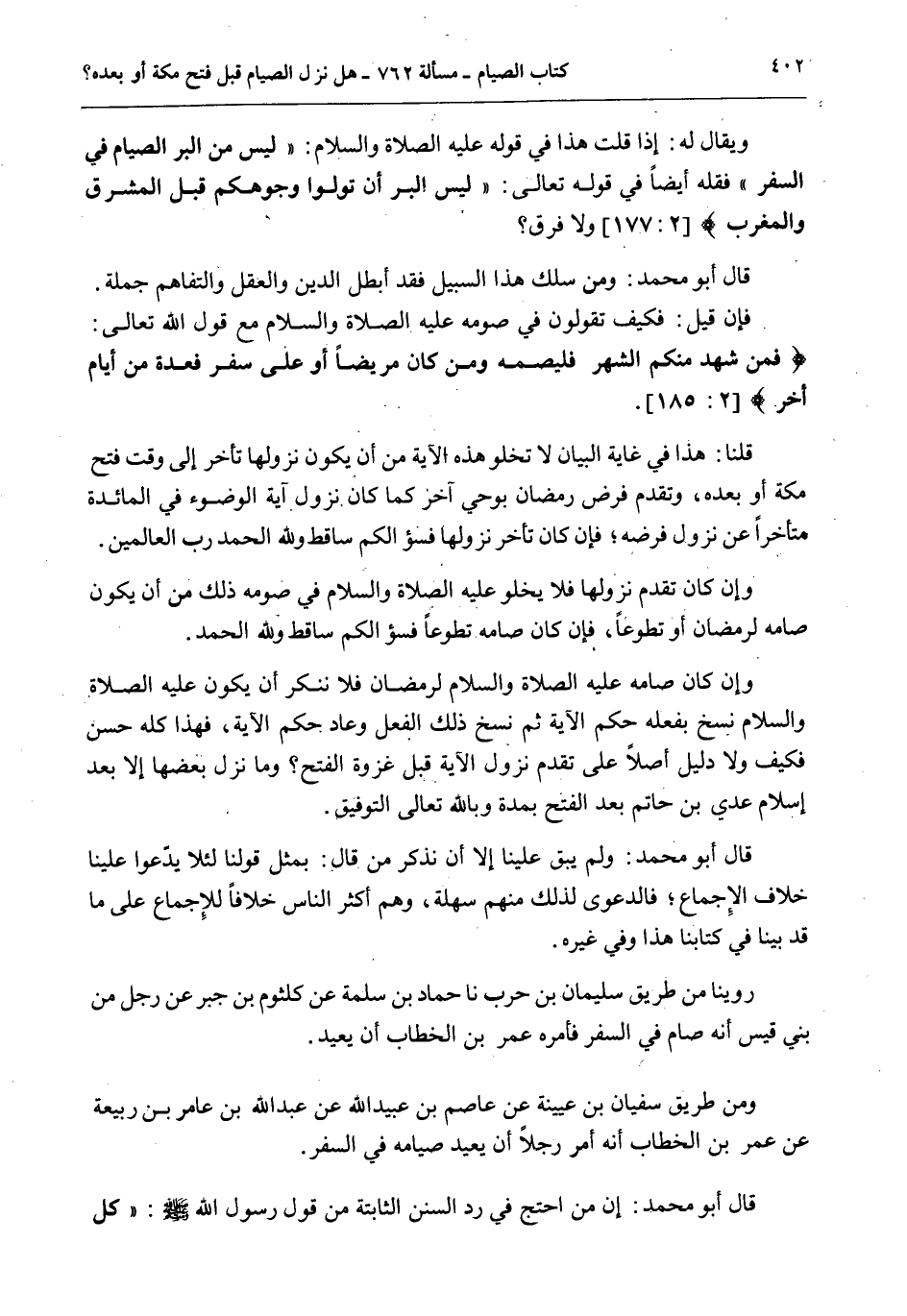 وَيُقَالُ لَهُ: إذَا قُلْت هَذَا فِي قَوْلِهِ - عَلَيْهِ الصَّلَاةُ وَالسَّلَامُ -: «لَيْسَ مِنْ الْبِرِّ الصِّيَامُ فِي السَّفَرِ» فَقُلْهُ أَيْضًا فِي قَوْله تَعَالَى: {لَيْسَ الْبِرَّ أَنْ تُوَلُّوا وُجُوهَكُمْ قِبَلَ الْمَشْرِقِ وَالْمَغْرِبِ} [البقرة: 177] وَلَا فَرْقَ؟ قَالَ أَبُو مُحَمَّدٍ: وَمَنْ سَلَكَ هَذَا السَّبِيلَ فَقَدْ أَبْطَلَ الدِّينَ وَالْعَقْلَ وَالتَّفَاهُمَ جُمْلَةً. فَإِنْ قِيلَ: فَكَيْف تَقُولُونَ فِي صَوْمِهِ - عَلَيْهِ الصَّلَاةُ وَالسَّلَامُ - مَعَ قَوْلِ اللَّهِ تَعَالَى: {فَمَنْ شَهِدَ مِنْكُمُ الشَّهْرَ فَلْيَصُمْهُ وَمَنْ كَانَ مَرِيضًا أَوْ عَلَى سَفَرٍ فَعِدَّةٌ مِنْ أَيَّامٍ أُخَرَ} [البقرة: 185] . قُلْنَا: هَذَا فِي غَايَةِ الْبَيَانِ لَا تَخْلُو هَذِهِ الْآيَةُ مِنْ أَنْ يَكُونَ نُزُولُهَا تَأَخَّرَ إلَى وَقْتِ فَتْحِ مَكَّةَ أَوْ بَعْدَهُ، وَتَقَدَّمَ فَرْضُ رَمَضَانَ بِوَحْيٍ آخَرَ كَمَا كَانَ نُزُولُ آيَةِ الْوُضُوءِ فِي الْمَائِدَةِ مُتَأَخِّرًا عَنْ نُزُولِ فَرْضِهِ؛ فَإِنْ كَانَ تَأَخَّرَ نُزُولُهَا فَسُؤَالُكُمْ سَاقِطٌ وَلِلَّهِ الْحَمْدُ رَبُّ الْعَالَمِينَ. وَإِنْ كَانَ تَقَدَّمَ نُزُولُهَا فَلَا يَخْلُو - عَلَيْهِ الصَّلَاةُ وَالسَّلَامُ - فِي صَوْمِهِ ذَلِكَ مِنْ أَنْ يَكُونَ صَامَهُ لِرَمَضَانَ أَوْ تَطَوُّعًا، فَإِنْ كَانَ صَامَهُ تَطَوُّعًا فَسُؤَالُكُمْ سَاقِطٌ وَلِلَّهِ الْحَمْدُ. وَإِنْ كَانَ صَامَهُ - عَلَيْهِ الصَّلَاةُ وَالسَّلَامُ - لِرَمَضَانَ فَلَا نُنْكِرُ أَنْ يَكُونَ - عَلَيْهِ الصَّلَاةُ وَالسَّلَامُ - نَسَخَ بِفِعْلِهِ حُكْمَ الْآيَةِ ثُمَّ نَسَخَ ذَلِكَ الْفِعْلَ وَعَادَ حُكْمُ الْآيَةِ، فَهَذَا كُلُّهُ حَسَنٌ فَكَيْف وَلَا دَلِيلَ أَصْلًا عَلَى تَقَدُّمِ نُزُولِ الْآيَةِ قَبْلَ غَزْوَةِ الْفَتْحِ؟ وَمَا نَزَلَ بَعْضُهَا إلَّا بَعْدَ إسْلَامِ عَدِيِّ بْنِ حَاتِمٍ بَعْدَ الْفَتْحِ بِمُدَّةٍ وَبِاَللَّهِ تَعَالَى التَّوْفِيقُ. قَالَ أَبُو مُحَمَّدٍ: وَلَمْ يَبْقَ عَلَيْنَا إلَّا أَنْ نَذْكُرَ مَنْ قَالَ: بِمِثْلِ قَوْلِنَا لِئَلَّا يَدَّعُوا عَلَيْنَا خِلَافَ الْإِجْمَاعِ؛ فَالدَّعْوَى لِذَلِكَ مِنْهُمْ سَهْلَةٌ، وَهُمْ أَكْثَرُ النَّاسِ خِلَافًا لِلْإِجْمَاعِ عَلَى مَا قَدْ بَيَّنَّا فِي كِتَابِنَا هَذَا وَفِي غَيْرِهِ. رُوِّينَا مِنْ طَرِيقِ سُلَيْمَانَ بْنِ حَرْبٍ نا حَمَّادُ بْنُ سَلَمَةَ عَنْ كُلْثُومِ بْنِ جَبْرٍ عَنْ رَجُلٍ مِنْ بَنِي قَيْسٍ أَنَّهُ صَامَ فِي السَّفَرِ فَأَمَرَهُ عُمَرُ بْنُ الْخَطَّابِ أَنْ يُعِيدَ. وَمِنْ طَرِيقِ سُفْيَانَ بْنِ عُيَيْنَةَ عَنْ عَاصِمِ بْنِ عُبَيْدِ اللَّهِ عَنْ عَبْدِ اللَّهِ بْنِ عَامِرِ بْنِ رَبِيعَةَ عَنْ عُمَرَ بْنِ الْخَطَّابِ أَنَّهُ أَمَرَ رَجُلًا أَنْ يُعِيدَ صِيَامَهُ فِي السَّفَرِ. قَالَ أَبُو مُحَمَّدٍ: إنَّ مَنْ احْتَجَّ فِي رَدِّ السُّنَنِ الثَّابِتَةِ مِنْ قَوْلِ رَسُولِ اللَّهِ - صَلَّى اللَّهُ عَلَيْهِ وَسَلَّمَ -: «كُلُّ